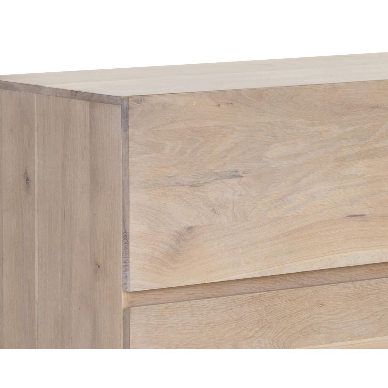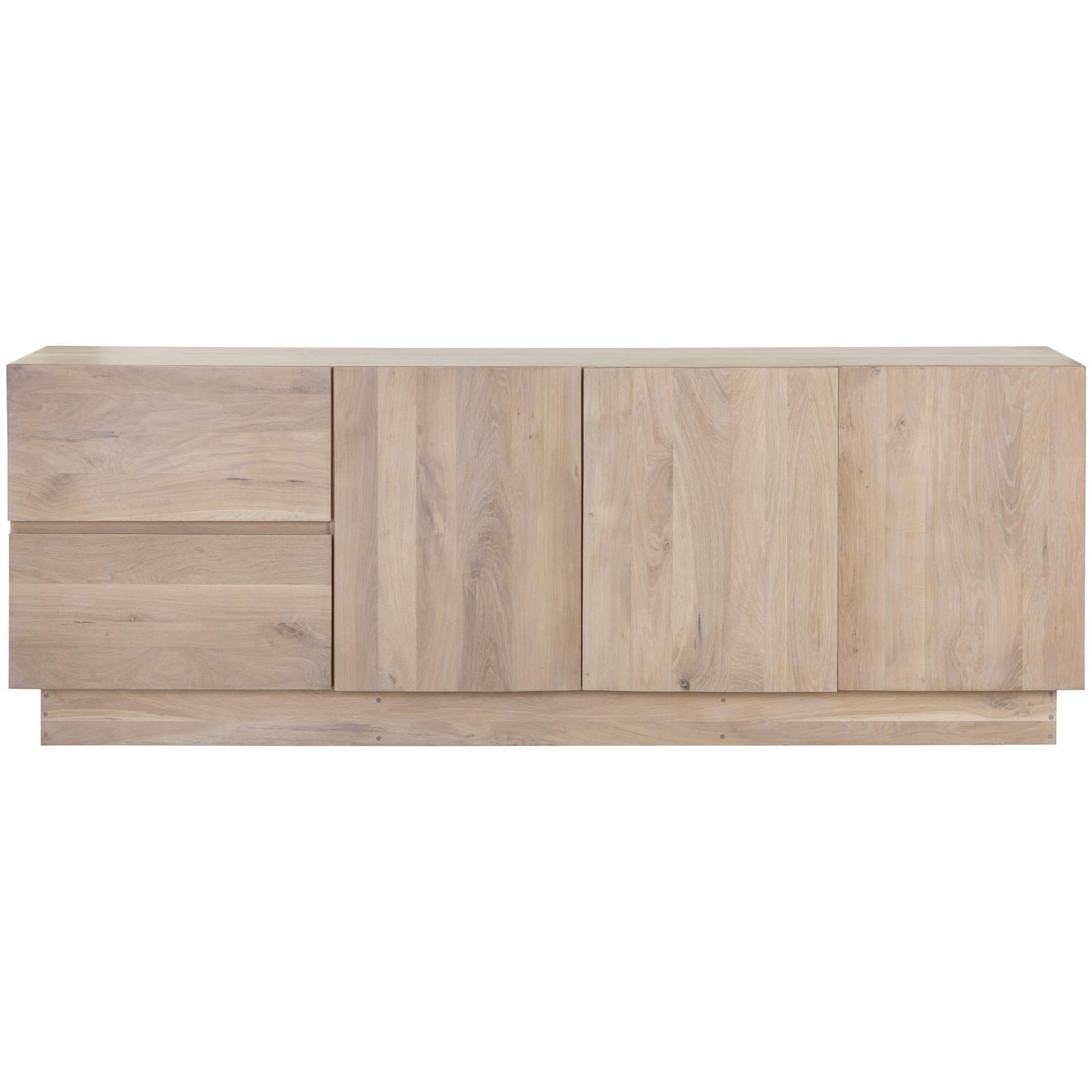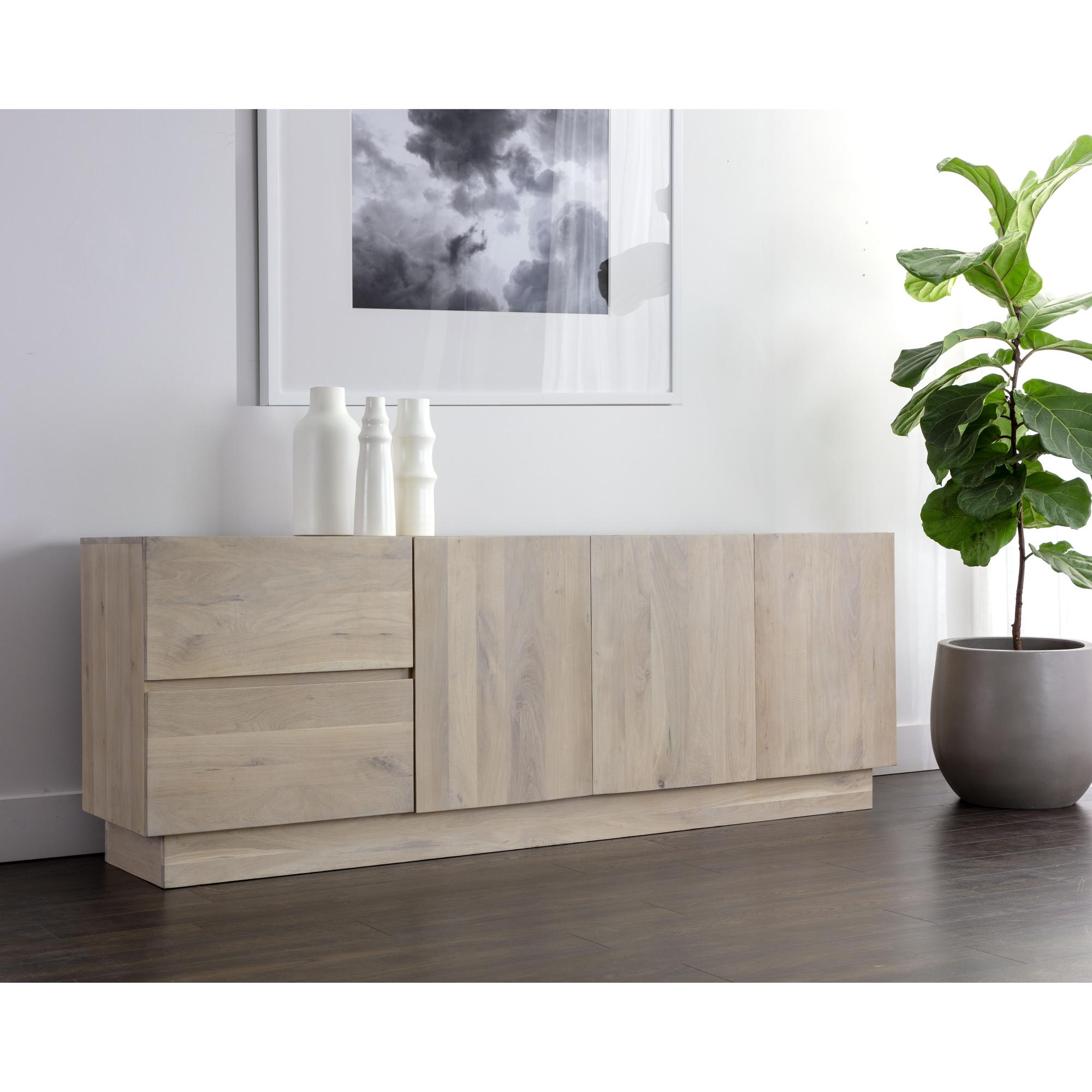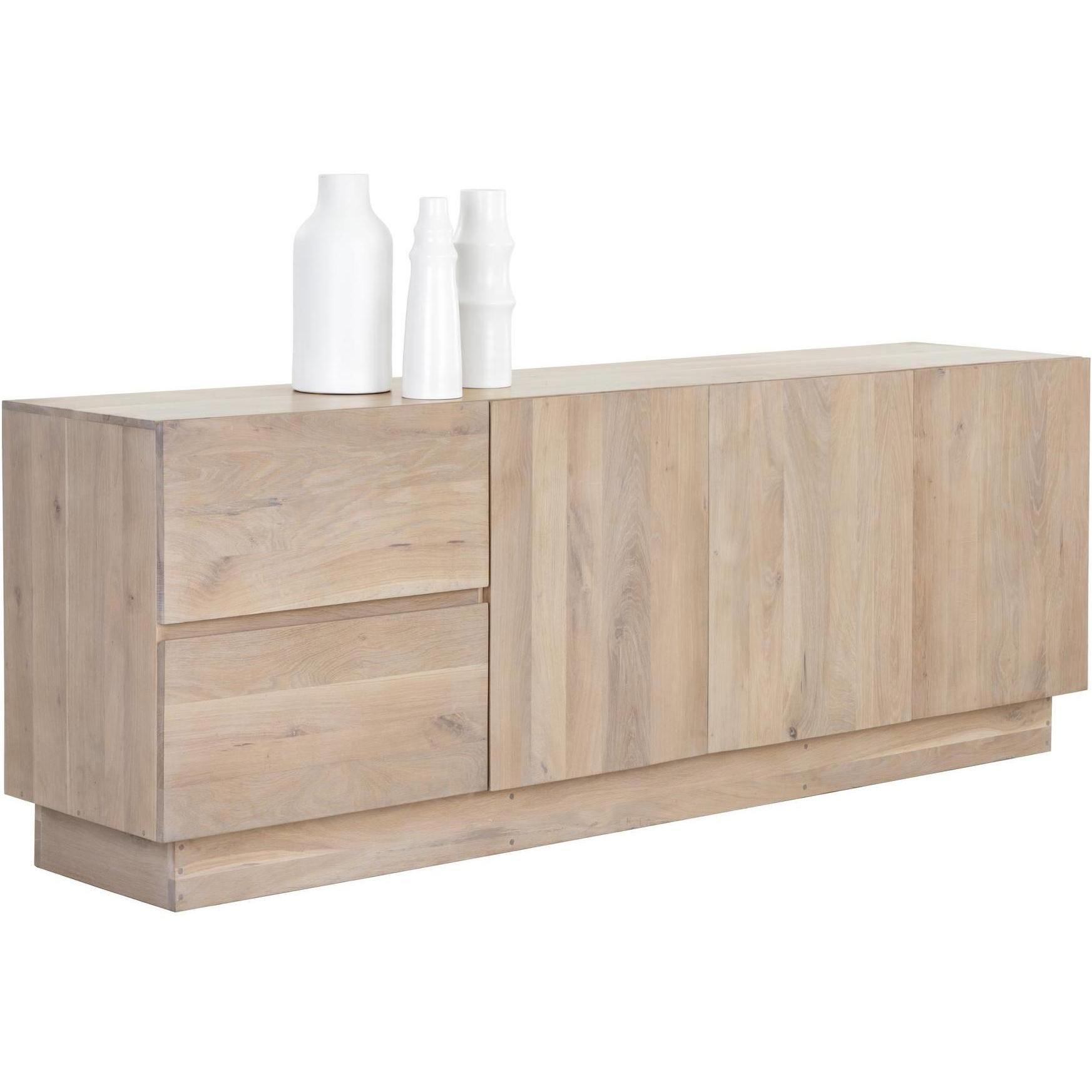 This Scandinavian-style sideboard is a tasteful addition to any dining space. Made from natural solid oak wood with a whitewash finish. Features two drawers and three cabinets for ample storage. As wood is an organic, porous material, these pieces will contain natural variation of texture and may also exhibit fine indentations and cracks. Wood pieces will also display a disparity of colour and grain, and visible knots and burls that add to the character of each piece. Made in India. With refined craftsmanship, this design was brought to life by skilled local artisans. Due to the nature of handcraftsmanship, unique imperfections such as fissures, markings and variations in colour and shape are welcomed and appreciated characteristics for a truly one-of-a-kind piece.