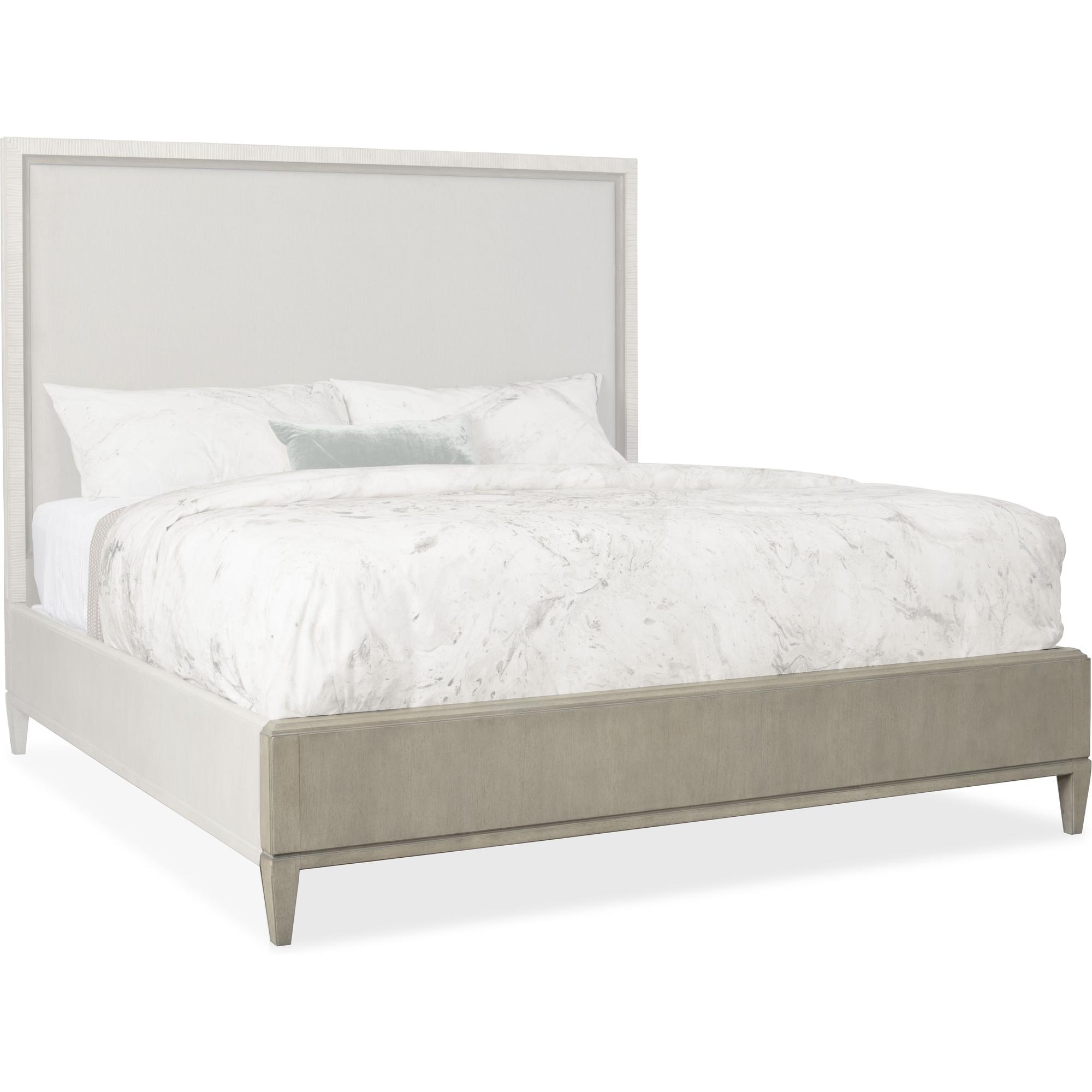 Finish: A serene gray beige finish applied to lightly sand-blasted walnut veneer for an organic and textured look. Champagne silver finish on the metal elements and hardware. Custom-designed knob hardware in a champagne silver finish. Distressing includes wire brushing.