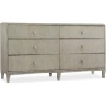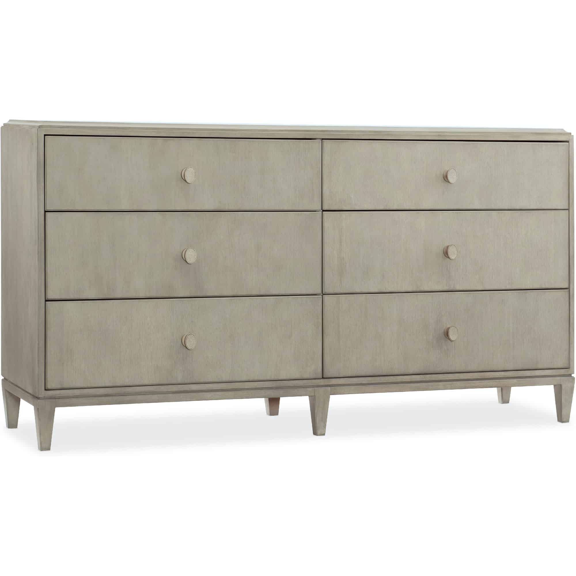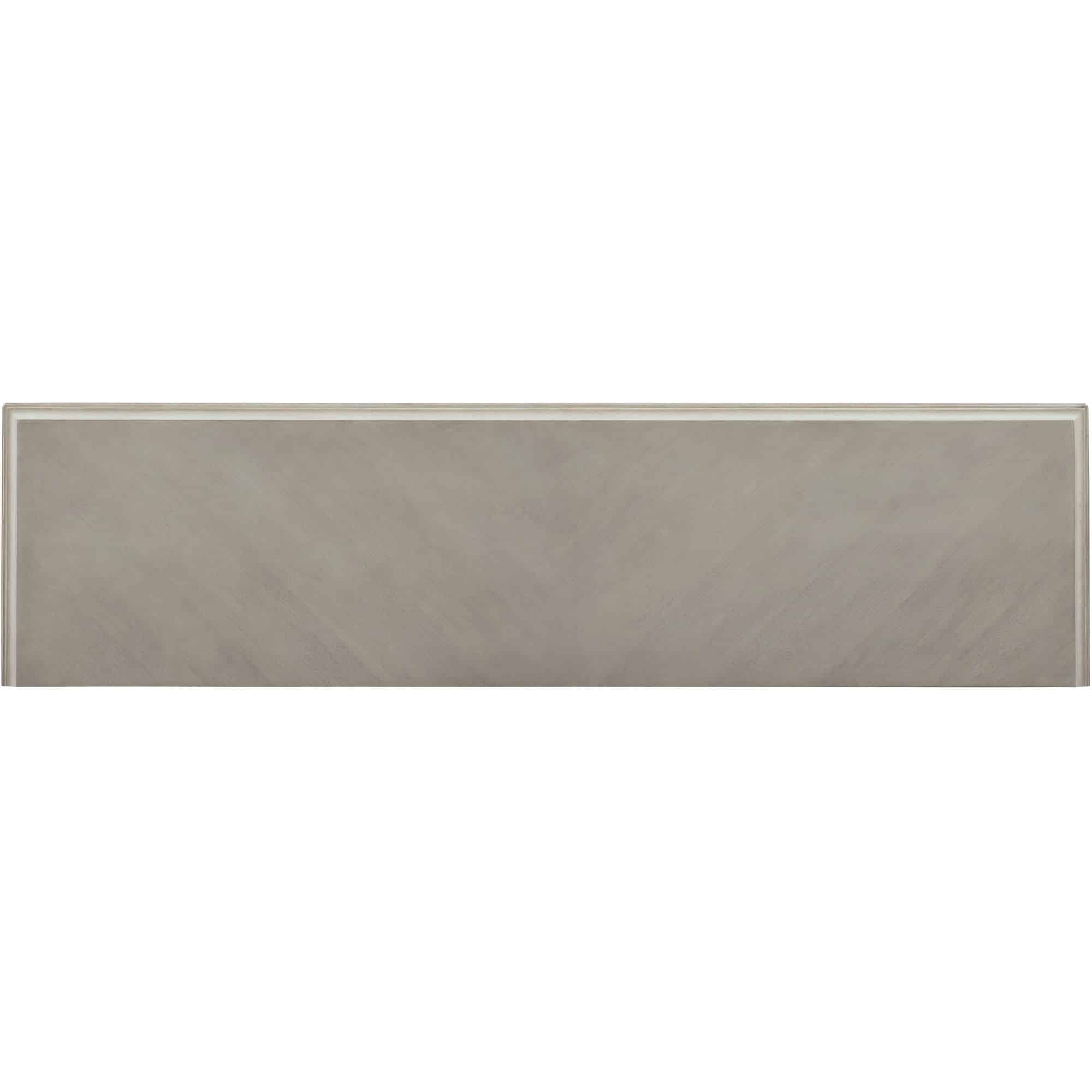 Finish: A serene gray beige finish applied to lightly sand-blasted walnut veneer for an organic and textured look. Champagne silver finish on the metal elements and hardware. Custom-designed knob hardware in a champagne silver finish. Distressing includes wire brushing.