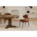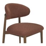 The Ellie dining chair features a padded winged backrest, a refined invitation to gather. A robust rubberwood frame bathed in a dark espresso brown finish harmonizes with the rustic, rust, easy-to-clean performance fabric upholstery, adding a vintage charm with modern convenience–a versatile design that complements a myriad of interior styles.