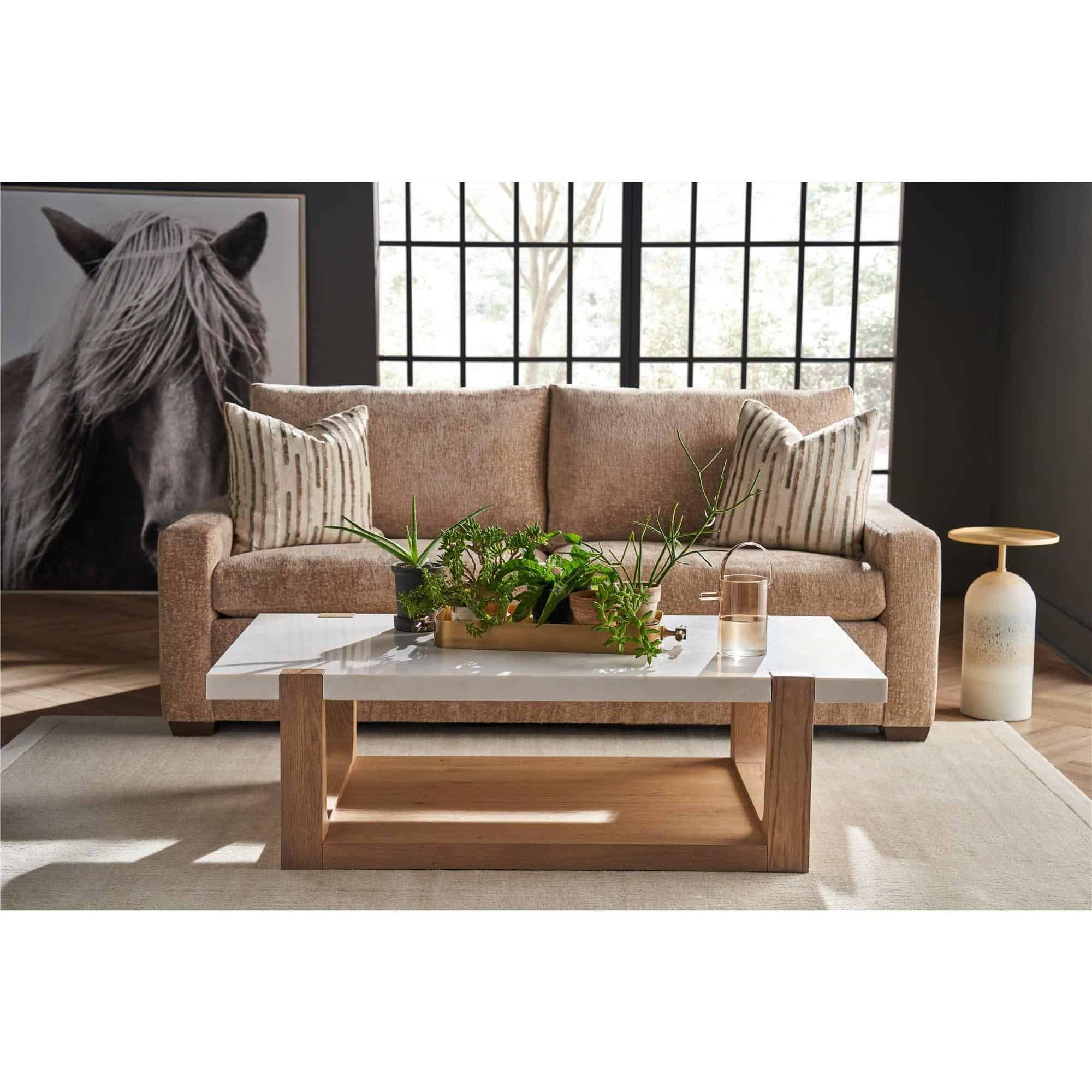 The Ellis Cocktail Table captures attention with its organic, two-tonal design, pairing a Natural Oak base with a honed White Quartz top. This combination makes a fresh and elegant statement, anchoring modern spaces with a piece that merges the raw beauty of nature with a touch of refined elegance.