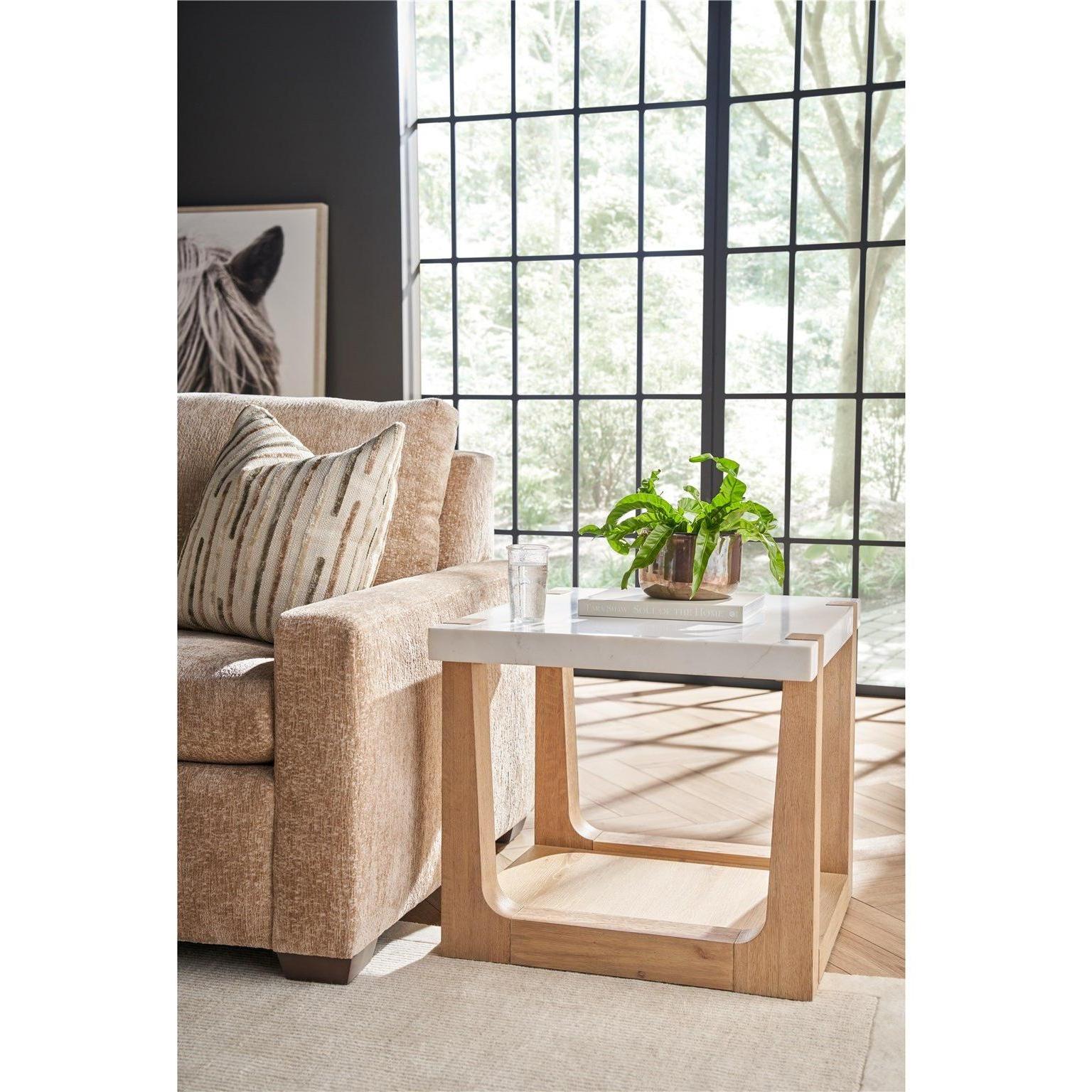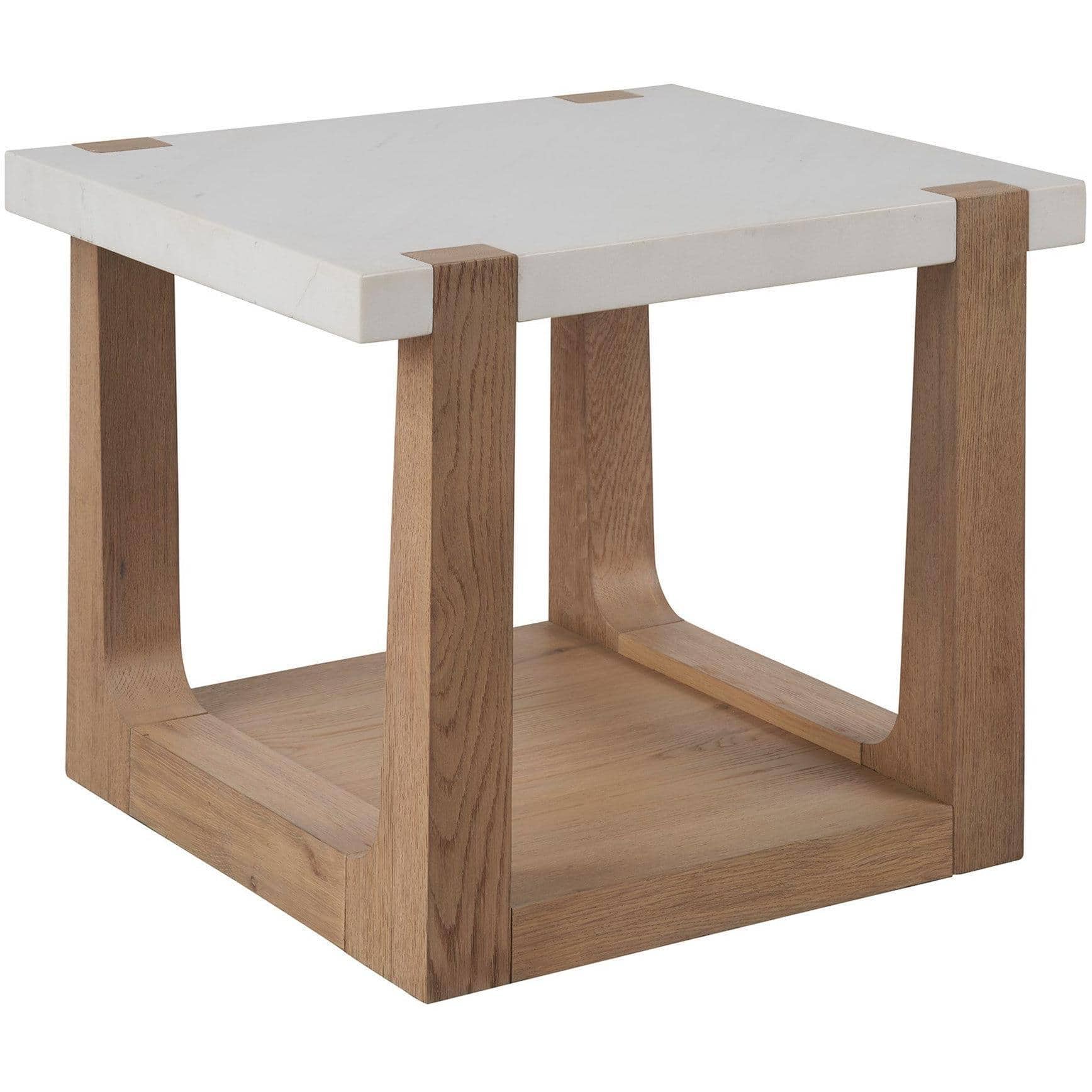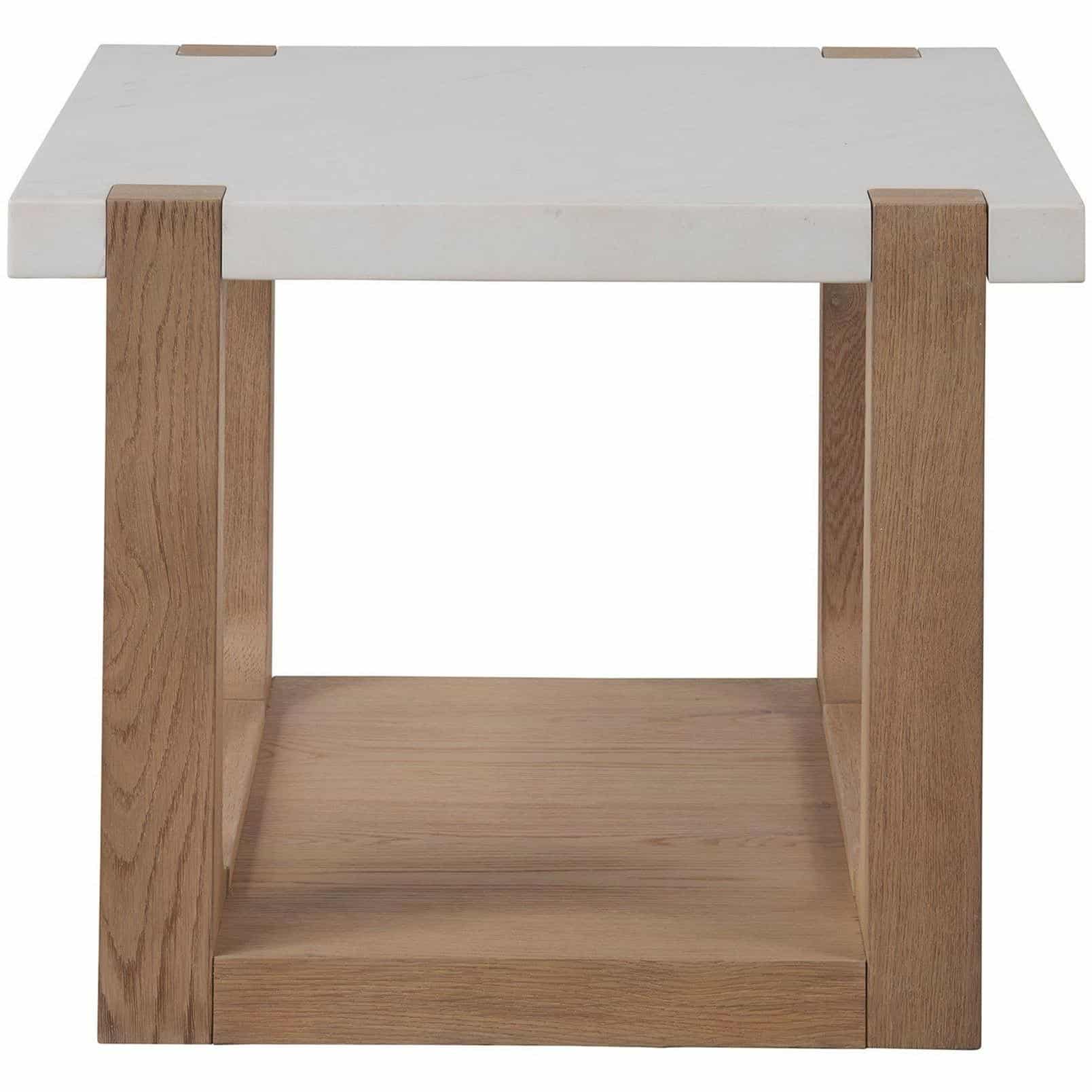 The Ellis End Table combines the organic charm of a natural oak base with the refined elegance of a honed white quartz top. This piece is elegantly designed with open-air shelving below, offering both functionality and a sophisticated aesthetic, perfect for complementing any living space with a touch of natural beauty and practical elegance.