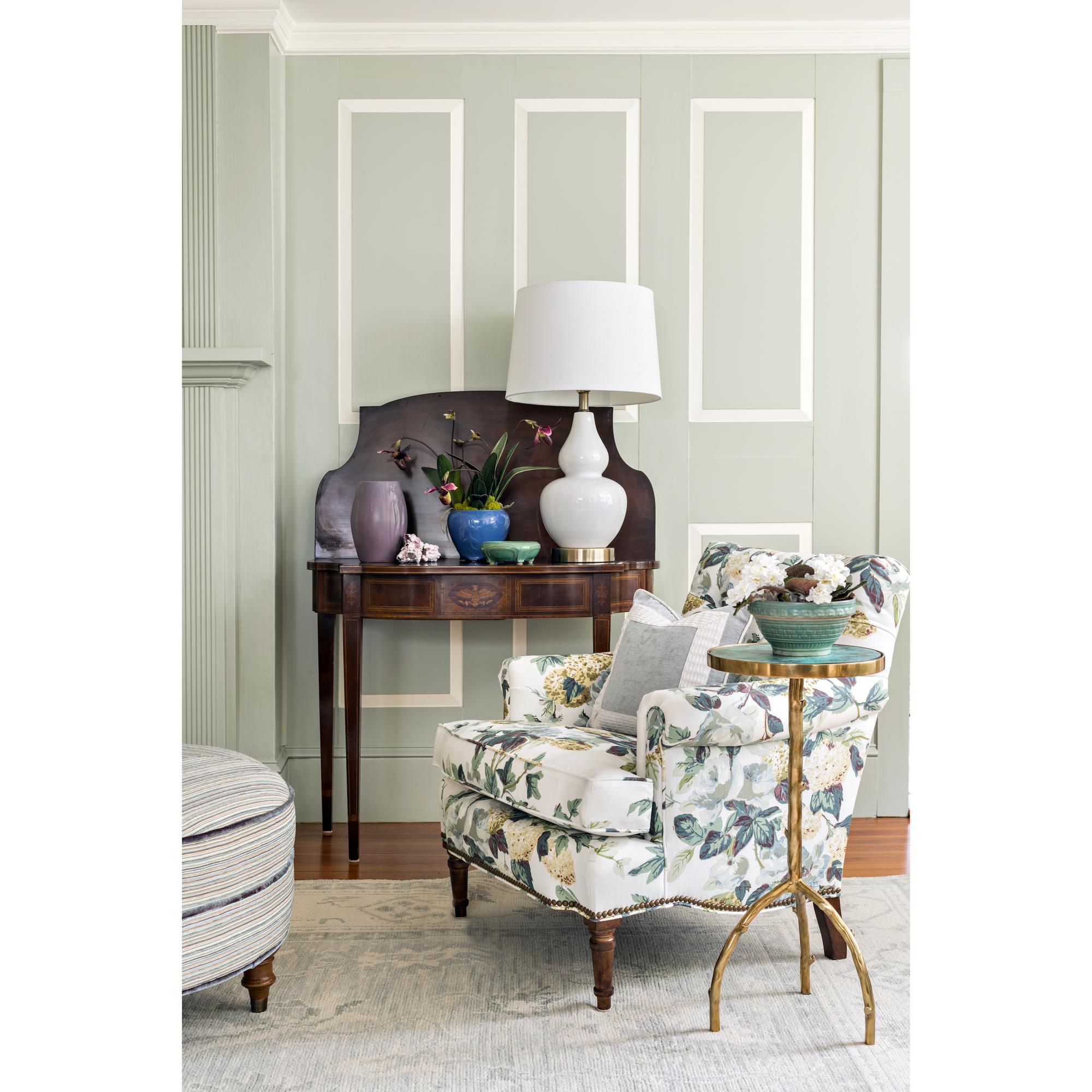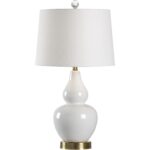 Ellis lamp features a classic, white ceramic, gourd shaped body with an antique brass mounting. For the electronic lover, its base contains a USB port ideal for a home office or bedroom. An acrylic ball finial secures a crisp white linen shade as it diffuses ample lighting throughout your decor.
