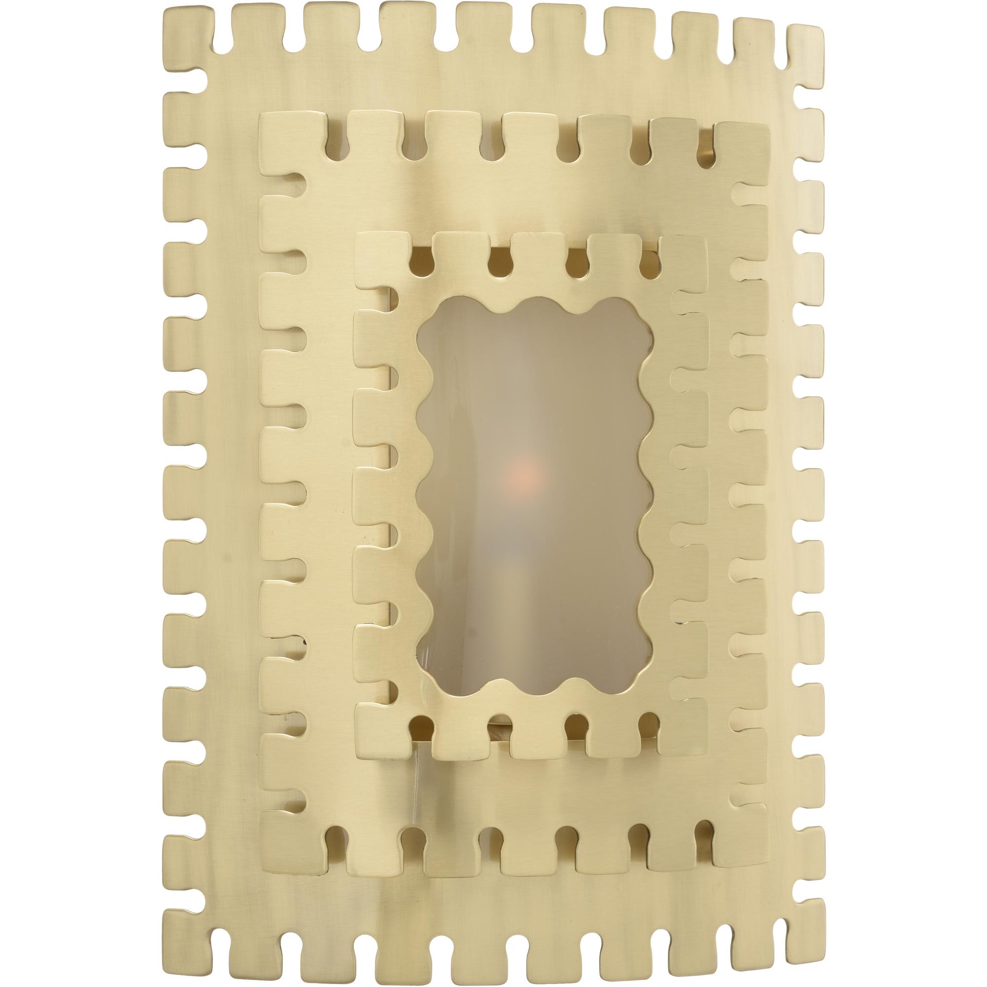 Cut metal sconce with antique brass finish and frosted glass