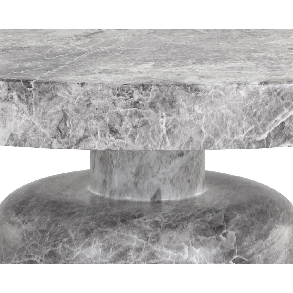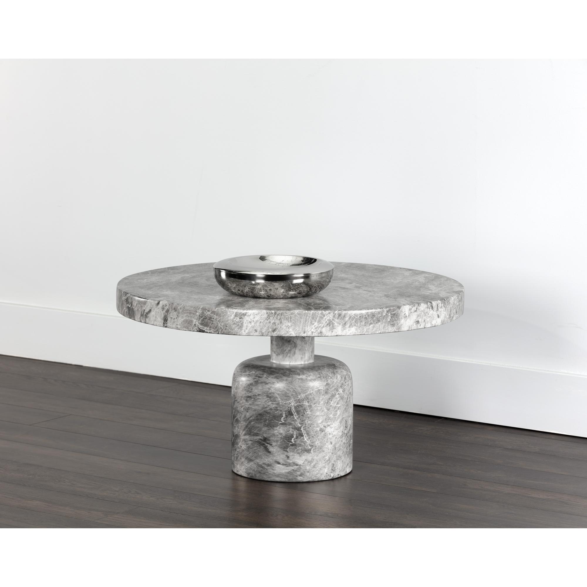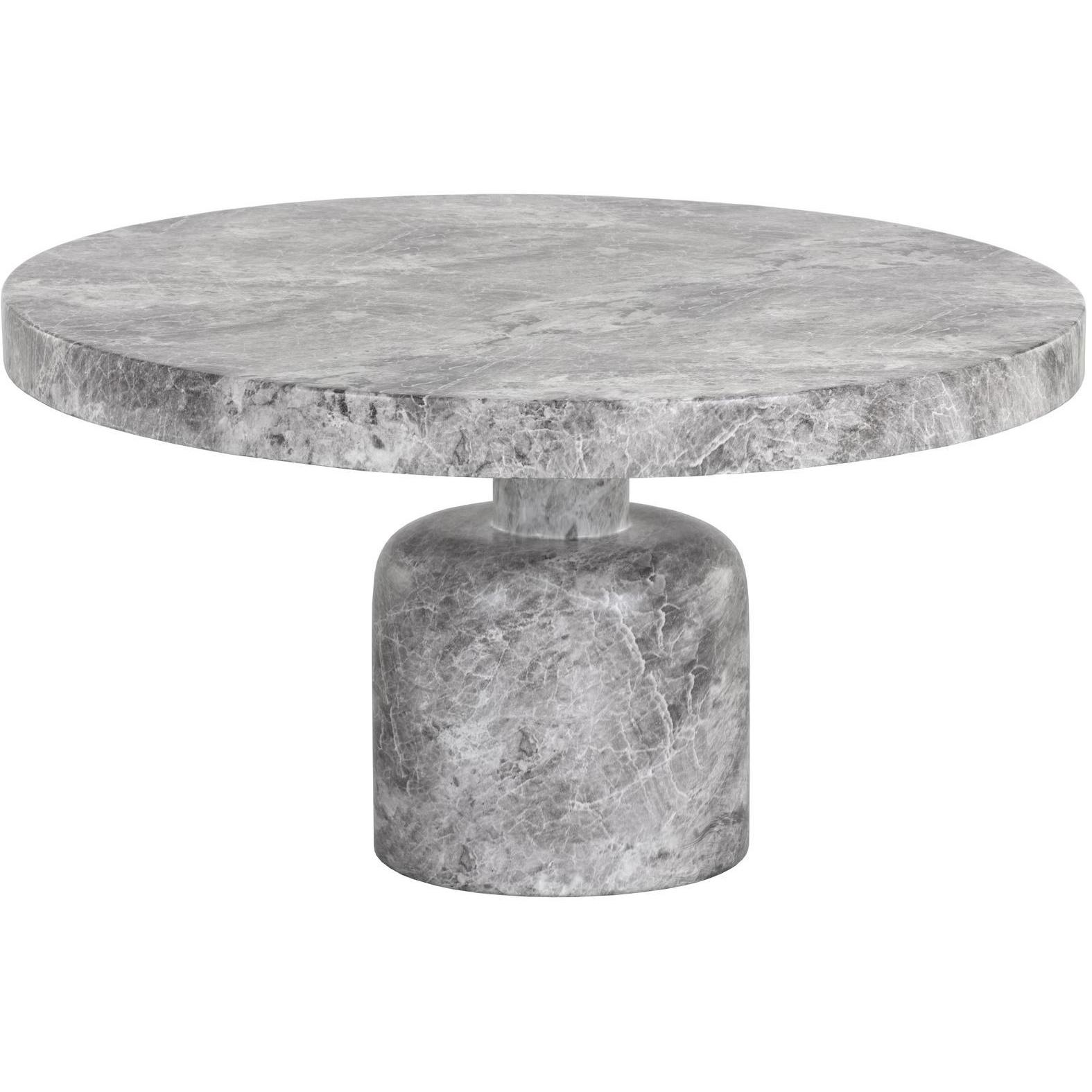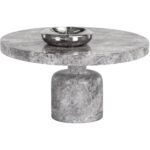 A clasically chic coffee table with an elegant design. Featured a round tabletop with a curved table base in matching grey faux marble finished concrete.
