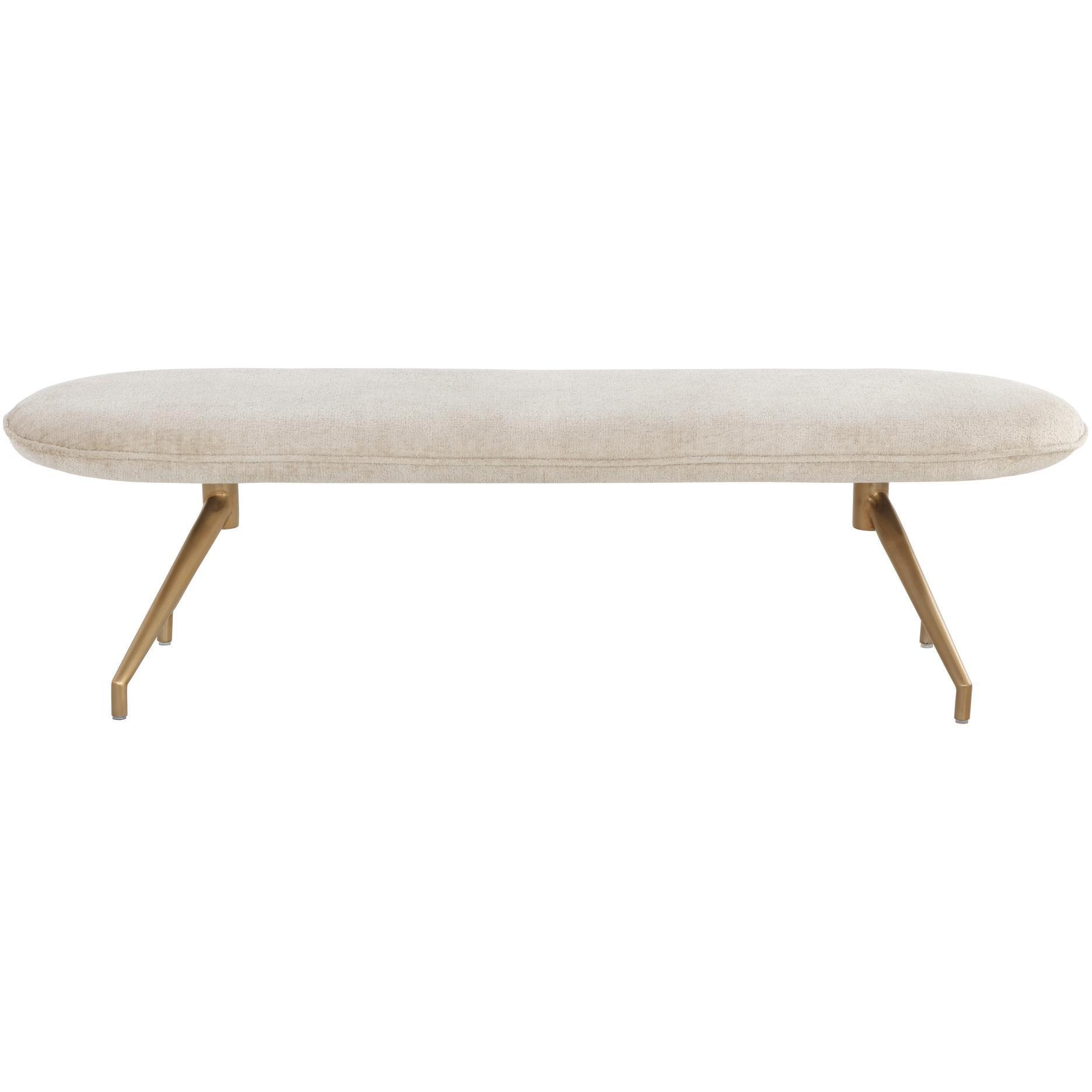 With a stunning oval design, this modern bench will add style and function to any space. Stocked in bergen taupe and olive fabrics, and completed with an antique brass powder coated stainless steel base.
