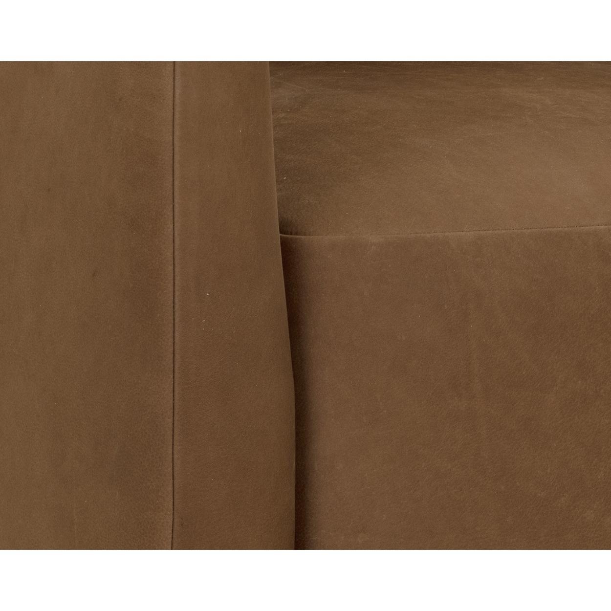 Experience ultimate comfort with the luxurious Emilie Swivel Lounge Chair. Features a well-defined rounded profile fully upholstered in nubuck caramel leather. A brown oak wood swivel base completes the look. Handle with Care: This design has been crafted with 100% genuine leather. Leather is a natural material; as such, colour variations, markings, wrinkles, grooves and light scratches are acceptable and appreciated characteristics. No two pieces are alike. As wood is an organic, porous material, these pieces will contain natural variation of texture and may also exhibit fine indentations and cracks. Wood pieces will also display a disparity of colour and grain, and visible knots and burls that add to the character of each piece.
