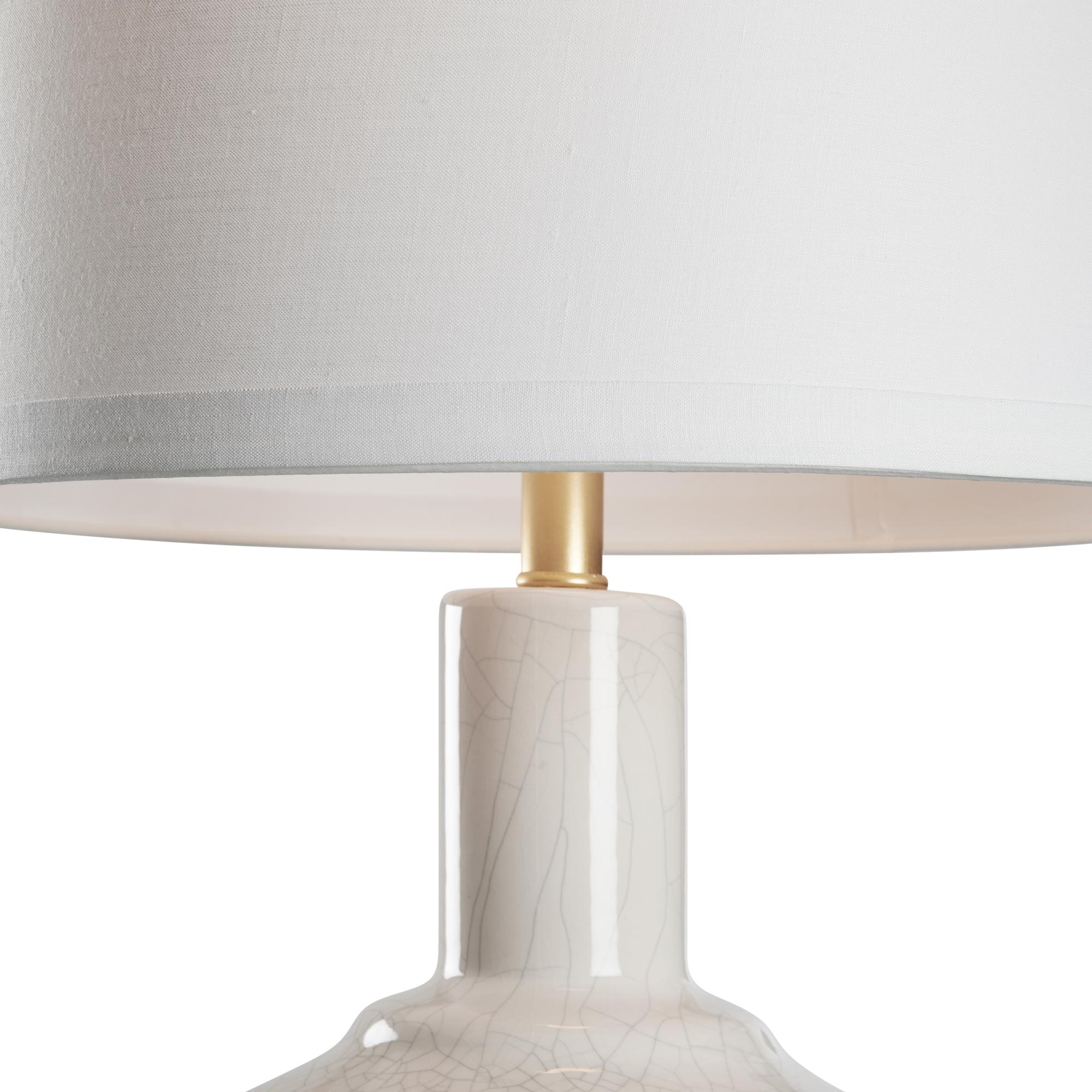 Complement your transitional or contemporary decor with this versatile 32″ accent lamp. A warm antique gold leaf base supports a crackled snow white glazed vintage inspired ceramic vase. An open pentagonal gold finial braces the ivory tapered linen drum shade as it diffuses the light. This simple yet stylish light feature will enhance any entryway, bedroom or living area.