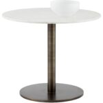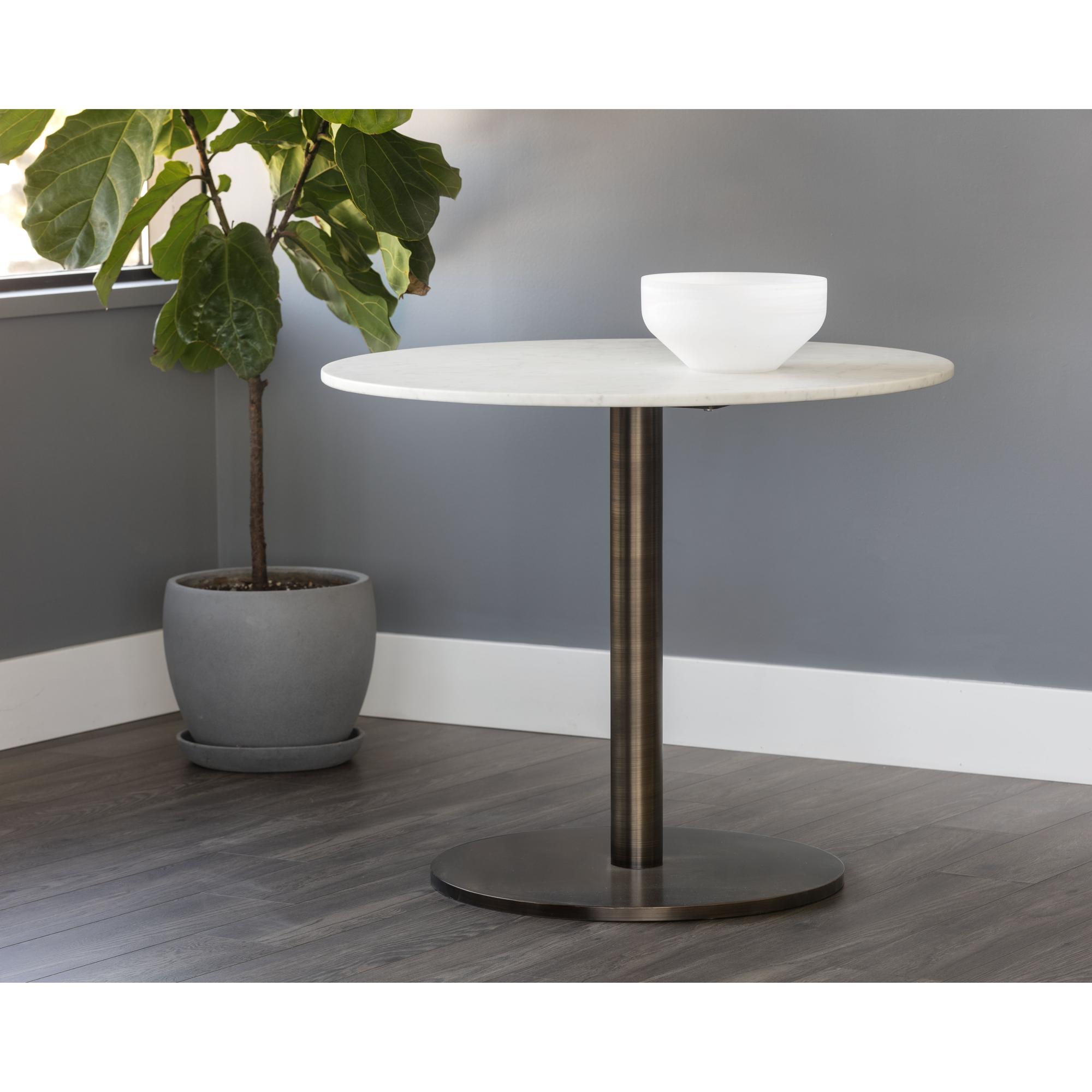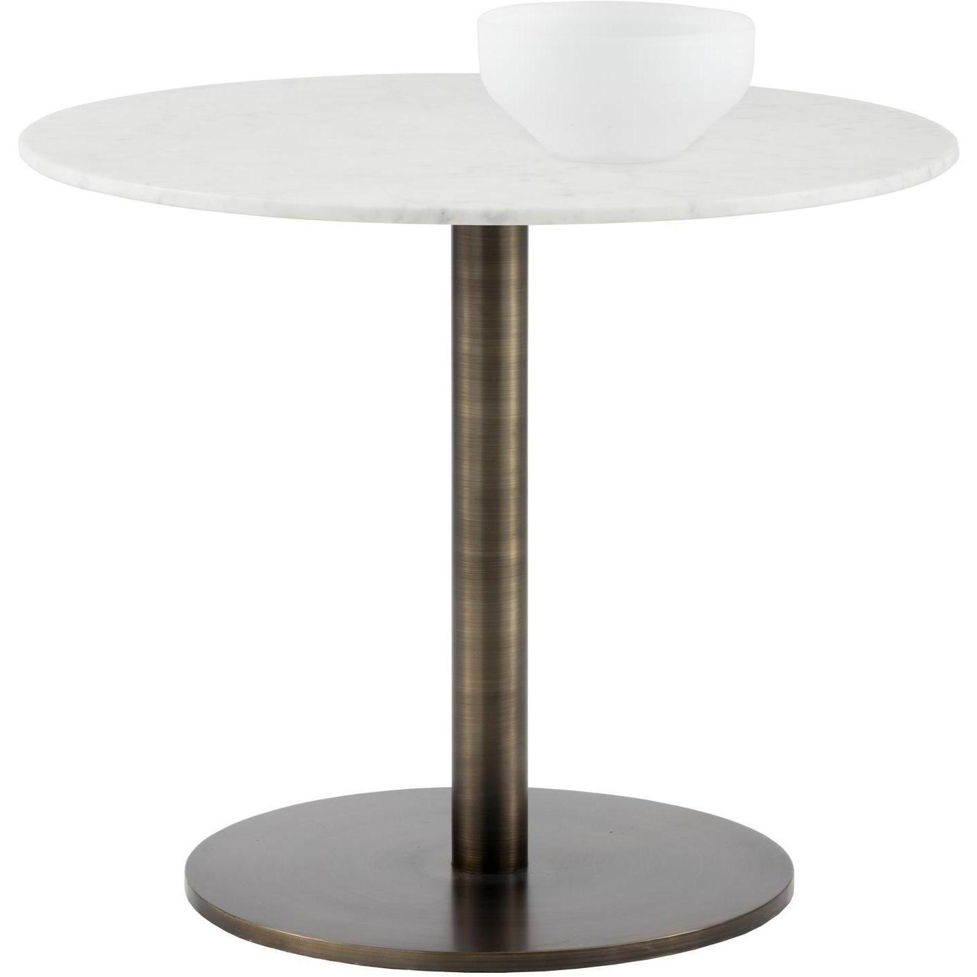 An Art Deco inspired round bistro table, featuring a solid carrara marble top with an antique gold steel base. Perfect for restaurants and smaller kitchen and dining spaces. As marble is a natural material, unique veining, pitting, fissures, micro-cracks and colour variations are all characteristics that add to the uniqueness and beauty of each piece.