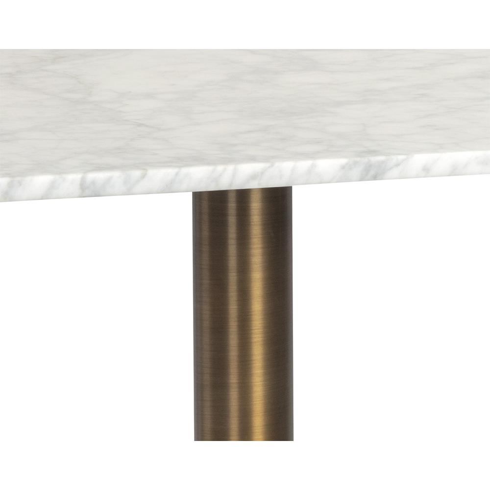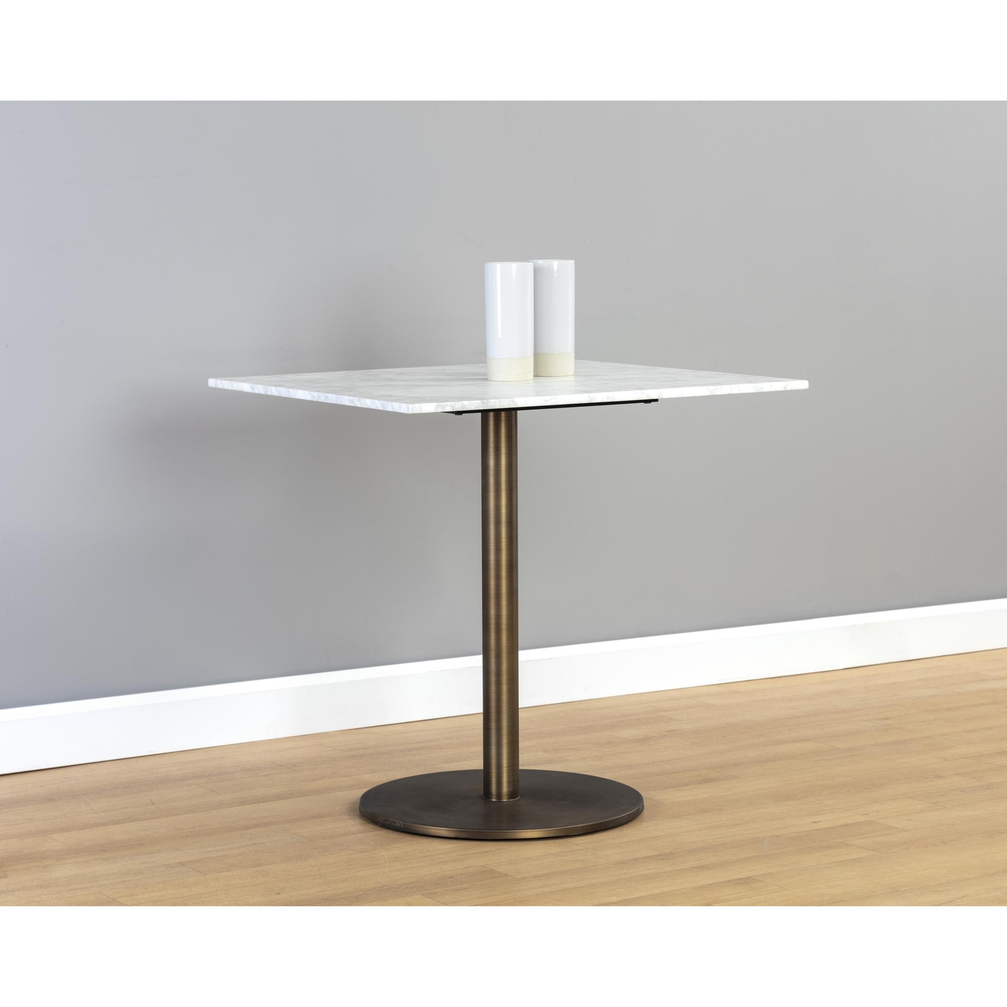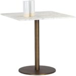 An Art Deco inspired 30″ square bistro table, featuring a solid Carrara marble top with an antique gold steel base. Perfect for restaurants and smaller dining spaces. Also available with a 24″ square and 35″ round top. As marble is a natural material, unique veining, pitting, fissures, micro-cracks and colour variations are all characteristics that add to the uniqueness and beauty of each piece.