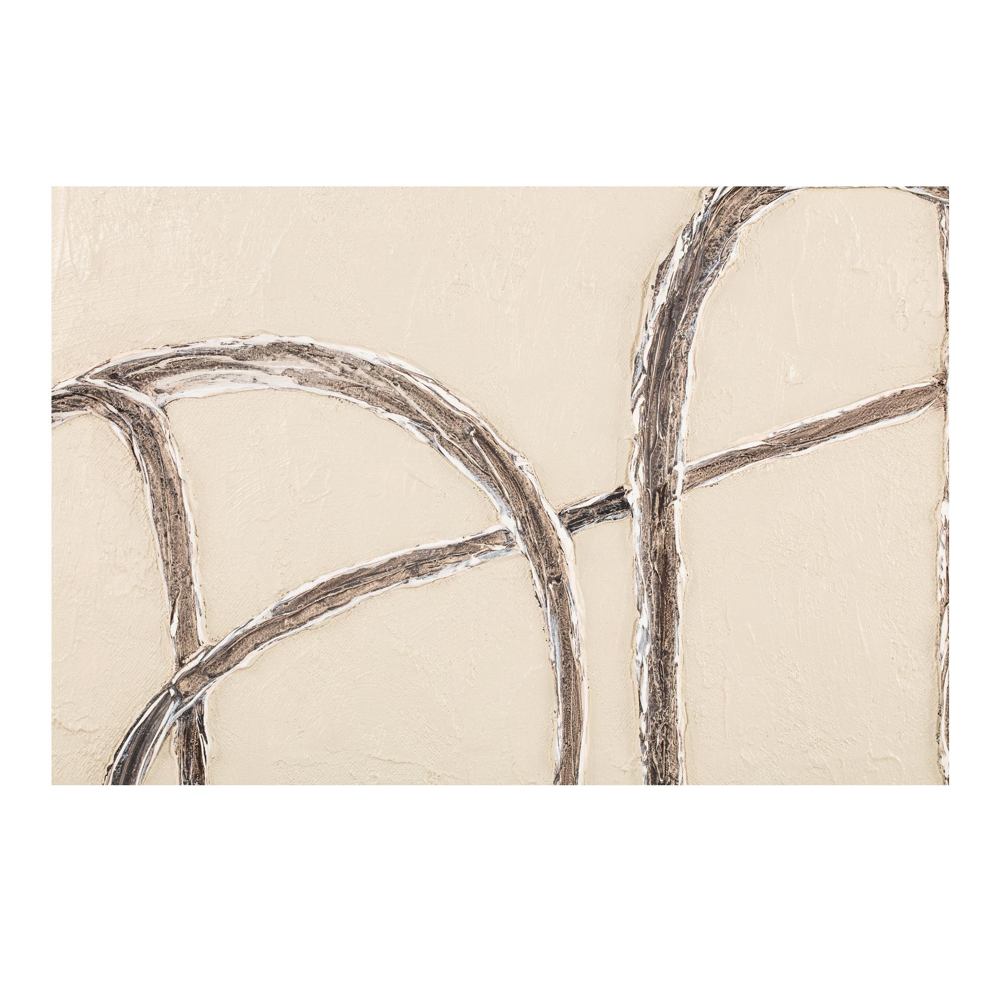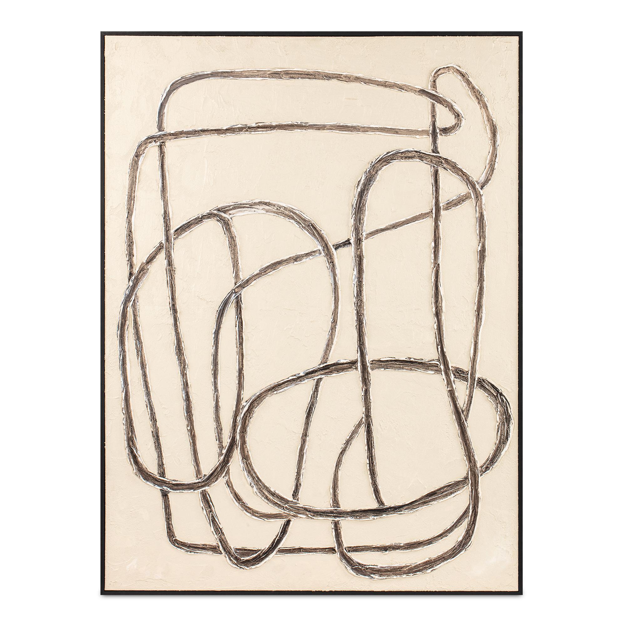 The Encounters framed painting features a looping line that weaves over and under itself in a mesmerizing dance of self-interaction. Crafted with depth in mind, the line work is ingeniously integrated within the acrylic paint, creating a profound sense of dimensionality. At the same time, its neutral color palette ensures a seamless fit into transitional homes.