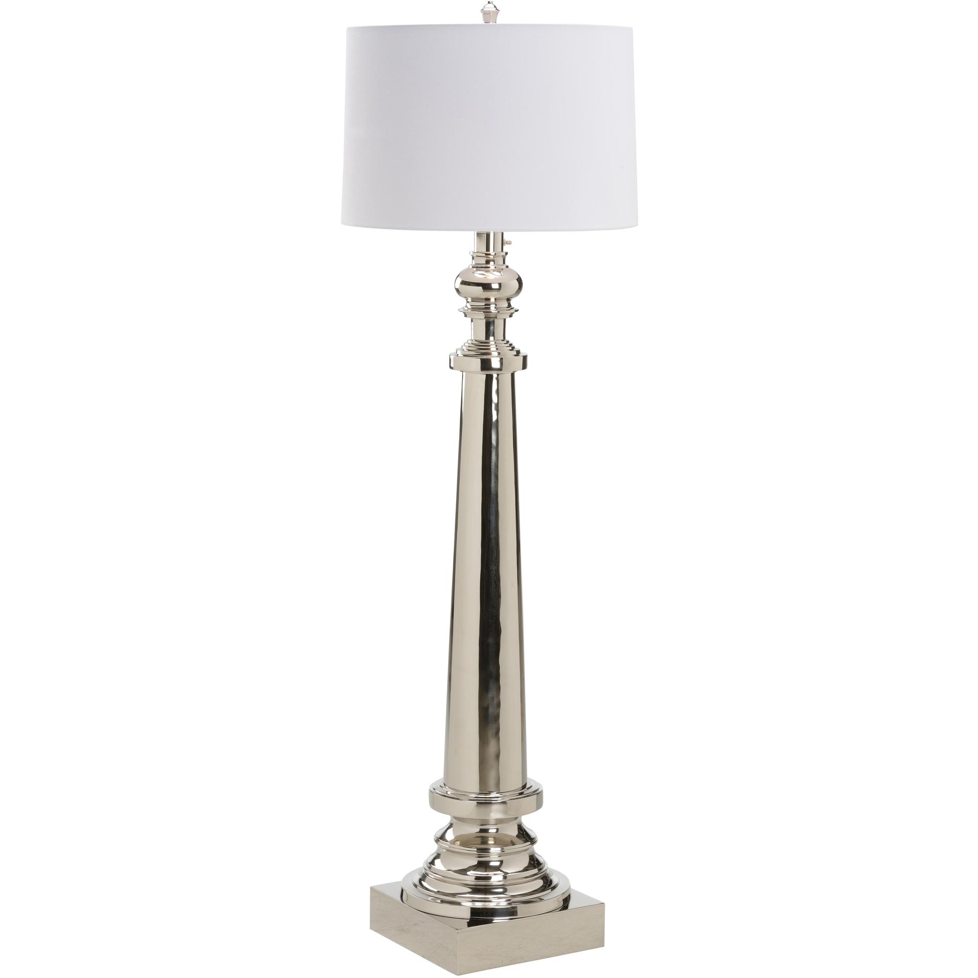 The Equus Floor Lamp brings refined symmetry and timeless shine to any space. Its tall, tapered silhouette is accented with classic turned detailing and finished in lustrous polished nickel for a clean, sophisticated look. Topped with an off white shade, the Equus Floor Lamp offers balanced illumination and sculptural presence.