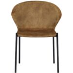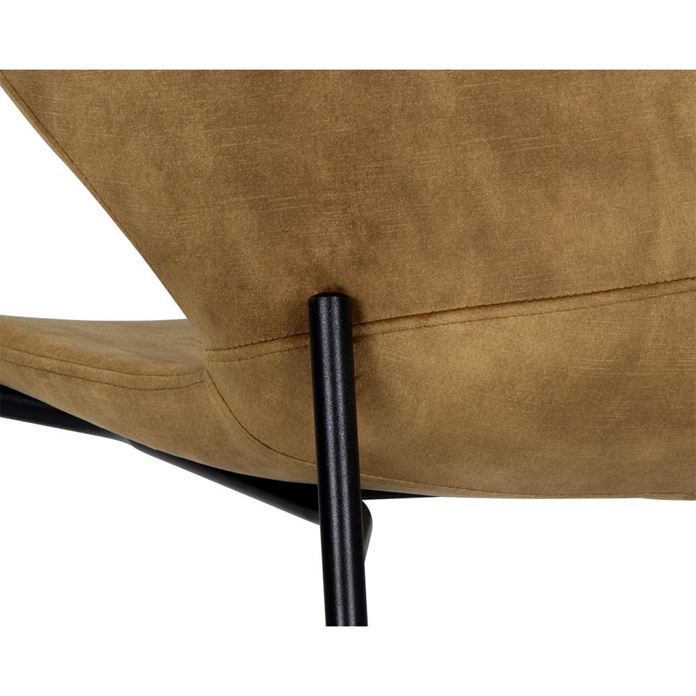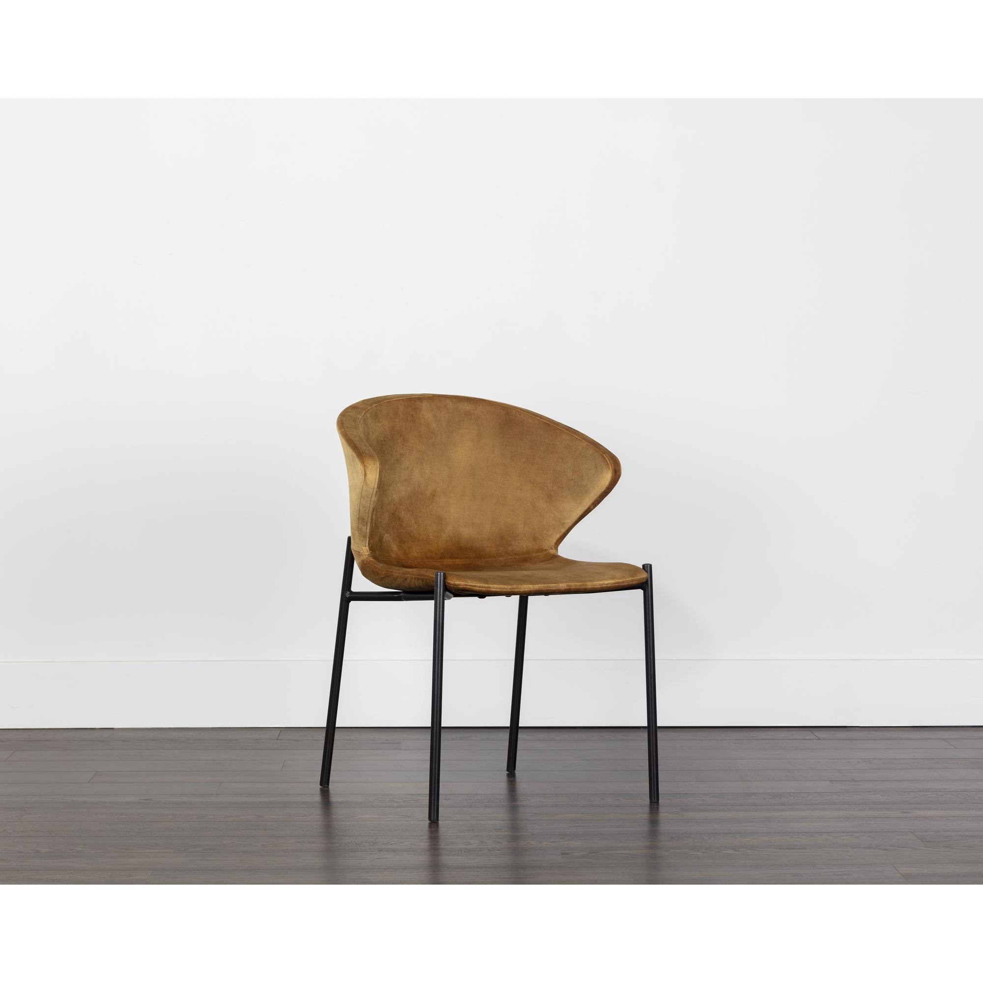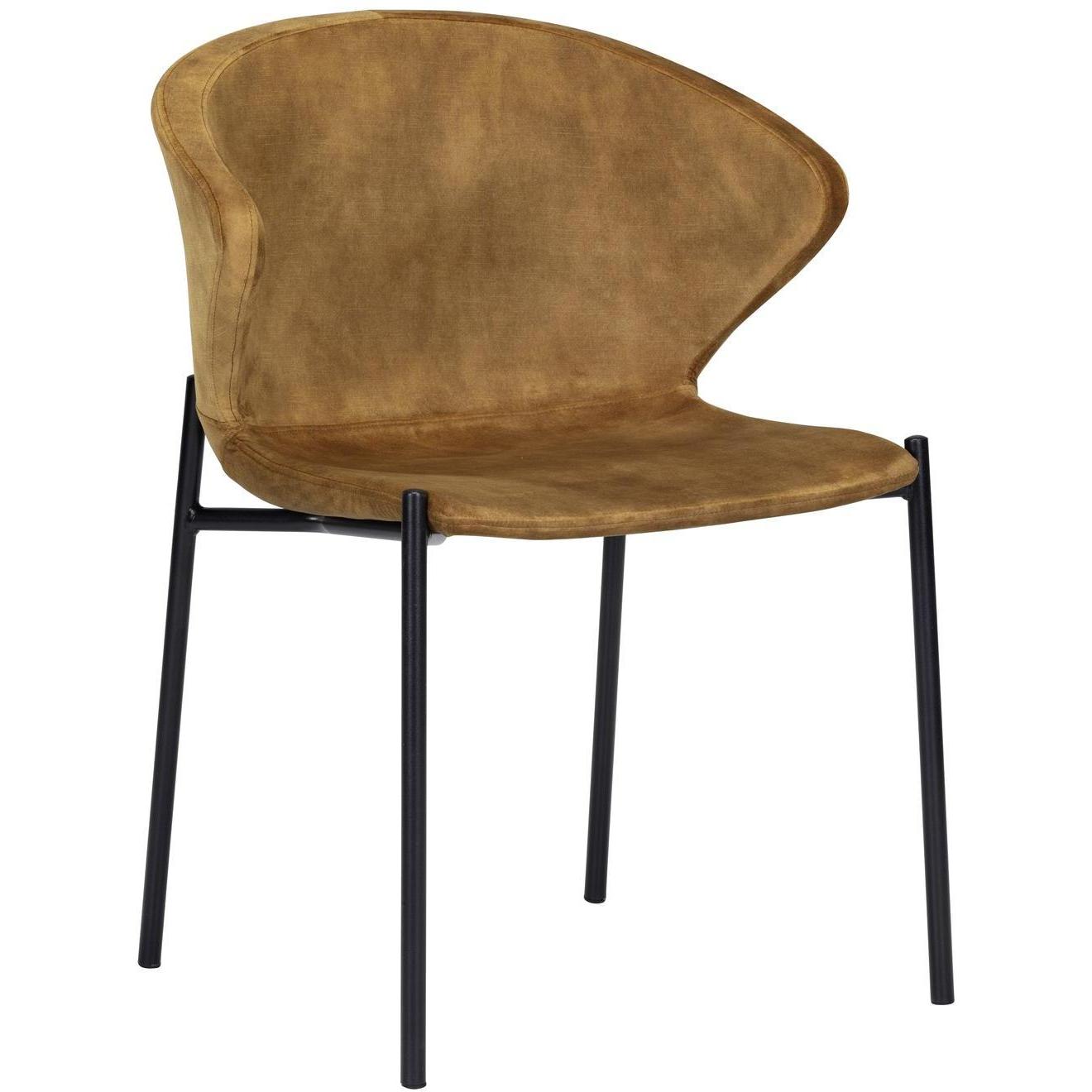 The curved shape of this mid-century dining chair brings in all the appeal. Upholstered in nono tapenade gold fabric and completed with black steel legs. Also available in nono dark green fabric.