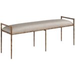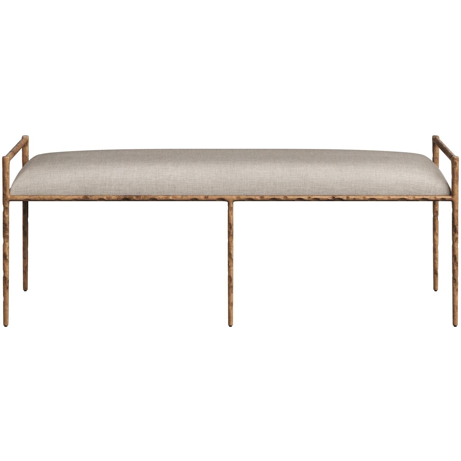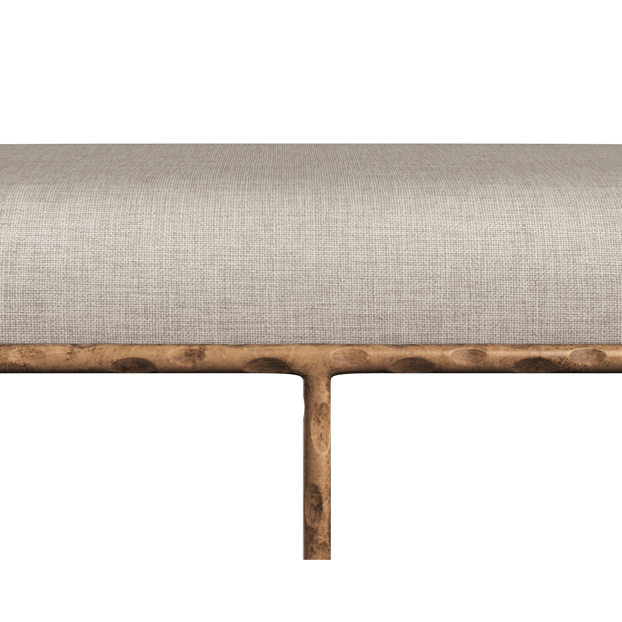 Rich with texture, this impressive bench is infused with an exotic touch. Stocked in zenith taupe grey performance fabric, and completed with a hammered antique brass steel frame. Performance fabric is moisture repellent, durable and easy to clean. Made in India. With refined craftsmanship, this design was brought to life by skilled local artisans. By nature, these materials develop unique imperfections such as fissures, markings and colour variations for a truly one-of-a-kind piece.