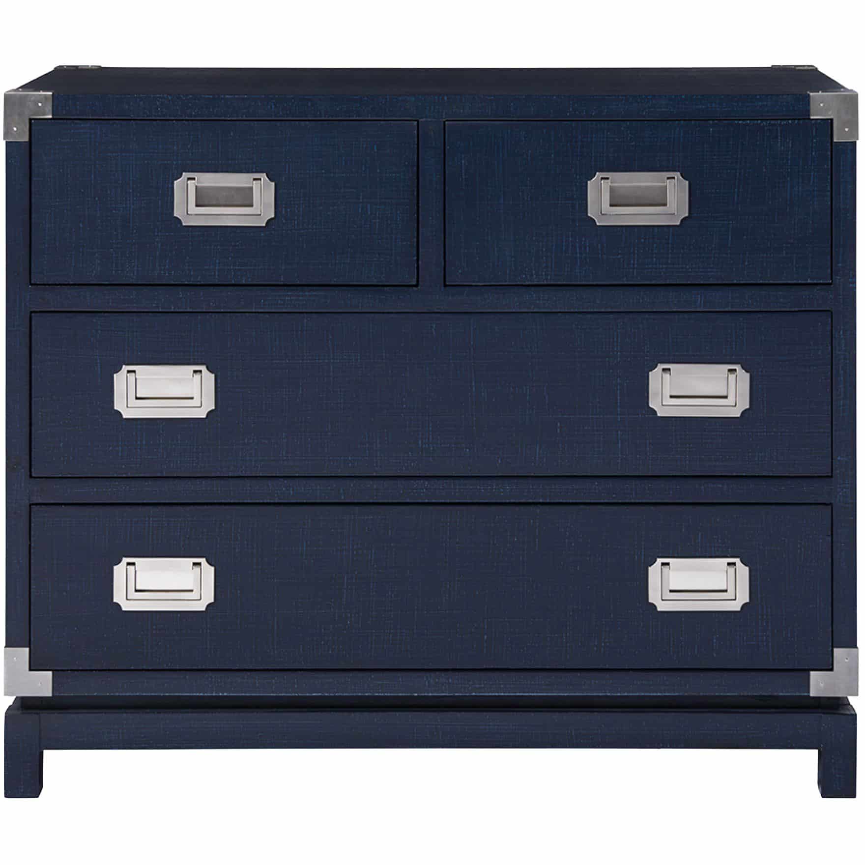 A stunning Marina finish and a vintage trunk-inspired frame define the Coastal Campaign Chest, a bold accent piece built with four drawers and chic inset hardware.