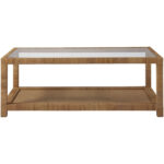 A sleek, rectangular glass top and a fresh open-air display shelf is framed by an earthy, wrapped rattan in the Long Key Cocktail Table, a light and refreshing living room furnishing.