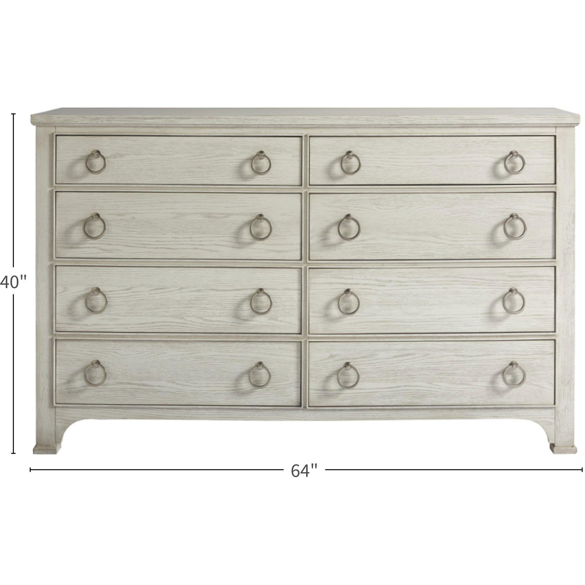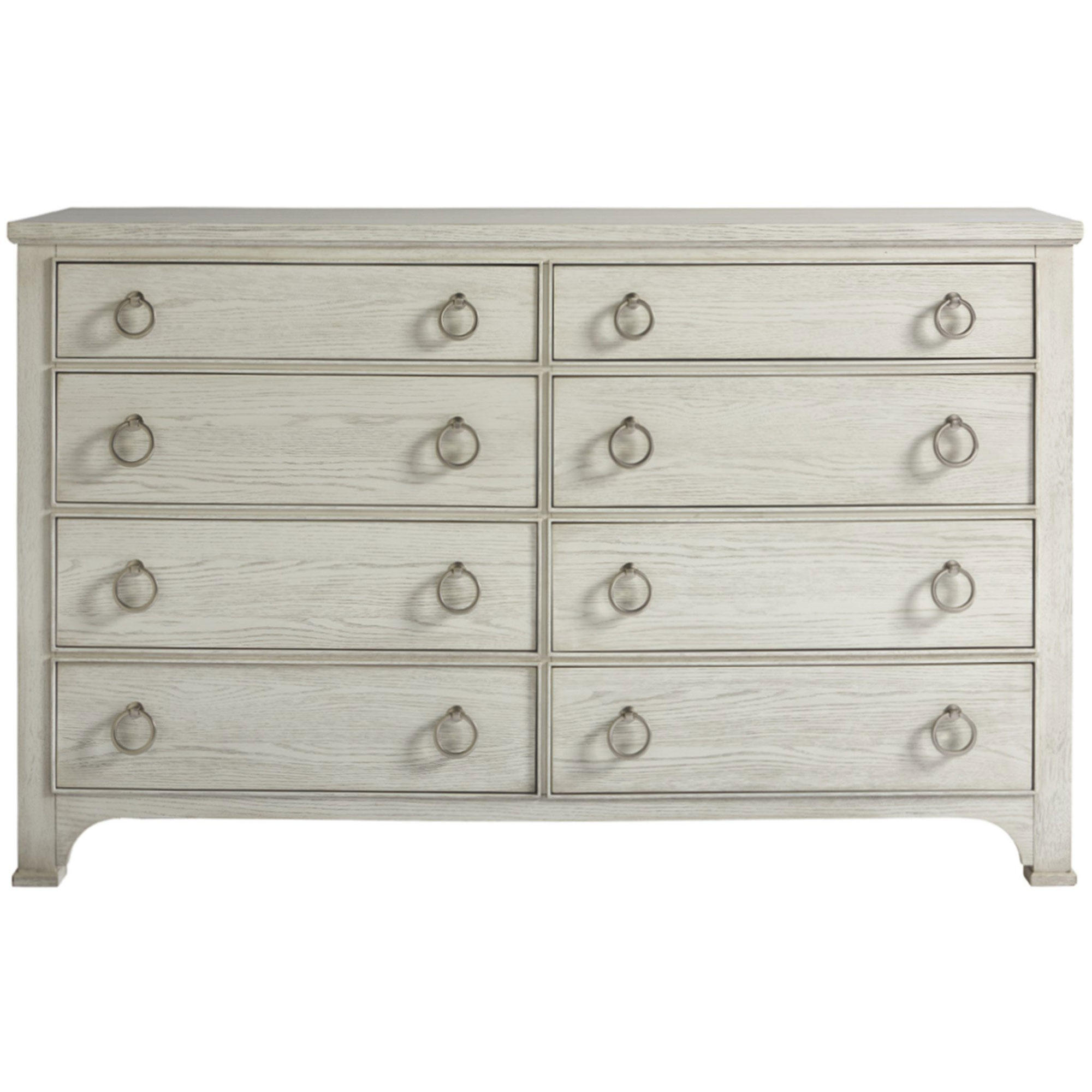 The Escape Drawer Dresser features eight spacious drawers accented with complementing pairs of silver ring pulls.