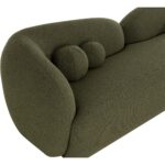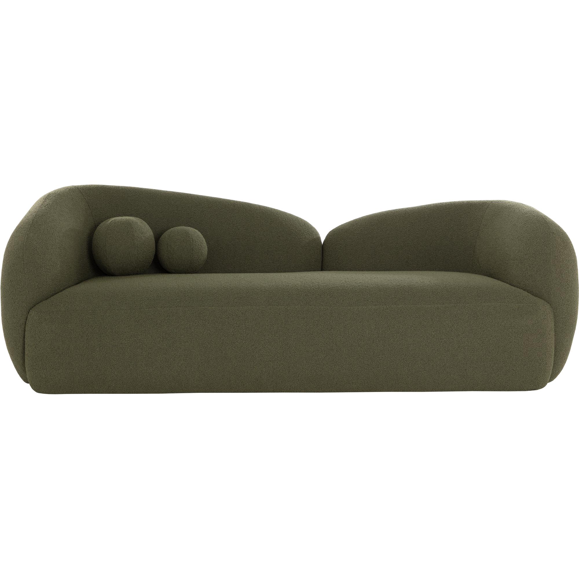 The Esme sofa is bold, shapely and more importantly, lounge-worthy. Textured boucle is formed into voluminous curves with foam-filled cushioning to impart durable, unending comfort. Two spherical throw cushions in matching copenhagen olive boucle fabric emphasize Esme’s cozy feel.