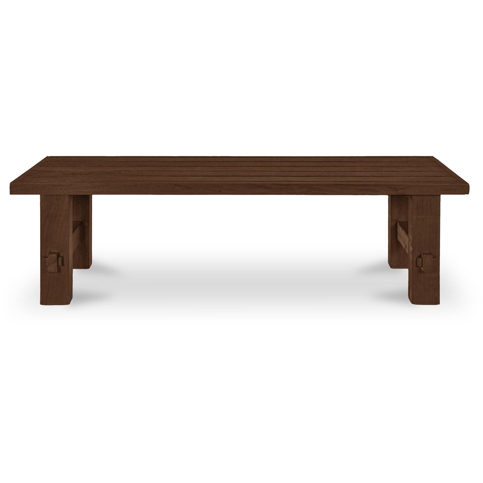 The Esmond outdoor dining bench embraces traditional charm to create an outdoor sanctuary. This FSC-certified solid teak bench features a slatted top with stretchers and joinery detailing, creating a classic look with refined appeal. The brown finish adds warmth, while its durable and weather-resistant design provides comfortable seating for outdoor gatherings and everyday use.