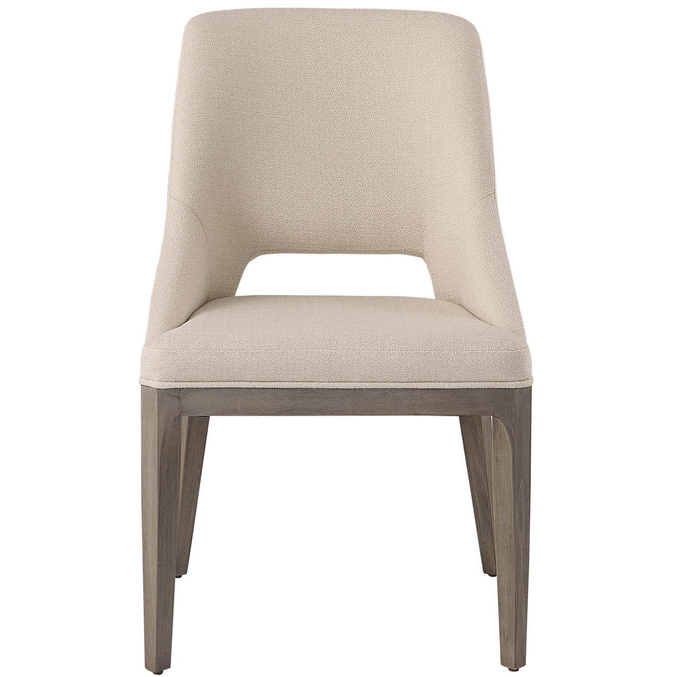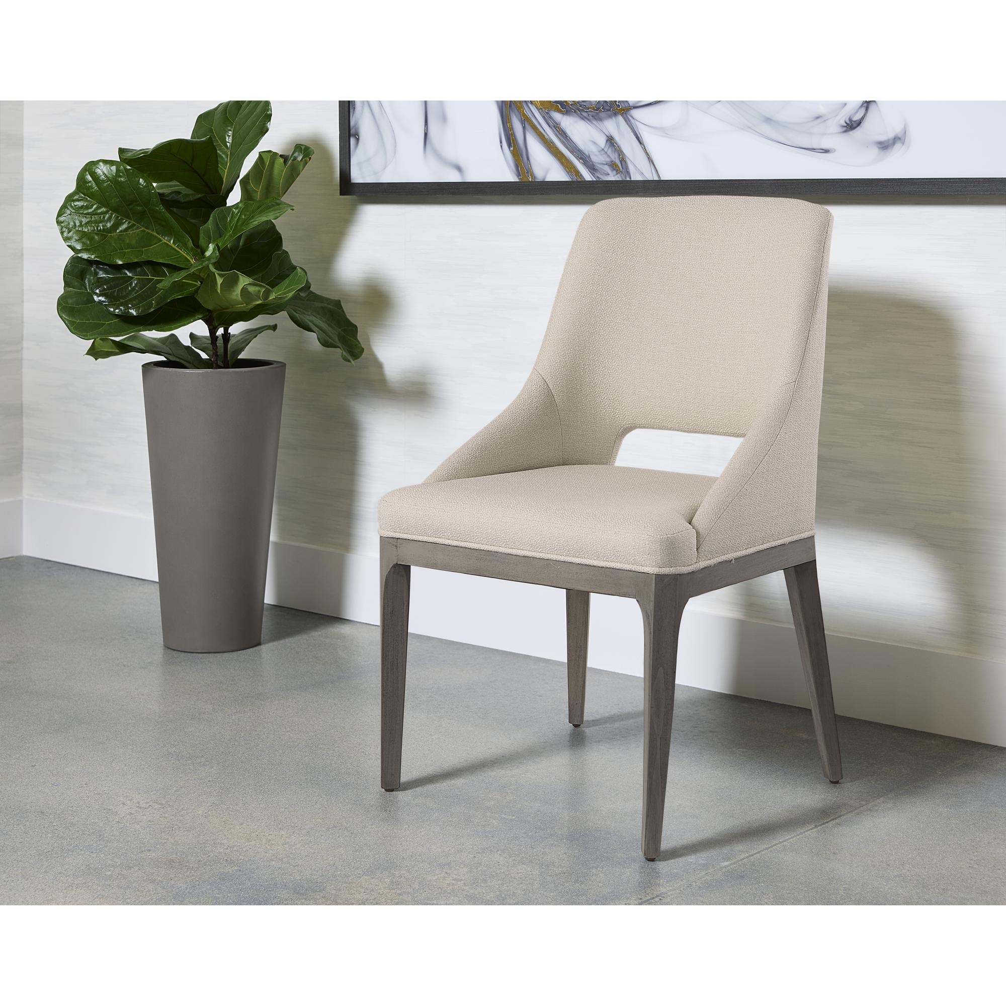 Dine in style and comfort in this fabulous dining chair that features a tasteful cutout in the seatback. Completed with mainz cream fabric upholstery and features solid poplar wood legs in a light grey oak finish. Also available in naya check light grey fabric. As wood is an organic, porous material, these pieces will contain natural variation of texture and may also exhibit fine indentations and cracks. Wood pieces will also display a disparity of colour and grain, and visible knots and burls that add to the character of each piece.