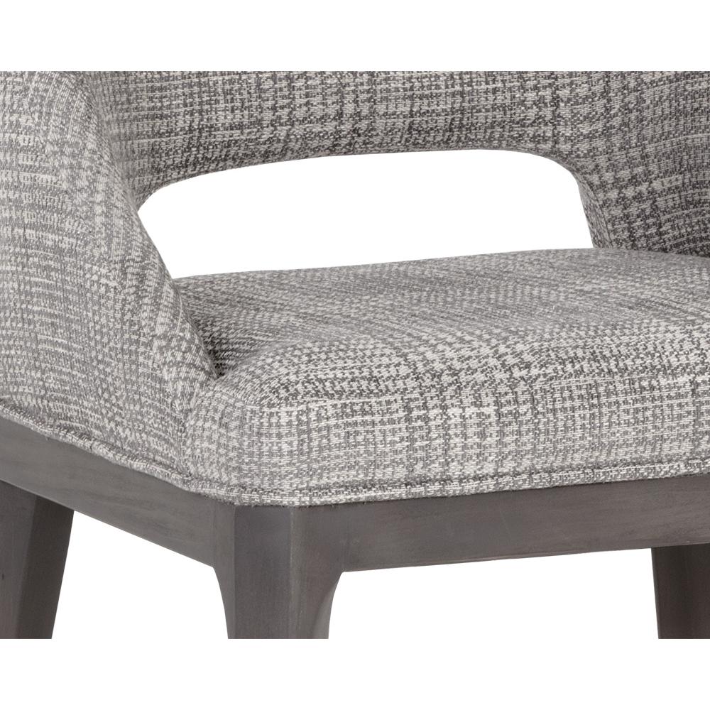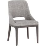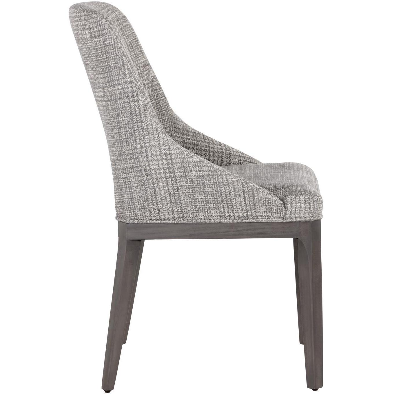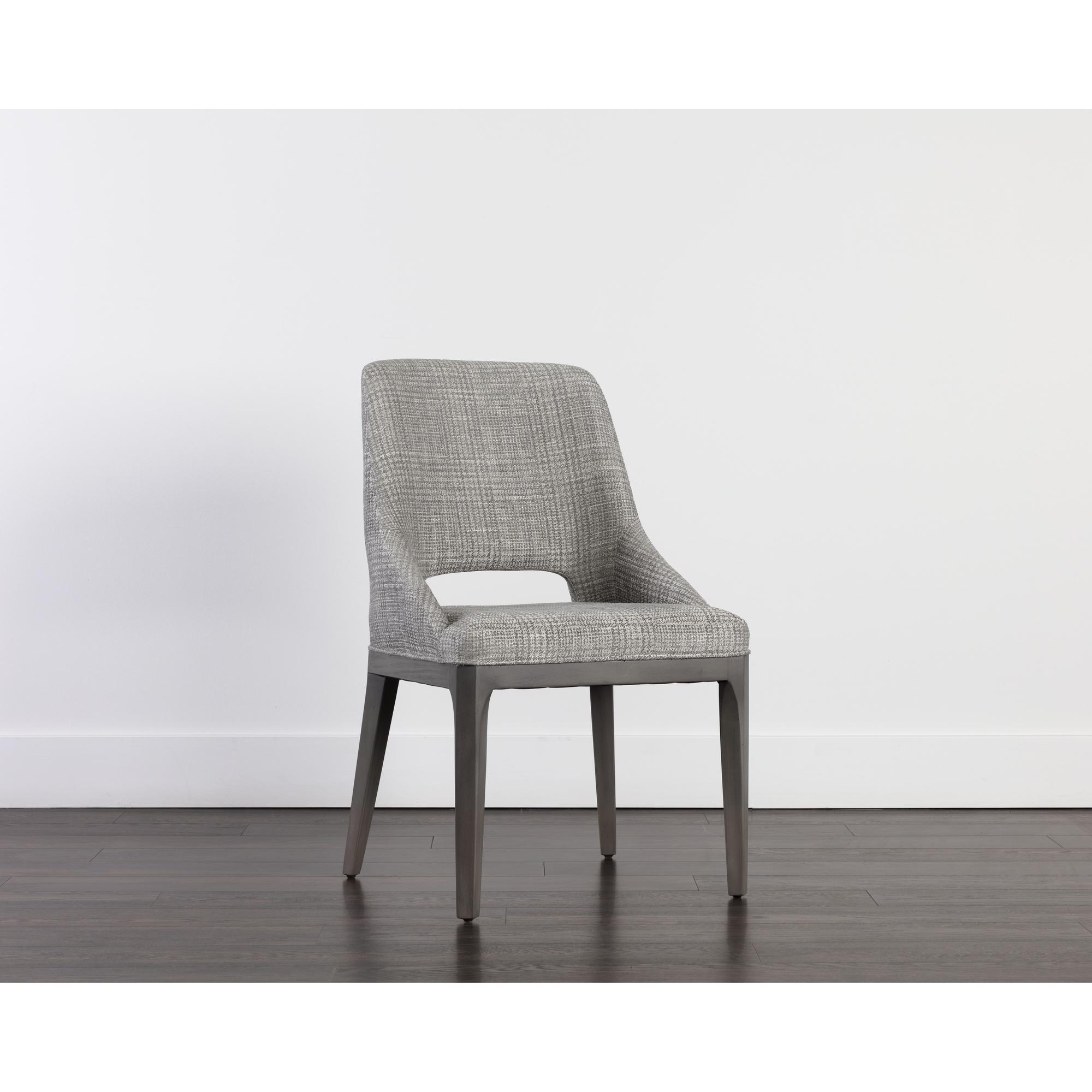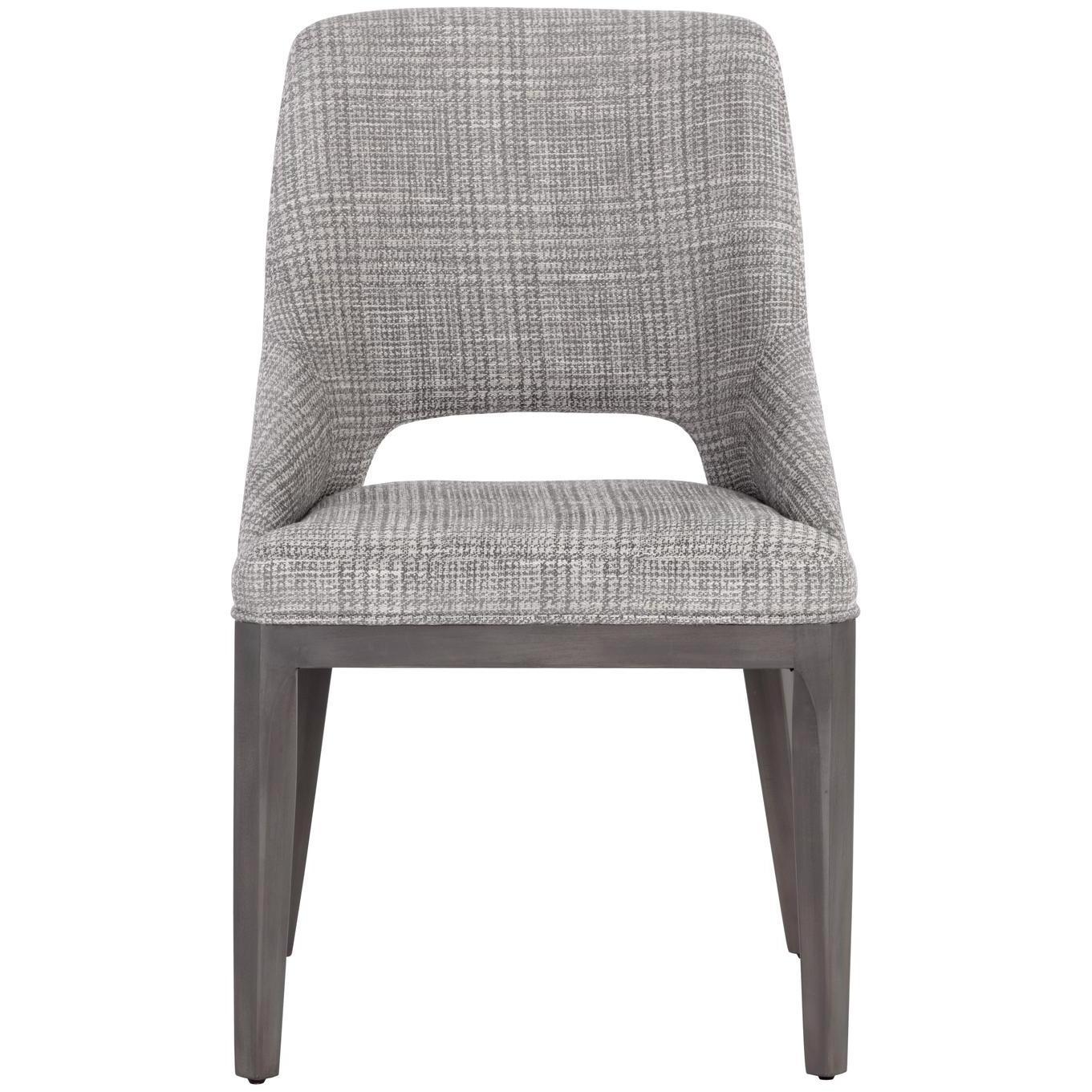 Dine in style and comfort in this fabulous dining chair that features a tasteful cutout in the seatback. Completed with naya check light grey fabric upholstery and features solid poplar wood legs in a light grey oak finish. Also available in mainz cream fabric. As wood is an organic, porous material, these pieces will contain natural variation of texture and may also exhibit fine indentations and cracks. Wood pieces will also display a disparity of colour and grain, and visible knots and burls that add to the character of each piece.