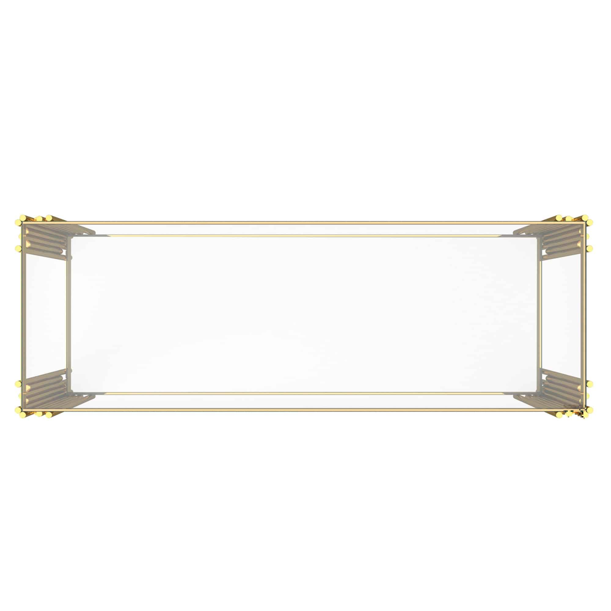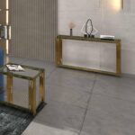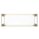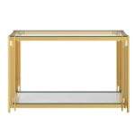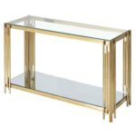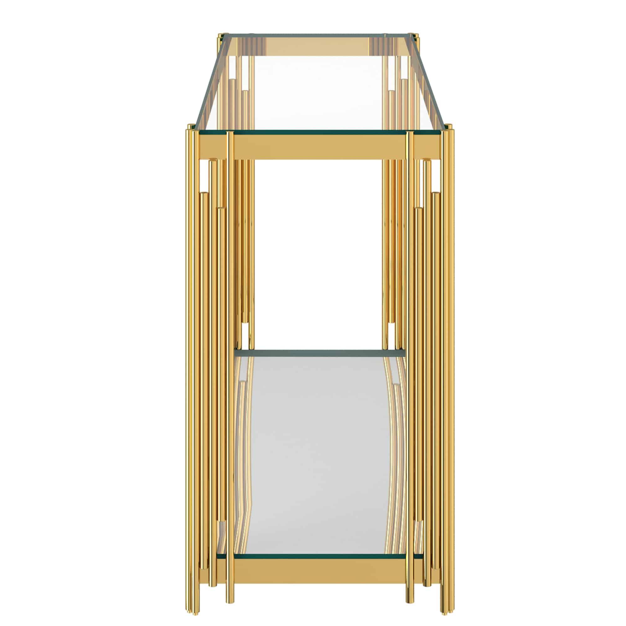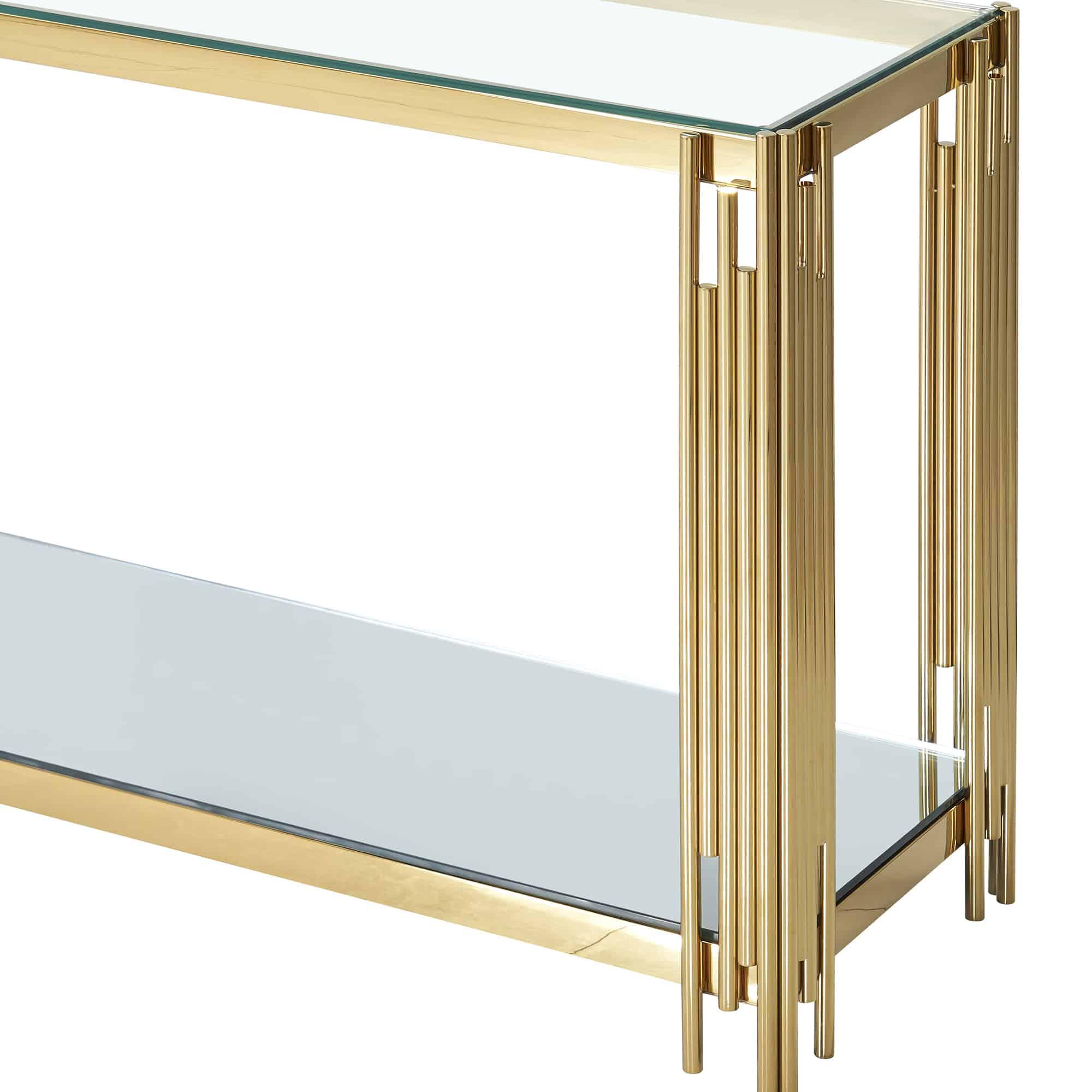 Contemporary table with some art-deco inspired style. The polished metal frame and two-tier glass and mirror design will bring instant shine to any room and provide space to store and display. Great behind a sofa, or as a hallway table.