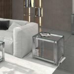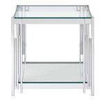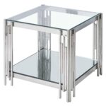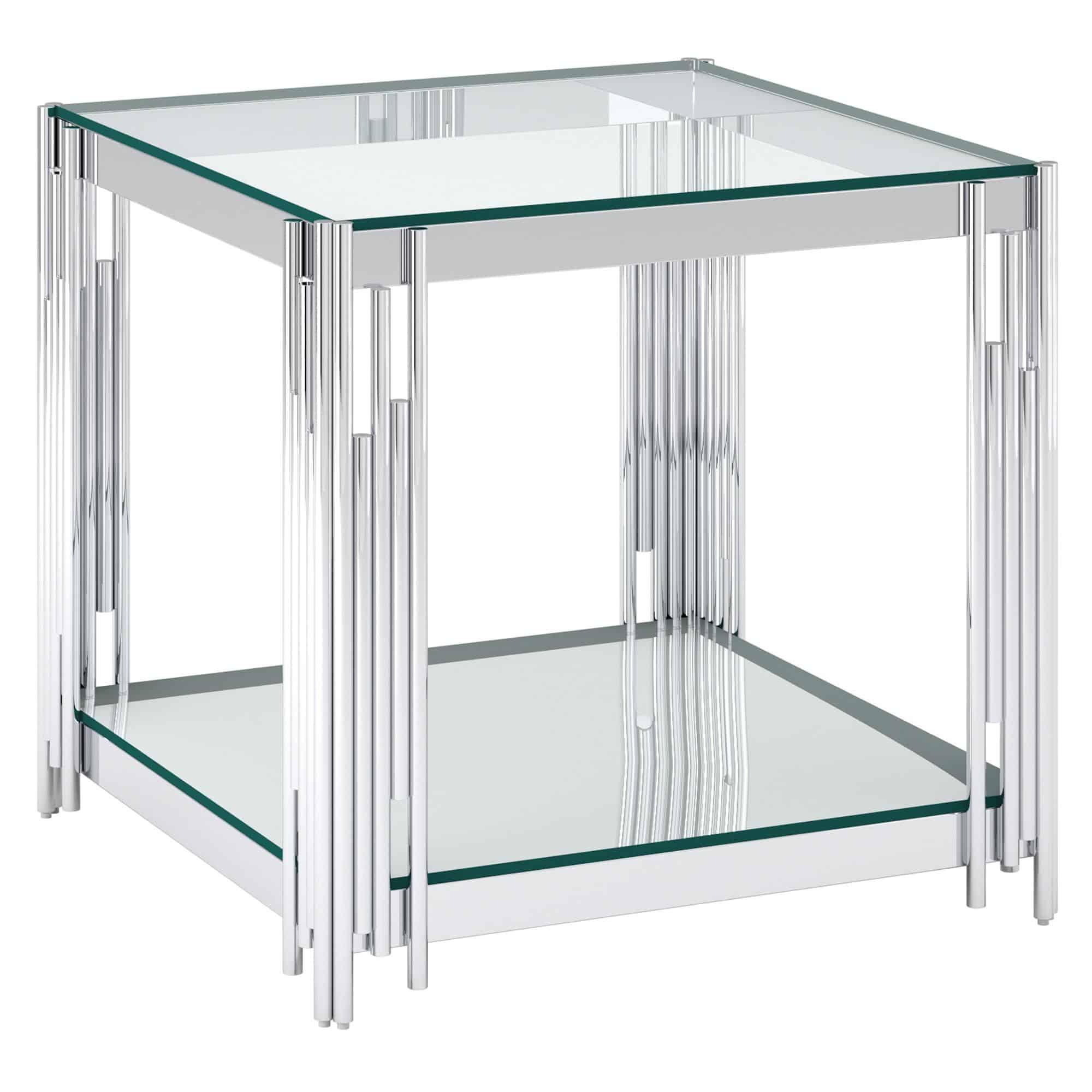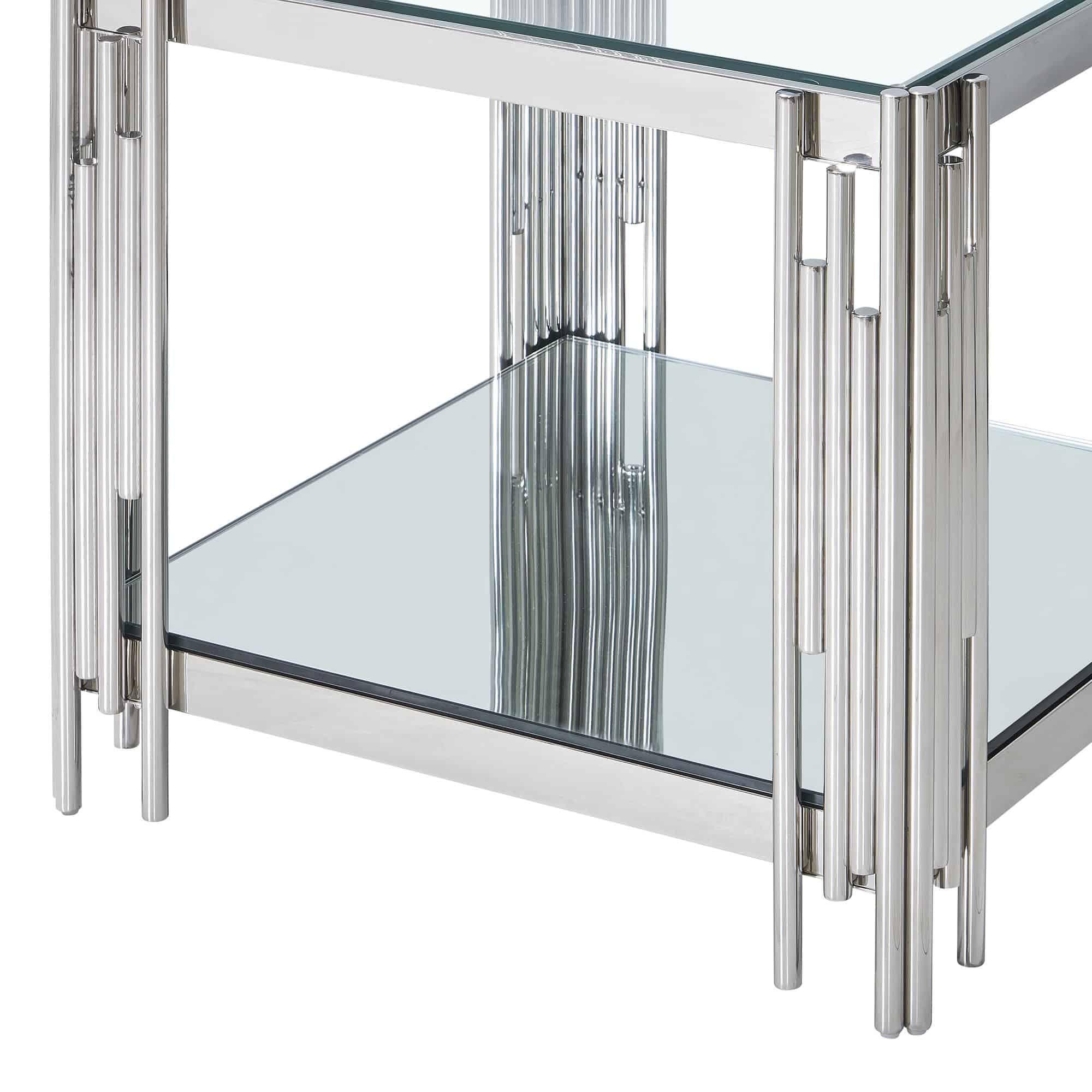 Contemporary table with some art-deco inspired style. The polished metal frame and two-tier glass and mirror design will bring instant shine to any room and provide space to store and display. Use in the living room or bedroom as a night table.
