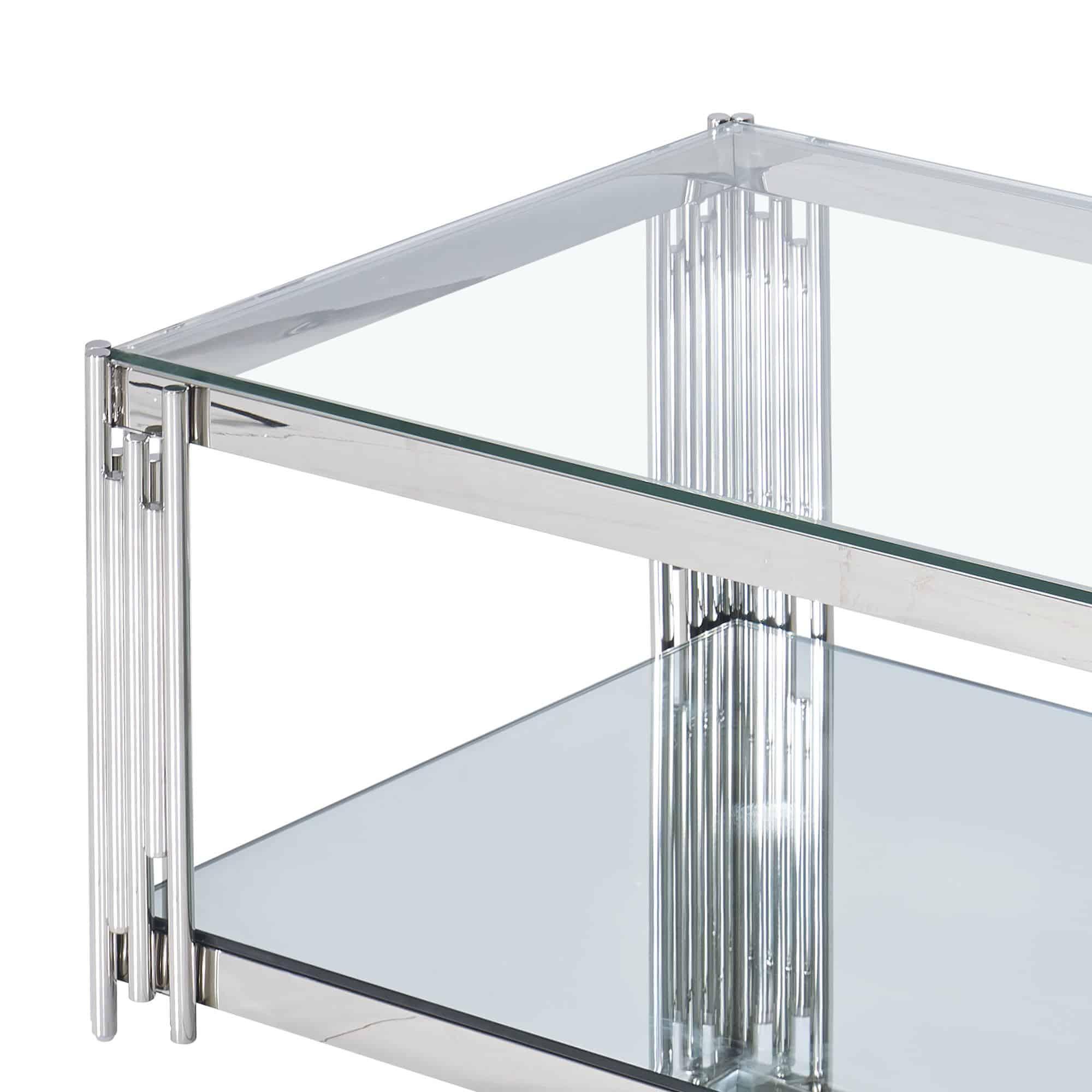 Contemporary table with some art-deco inspired style. The polished metal frame and two-tier glass and mirror design will bring instant shine to any room and provide space to store and display.