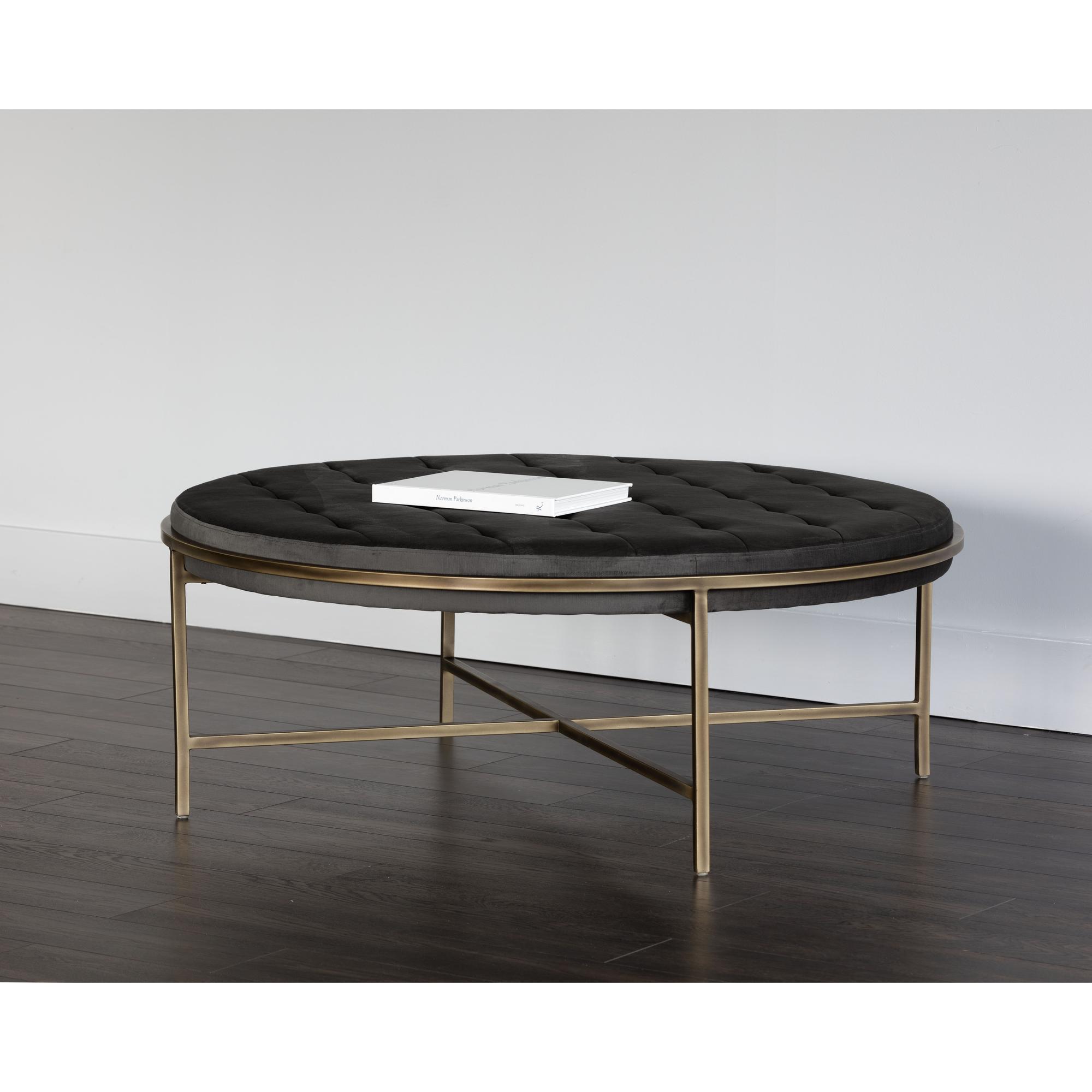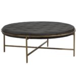This large round ottoman exudes transitional flair. Stocked in our soft piccolo pebble performance fabric with a rustic bronze steel frame. Can be used as a coffee table or as extra seating in residential and commercial spaces. Performance fabric is moisture repellent, durable and easy to clean.