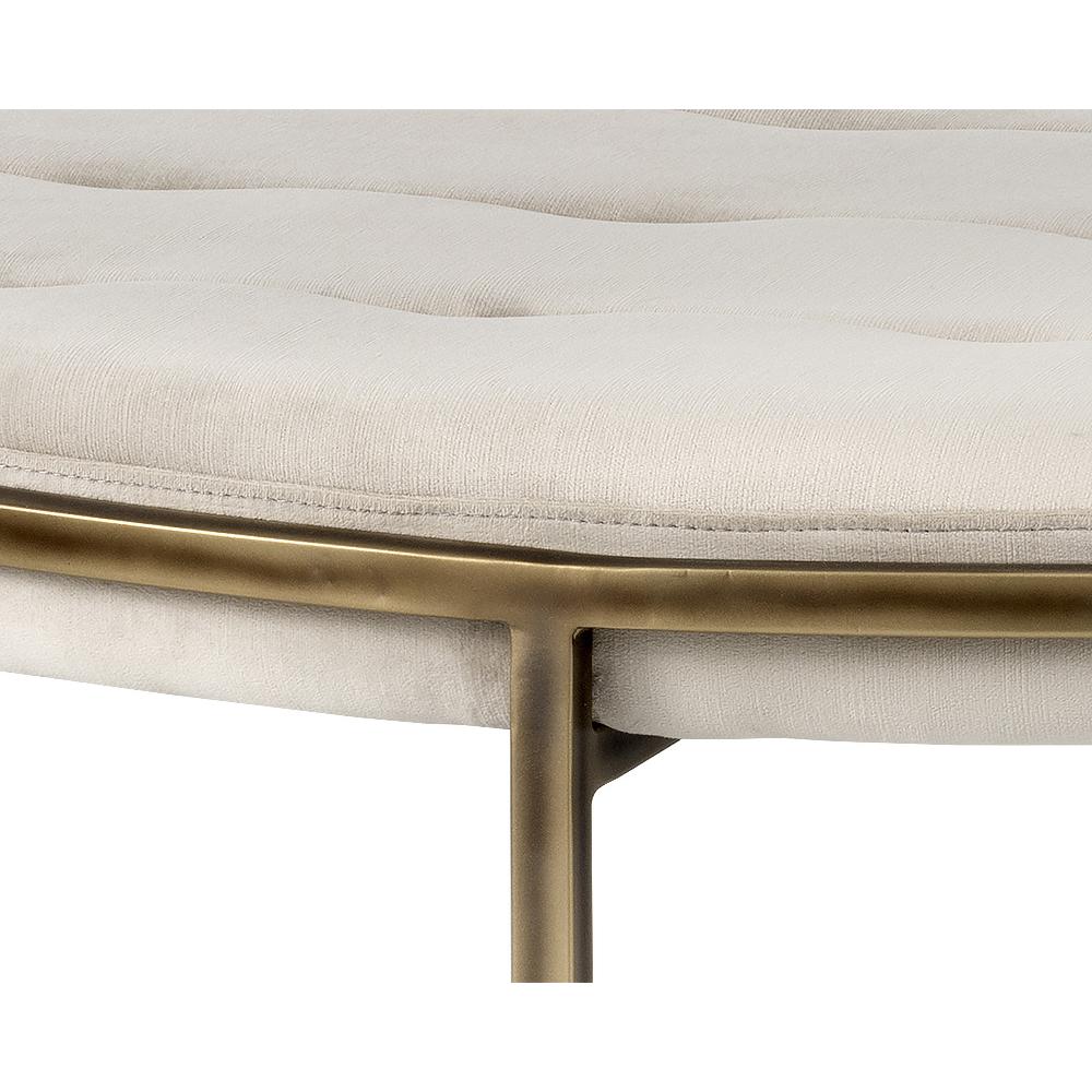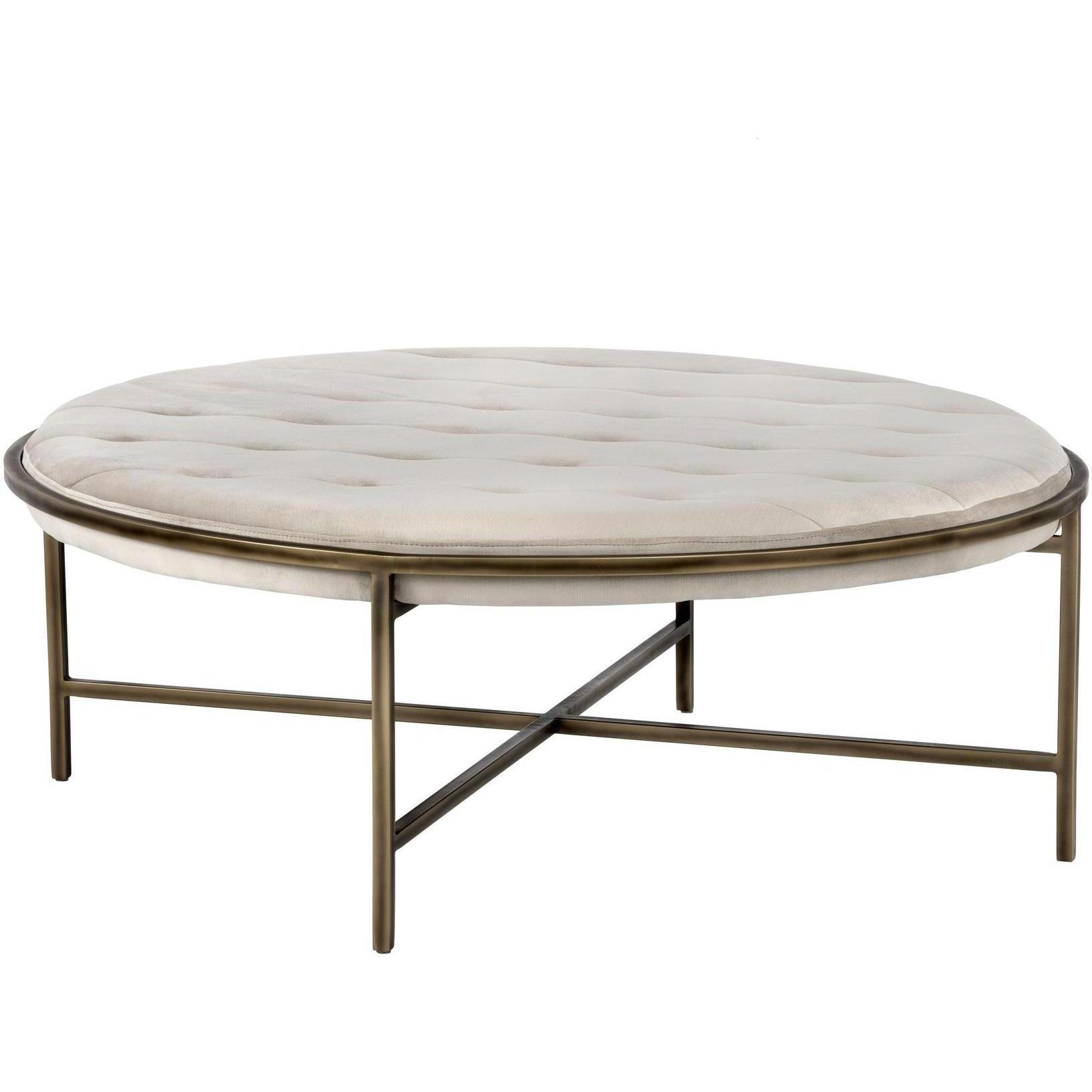 This large round ottoman exudes transitional flair. Stocked in our soft piccolo prosecco performance fabric with a rustic bronze steel frame. Can be used as a coffee table or as extra seating in residential and commercial spaces. Performance fabric is moisture repellent, durable and easy to clean.