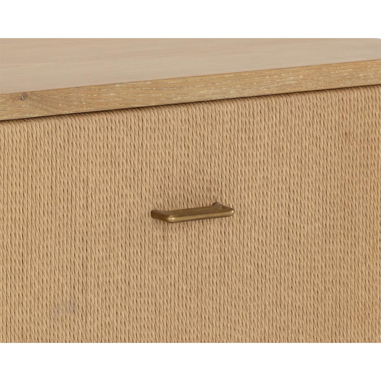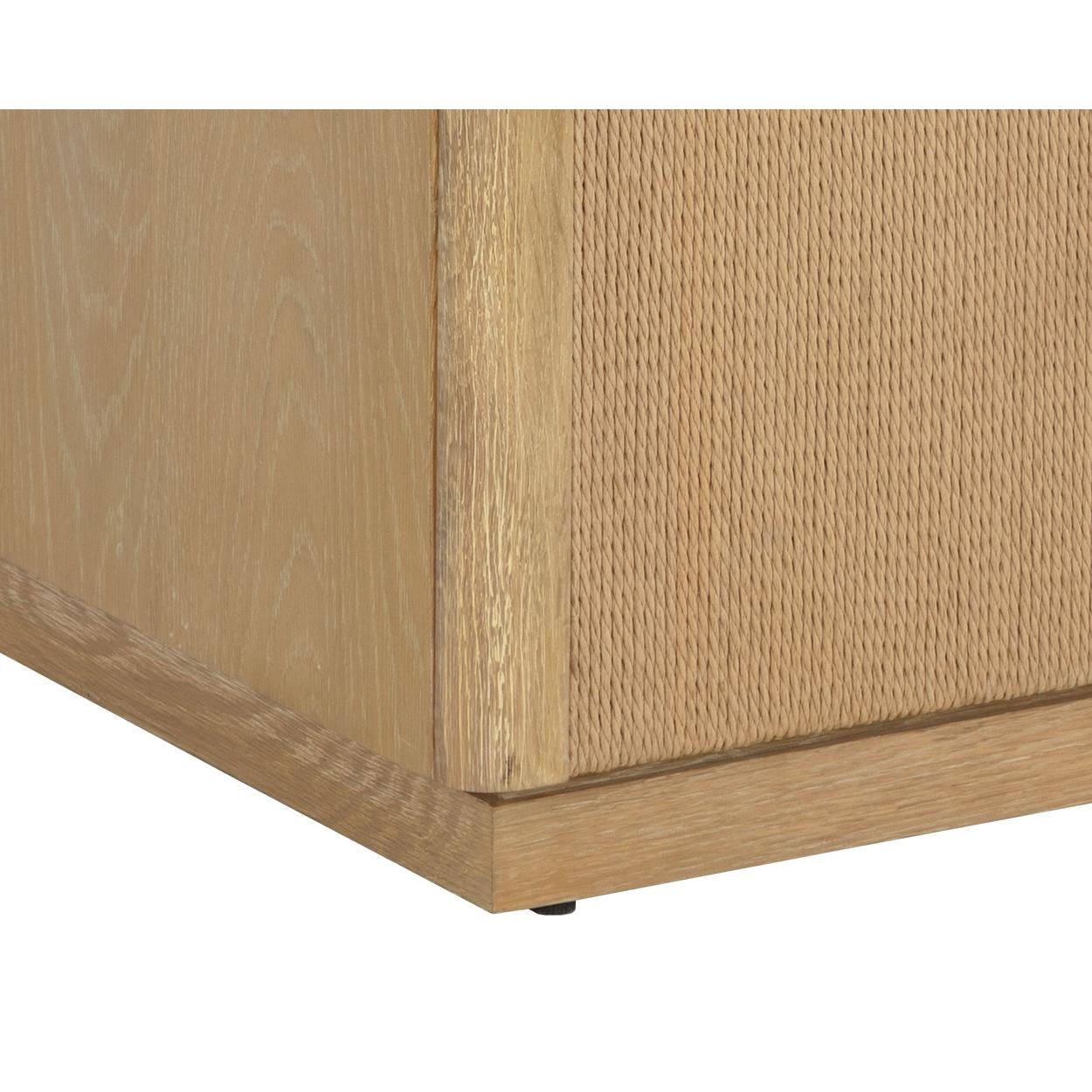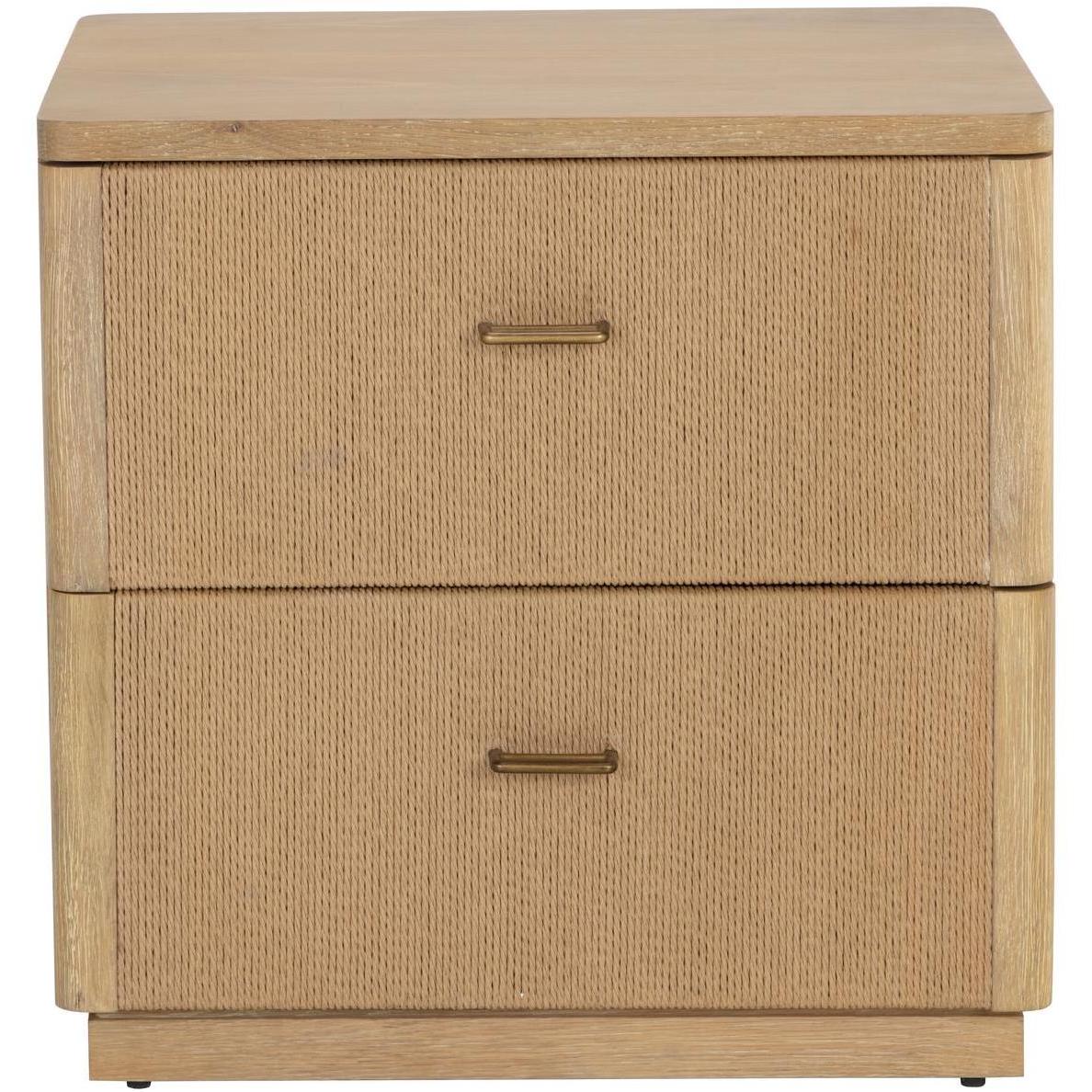 The Etienne Nightstand boasts a linear profile with a warm design. Constructed from a rustic oak veneer with solid oak wood legs and a matching rope covering on the doors. Antique brass handles complement the piece. As wood is an organic, porous material, these pieces will contain natural variation of texture and may also exhibit fine indentations and cracks. Wood pieces will also display a disparity of colour and grain, and visible knots and burls that add to the character of each piece.
