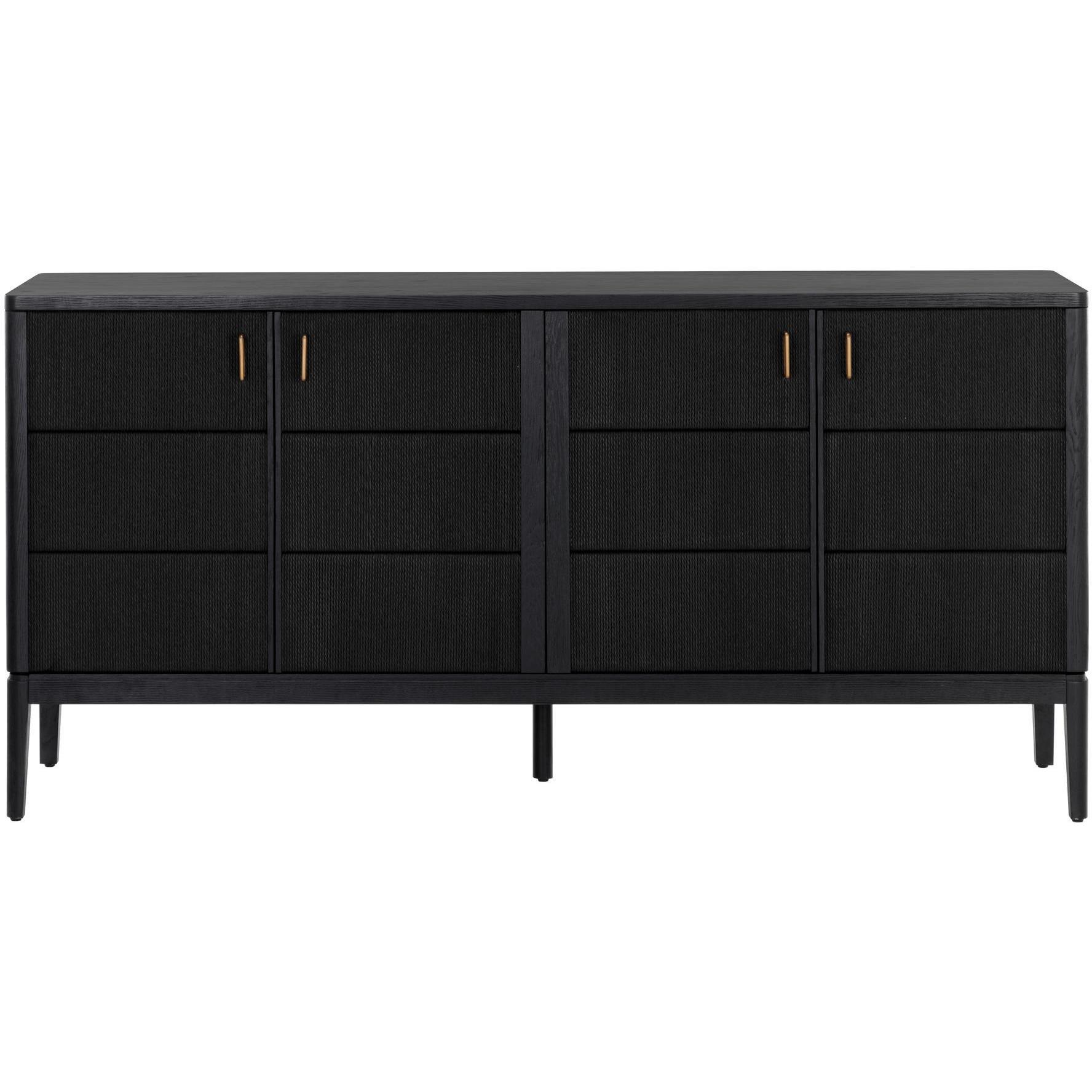 The Etienne Sideboard boasts a linear profile with a moody design. Constructed from a black oak veneer with solid black oak wood legs and a matching rope covering on the doors. Antique brass aluminium handles complement the piece. As wood is an organic, porous material, these pieces will contain natural variation of texture and may also exhibit fine indentations and cracks. Wood pieces will also display a disparity of colour and grain, and visible knots and burls that add to the character of each piece.