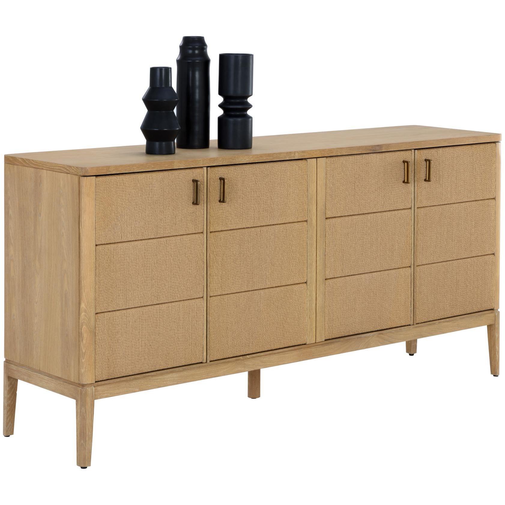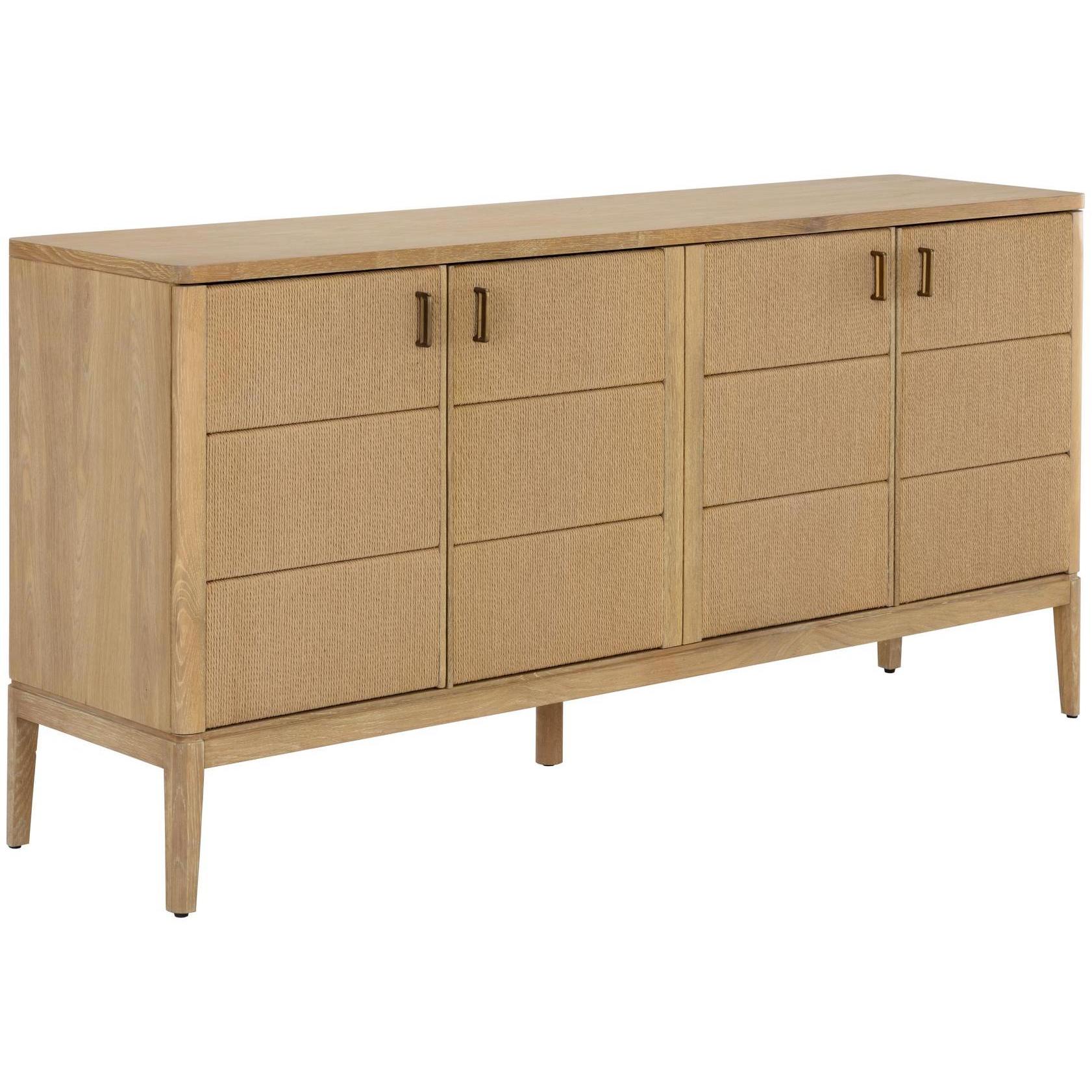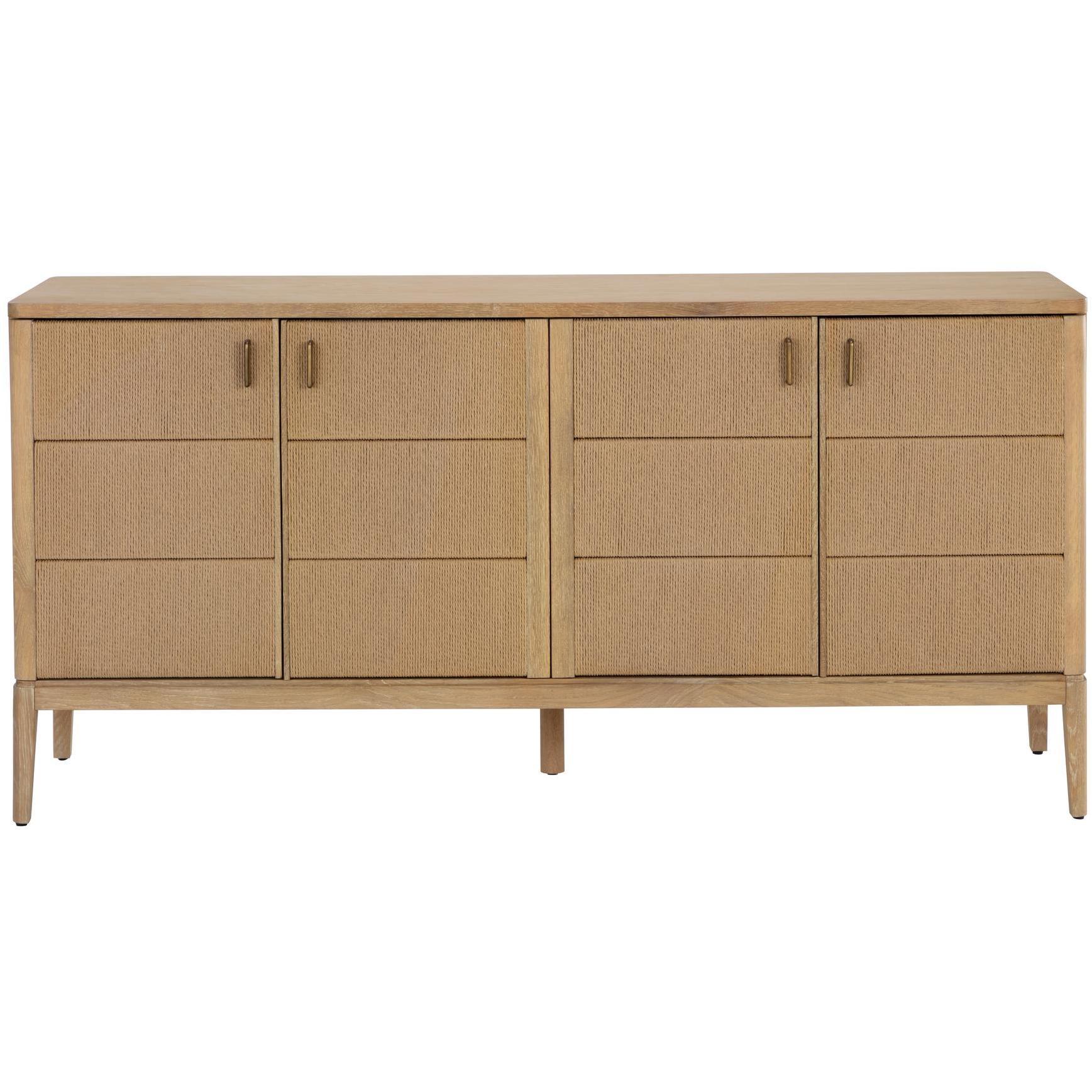 The Etienne Nightstand boasts a linear profile with a warm design. Constructed from a rustic oak veneer with solid oak wood legs and a matching rope covering on the doors. Antique brass handles complement the piece. As wood is an organic, porous material, these pieces will contain natural variation of texture and may also exhibit fine indentations and cracks. Wood pieces will also display a disparity of colour and grain, and visible knots and burls that add to the character of each piece.
