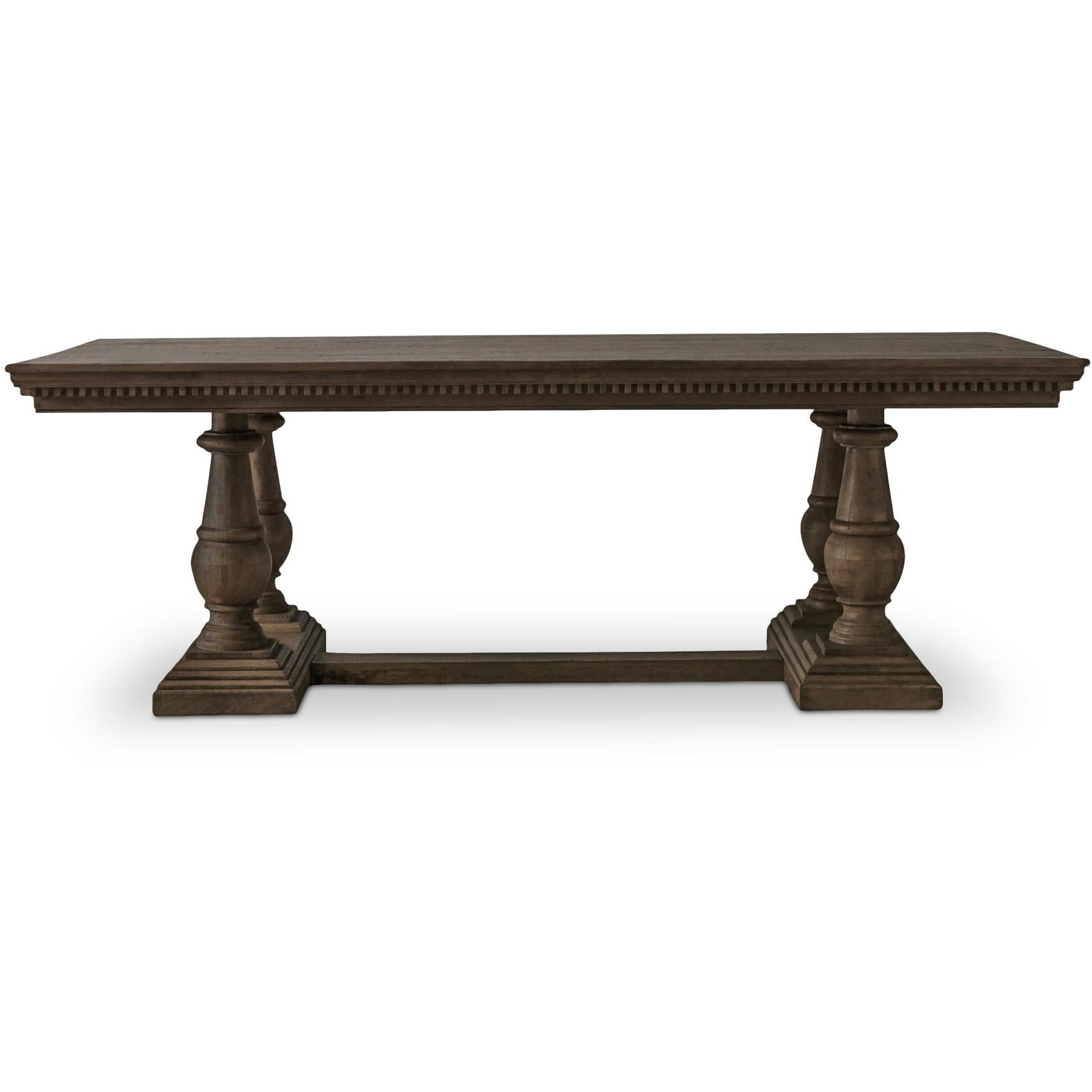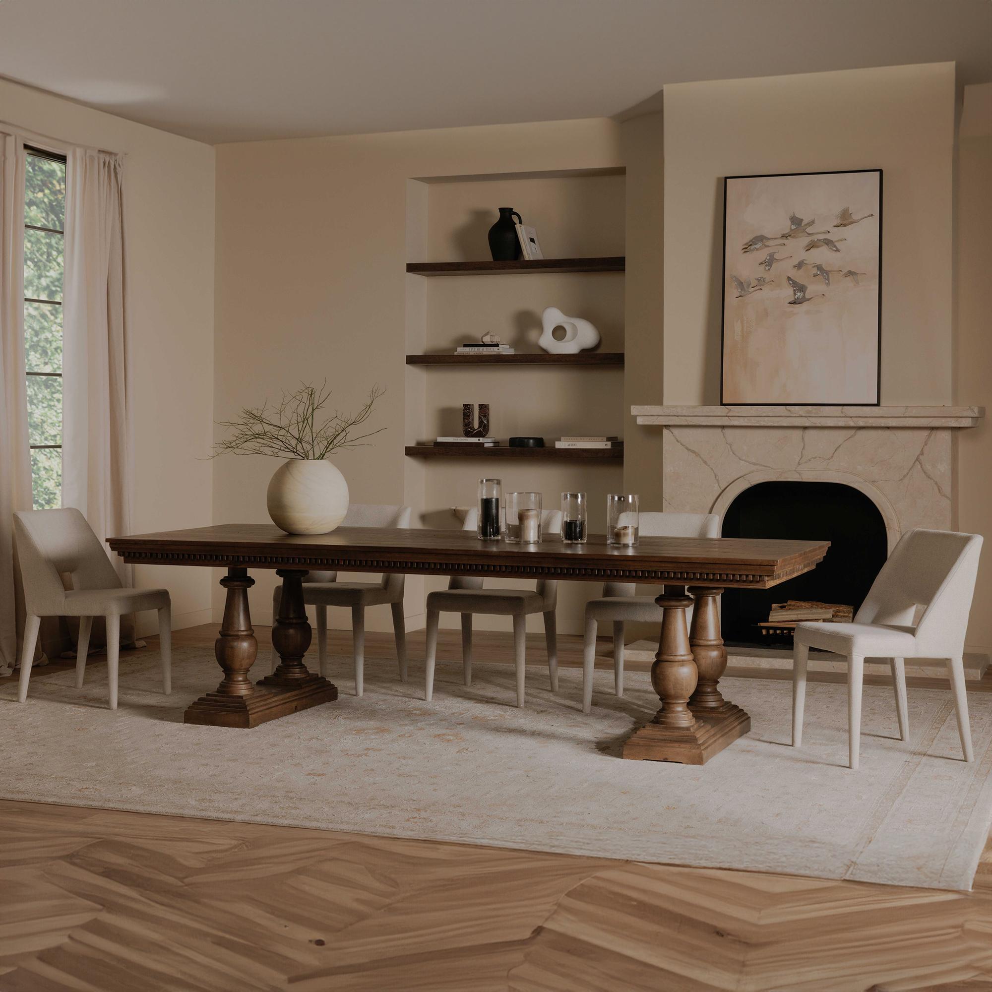 Crafted from sustainably sourced mango wood, the Everson dining table’s rich brown hue showcases intricate molding and classic leg profiles with a stretcher in between. Comfortably seating 8 to 10, this generous centerpiece invites memorable gatherings as every element is an invitation to come together.