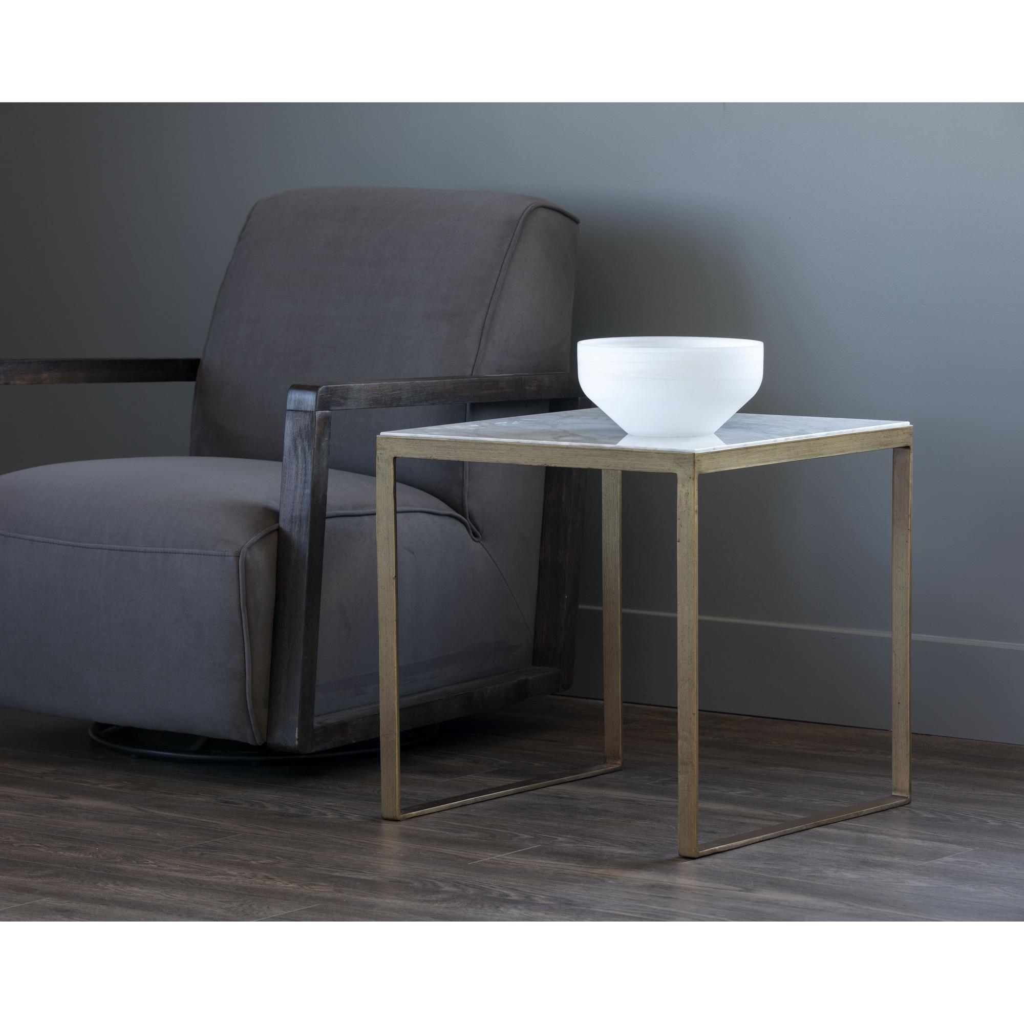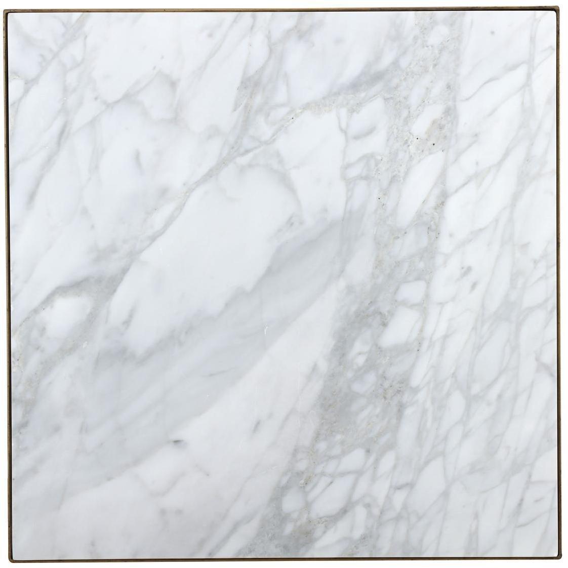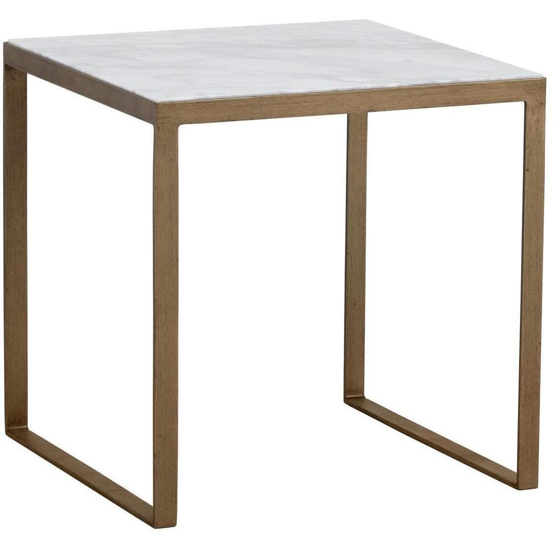 A beautiful modern marble end table. Tabletop features a 1″ layer of white Italian marble supported by an antique brass iron frame. As marble is a natural material, unique veining, pitting, fissures, micro-cracks and colour variations are all characteristics that add to the uniqueness and beauty of each piece.