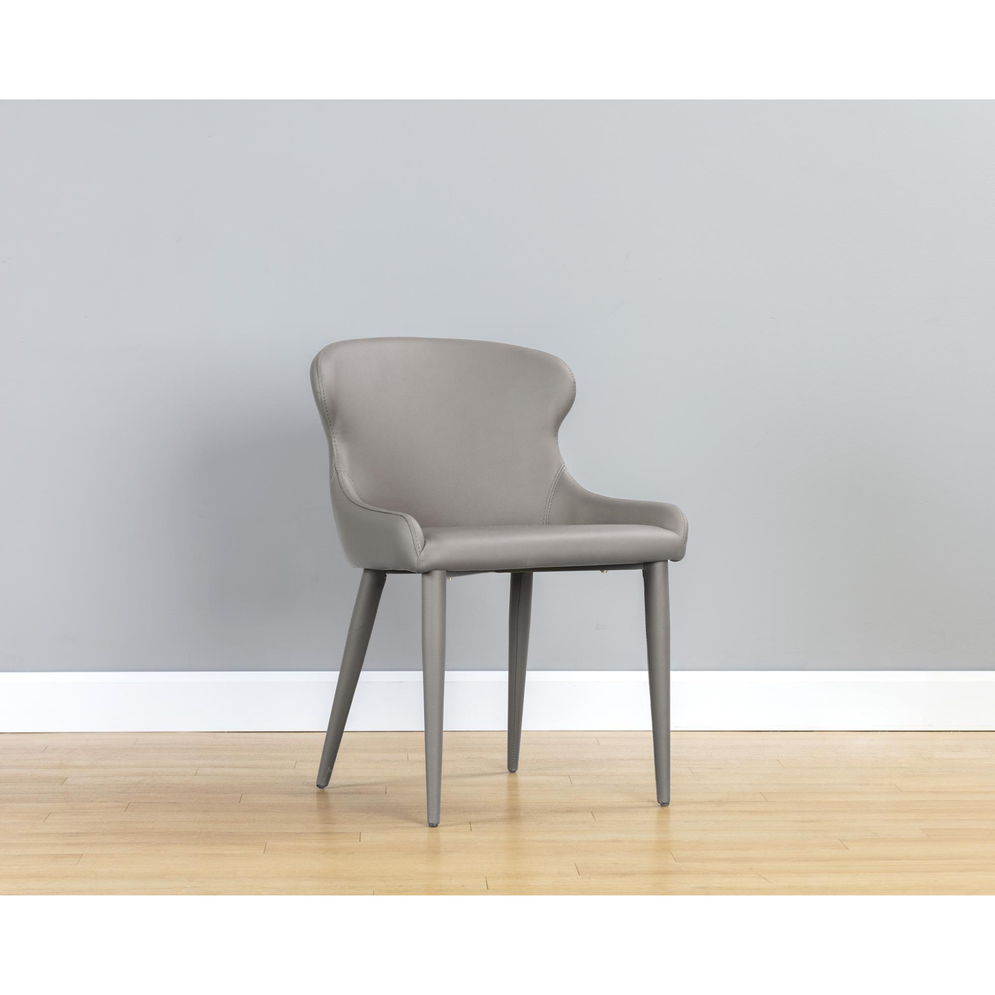 A gorgeous dining chair that features a sleek and minimal profile. Stylishly designed with tone-on-tone colours, this chair is stocked in dillon stratus faux leather and completed with metal upholstered legs. Also available in dillon thunder faux leather. Handle With Care: This design has been crafted with faux leather. Faux leather is manufactured to reflect the natural characteristics of leather; as such, colour variations, markings wrinkles, grooves, and light scratches are appreciated characteristics. No two pieces will be alike.