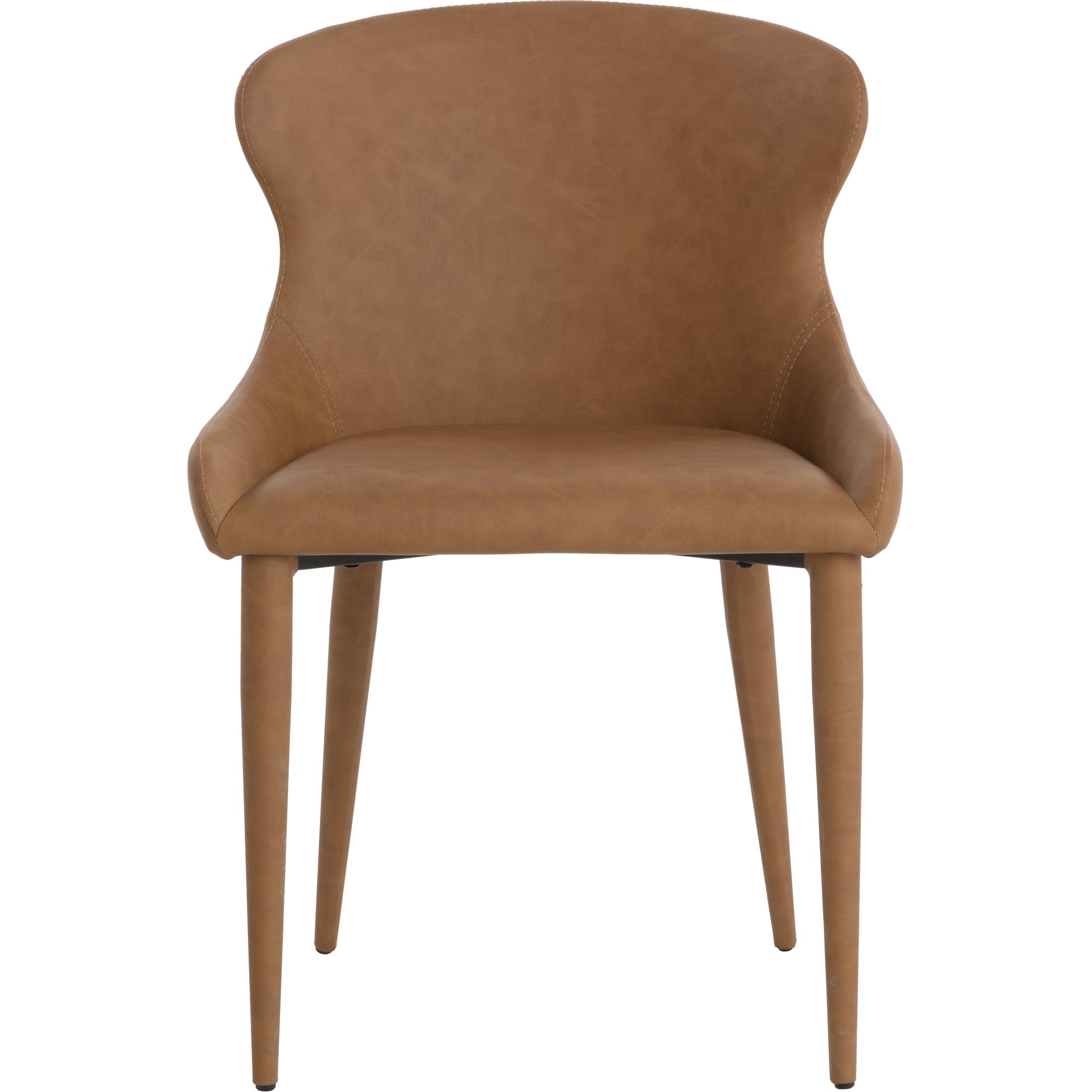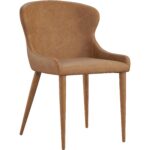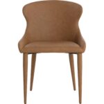 A gorgeous dining chair that features a sleek and minimal profile. Stylishly designed with tone-on-tone colours, this chair is stocked in milliken cognac faux leather and completed with metal upholstered legs.