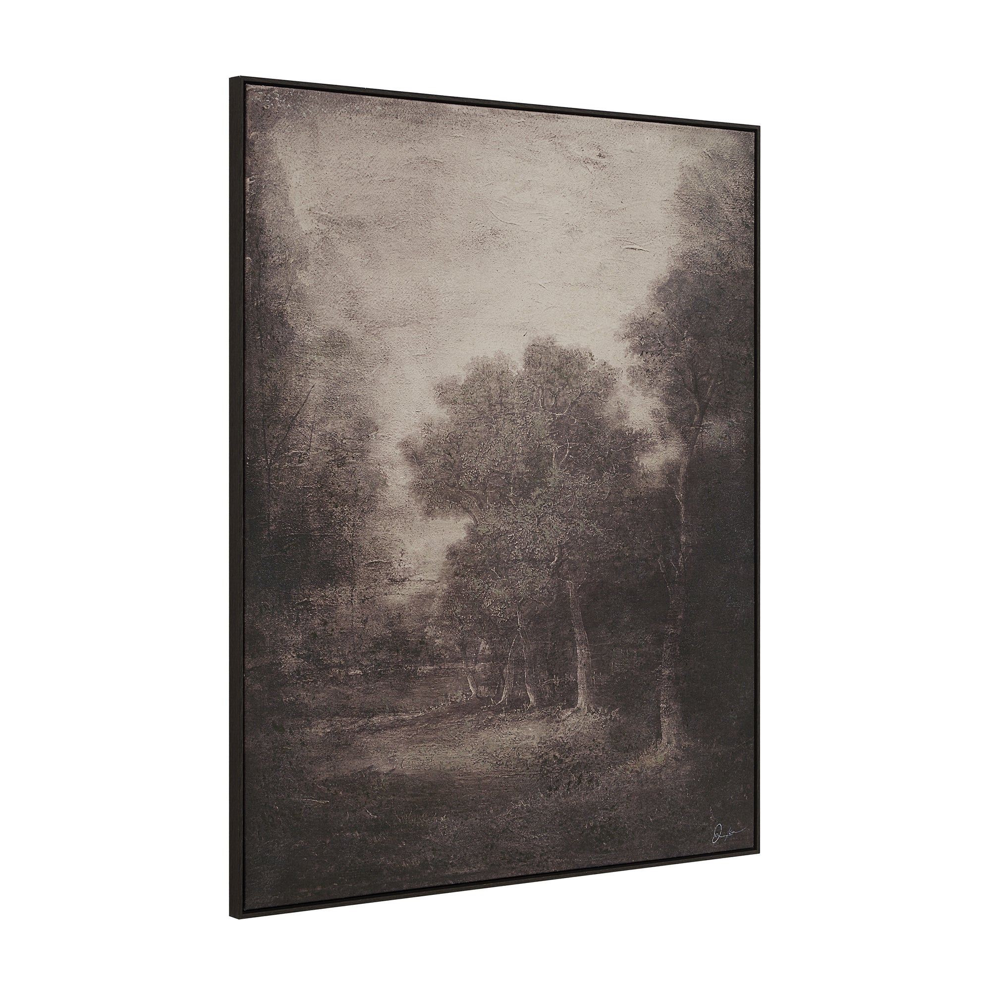 Evoke a serene, otherworldly mood with the Falco canvas wall art. Its soft tones and textured hand-painted gel details transform a simple landscape into a captivating, dreamlike scene. Housed in a dark wood floating frame, this piece delivers a striking balance of elegance and drama, making it an ideal focal point for moody, fashion-forward interiors.