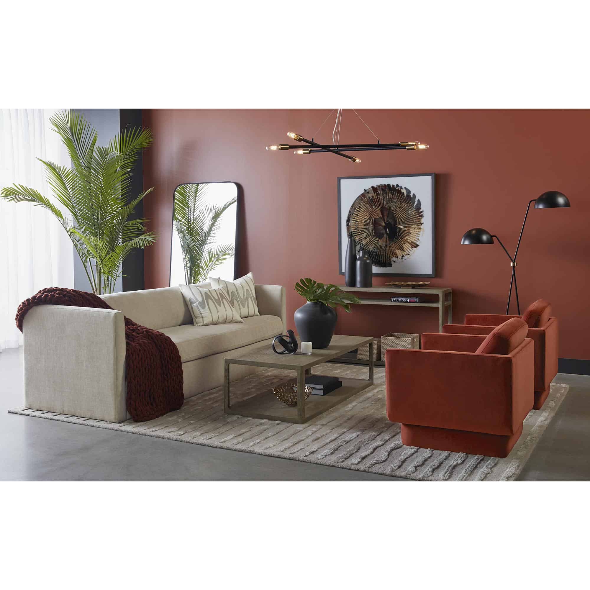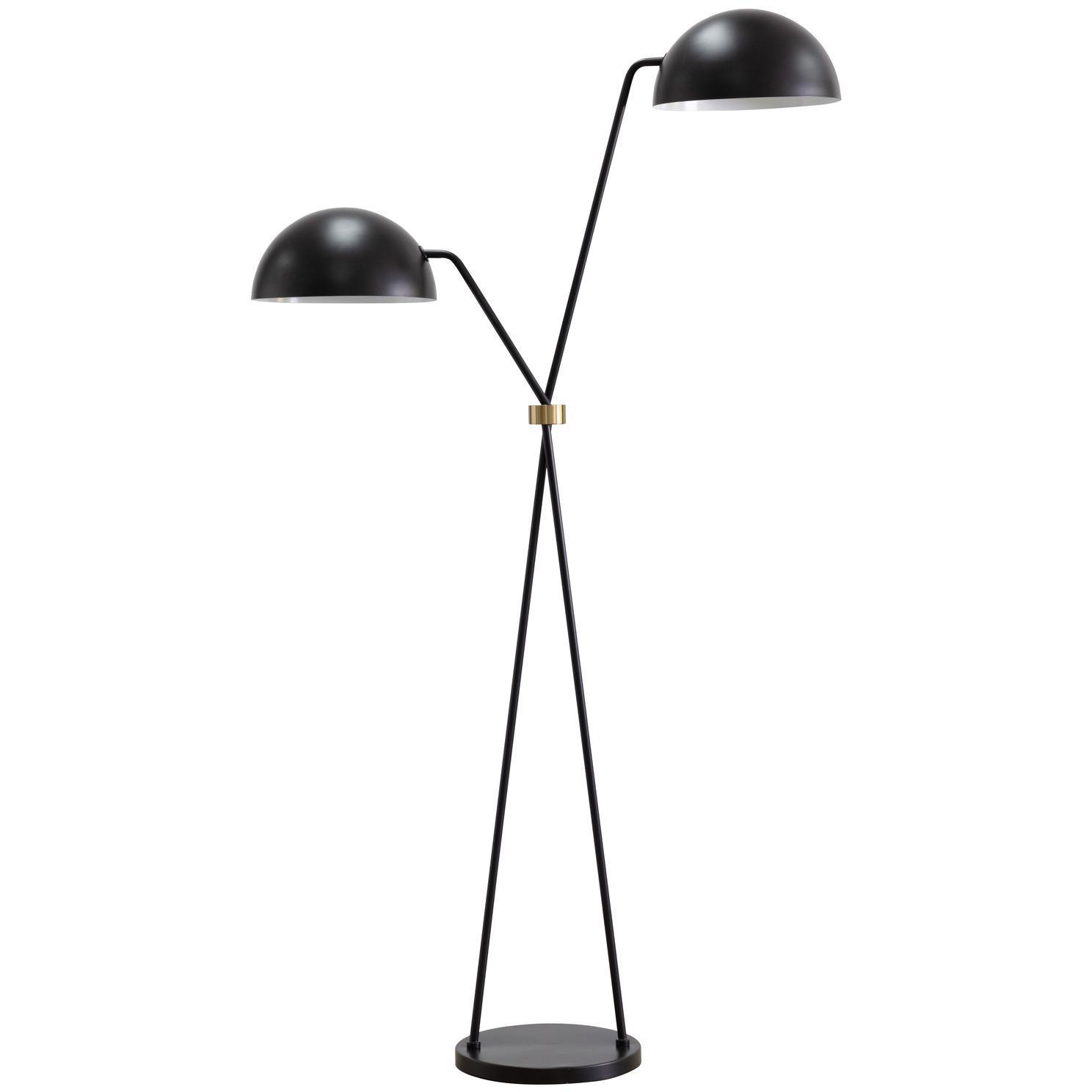 Modern illumination is defined in this dual-domed floor lamp. Features a sturdy powder-coated black iron base with two sleek poles of varying heights crossed together with a brass iron ring. Black lamp shades complete the look.