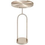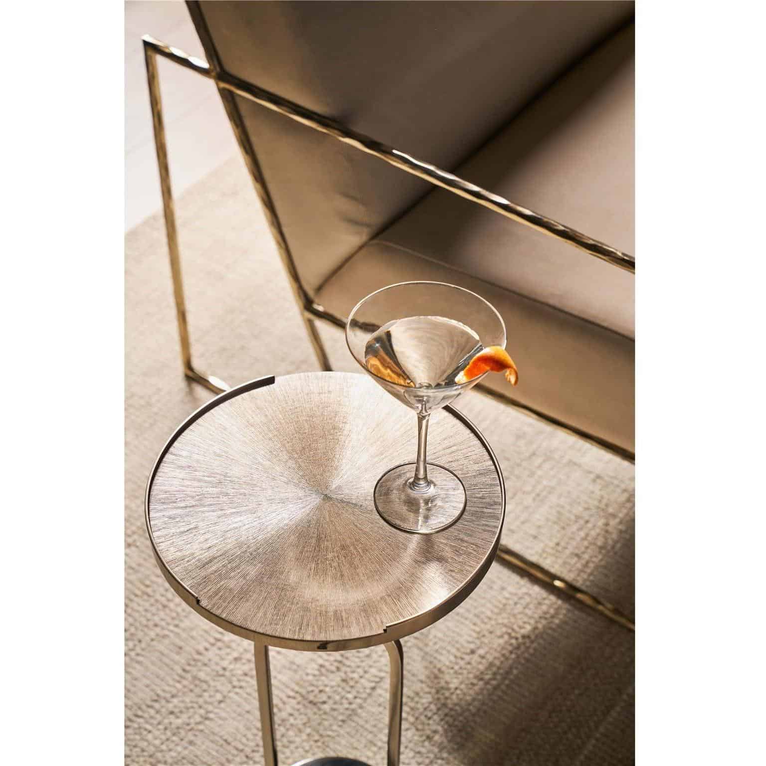 The Fawn Martini Table exudes glamour and luxury with its lustrous Champagne Gold metal finish. Featuring a succinct round top poised elegantly atop a slender, curvaceously cool base, this table brings a radiant shine and sophisticated flair to any setting, encapsulating the essence of upscale charm.