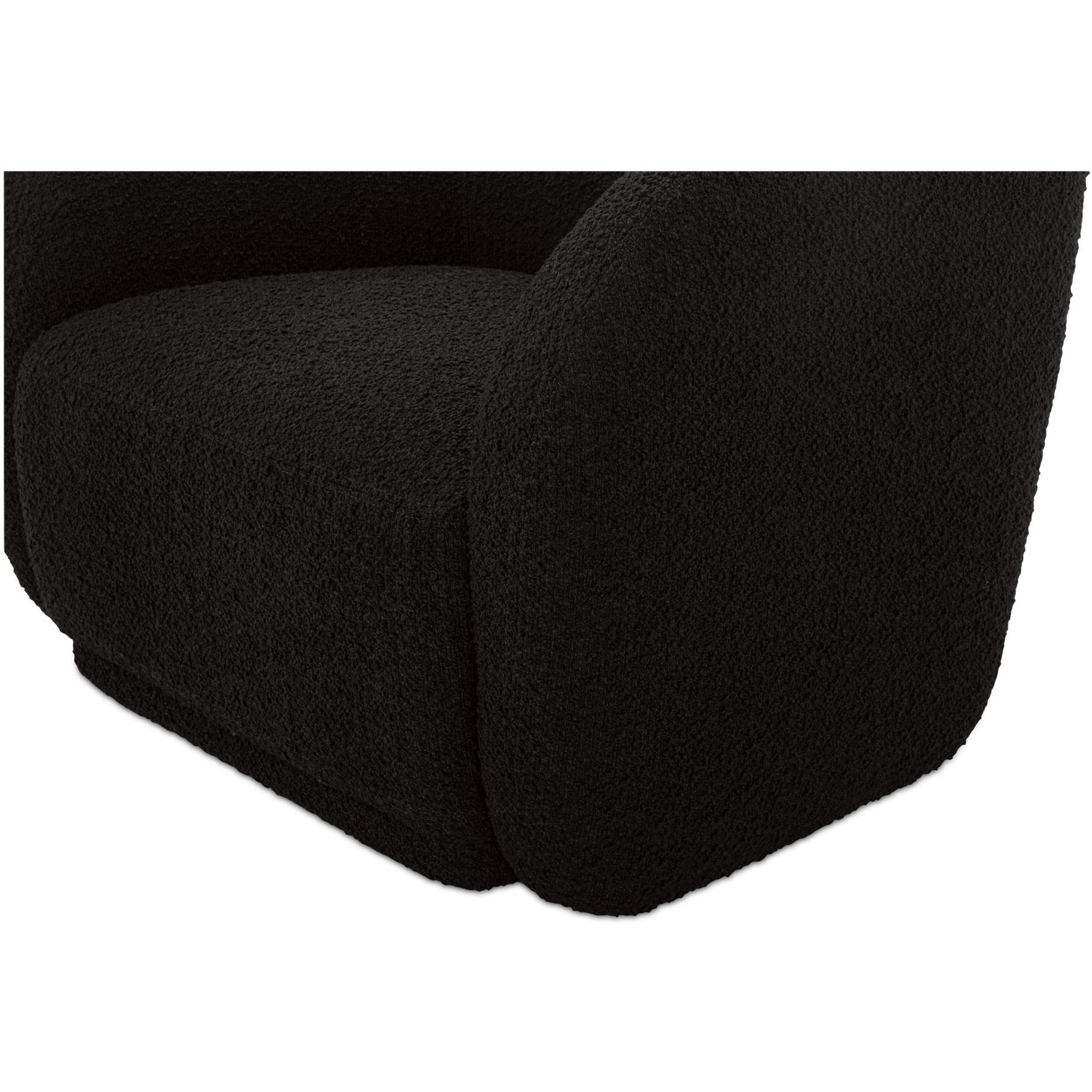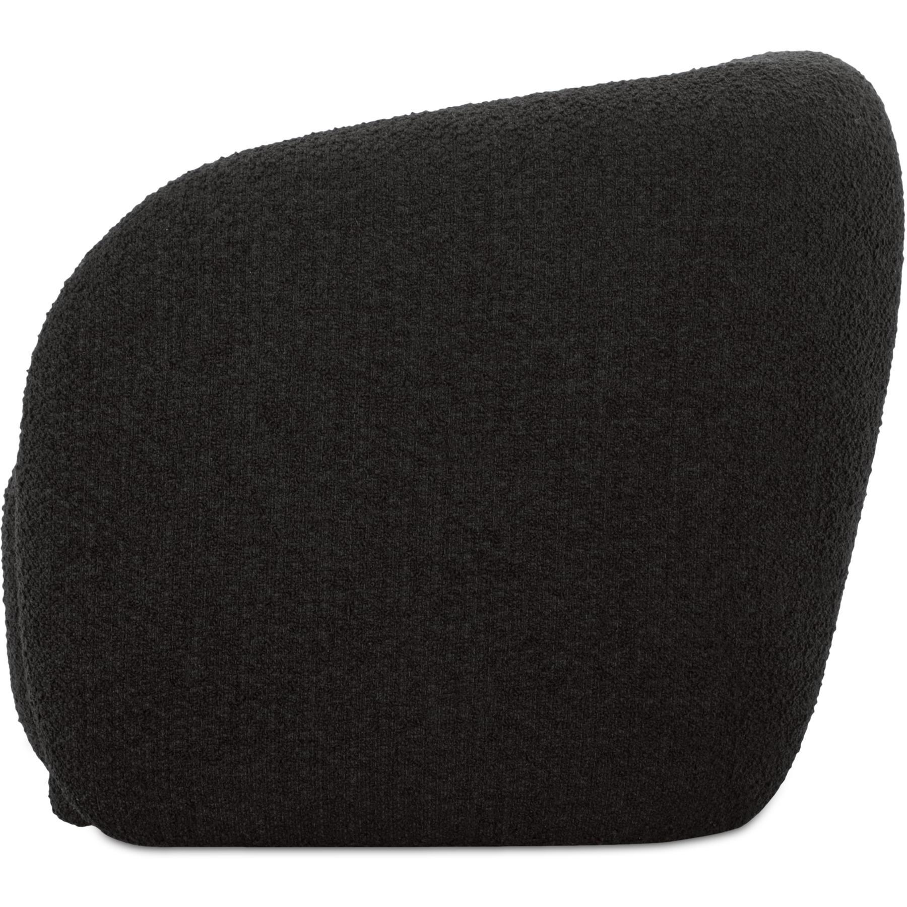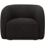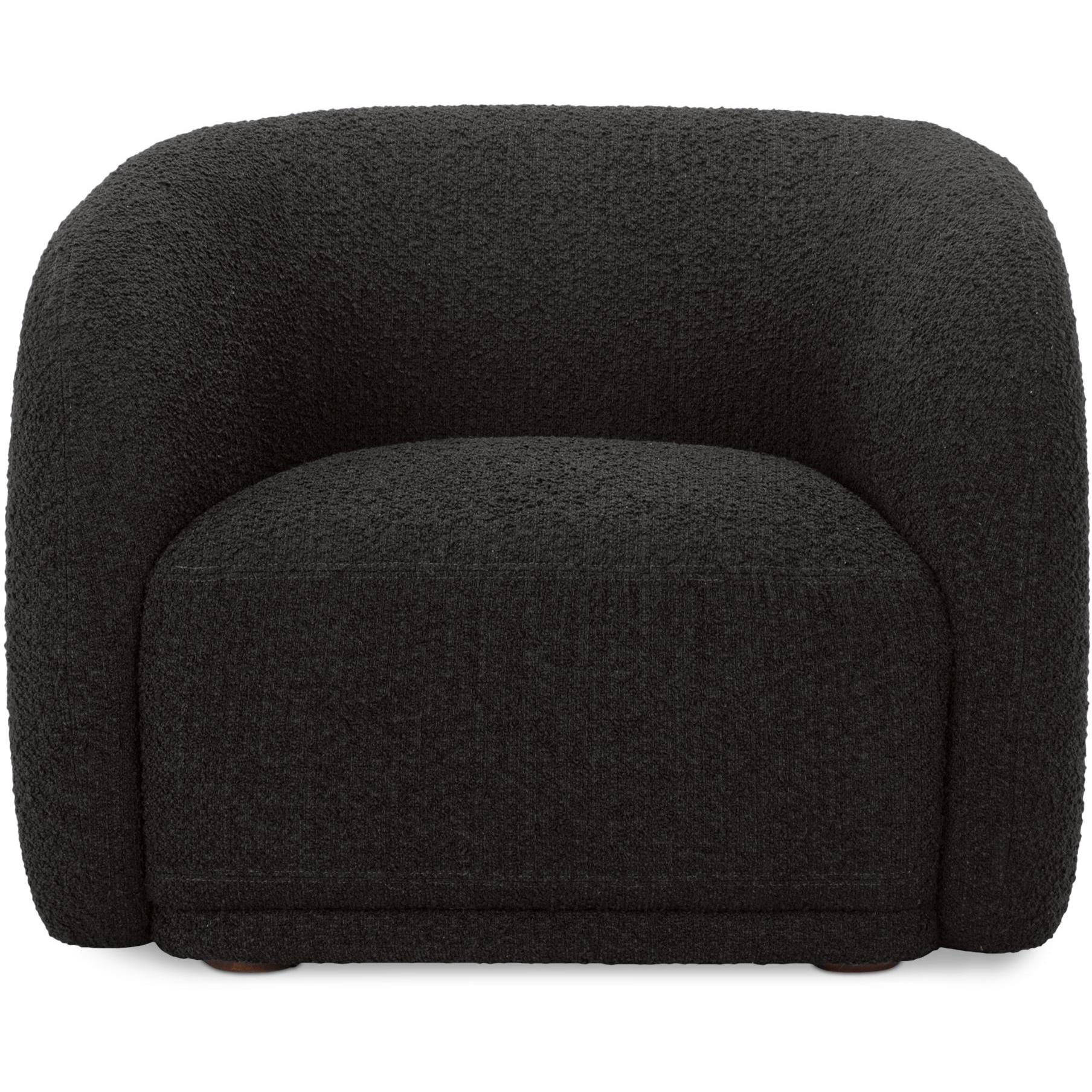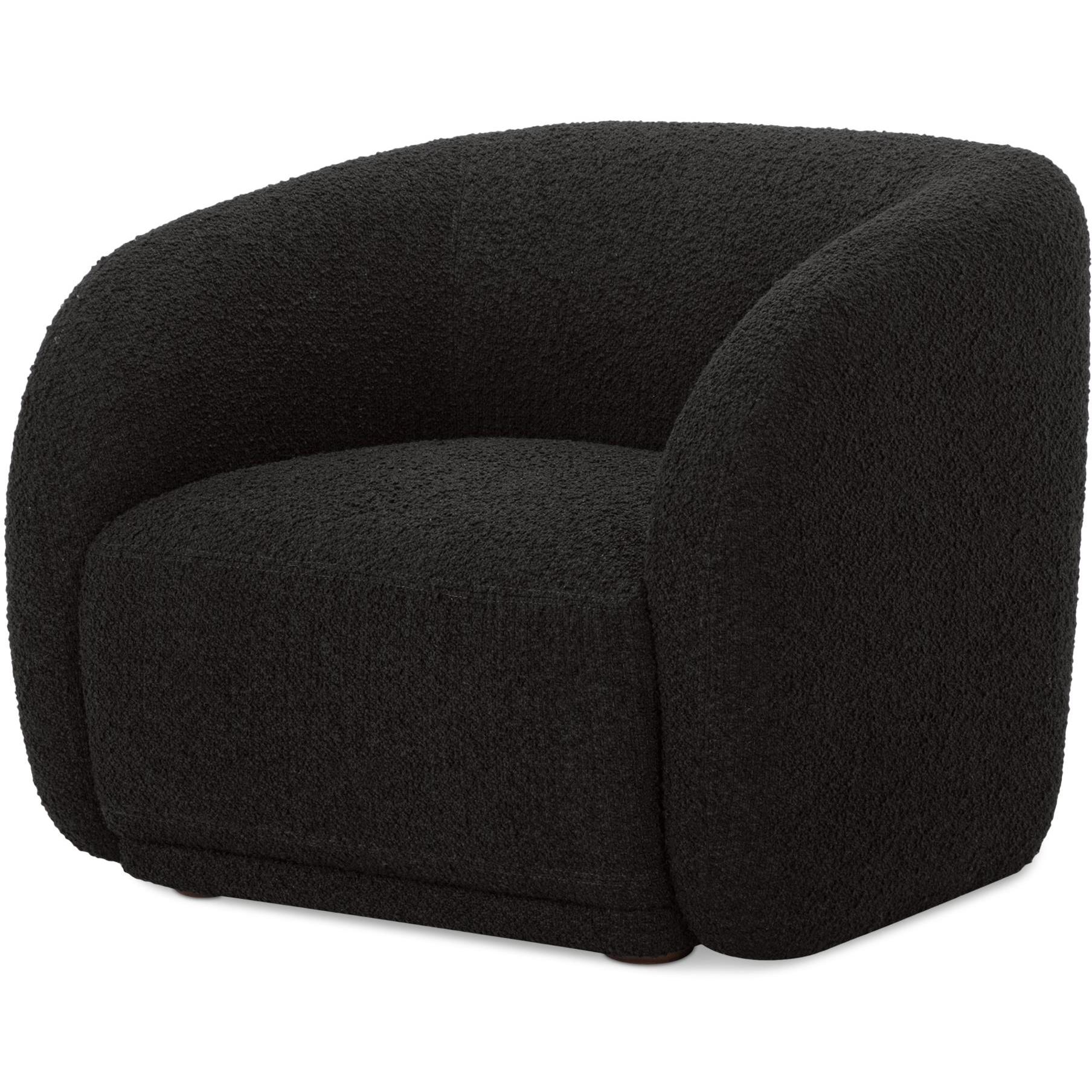 Constructed from solid beech and plywood, the Faye accent chair’s unique curved back and firm, fixed bench seat rest on petite, rounded rubberwood legs. The exaggerated boucle fabric has a robust 100,000 rub count bringing depth and an art deco feel to its contemporary form–a touch of elegance to expansive living.