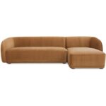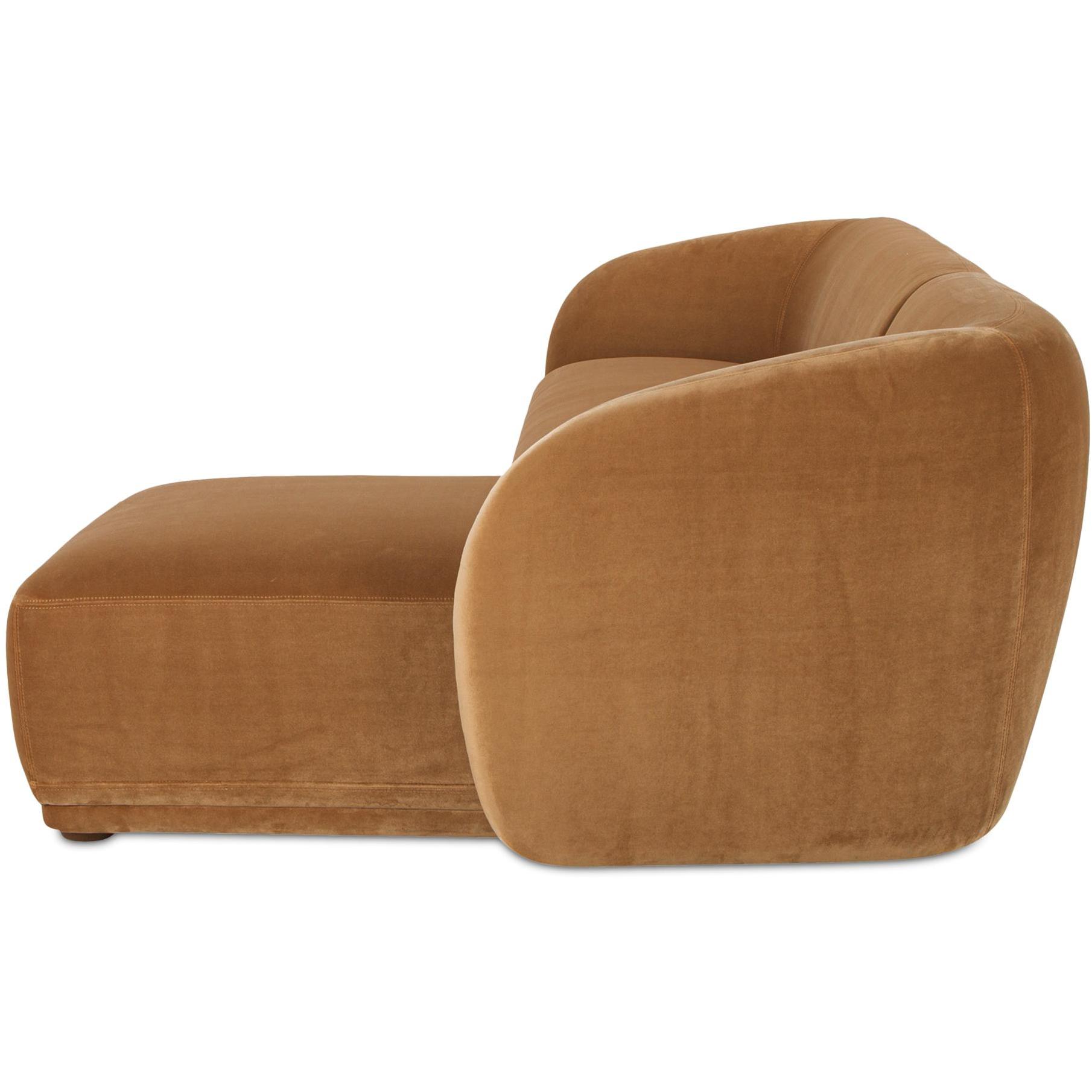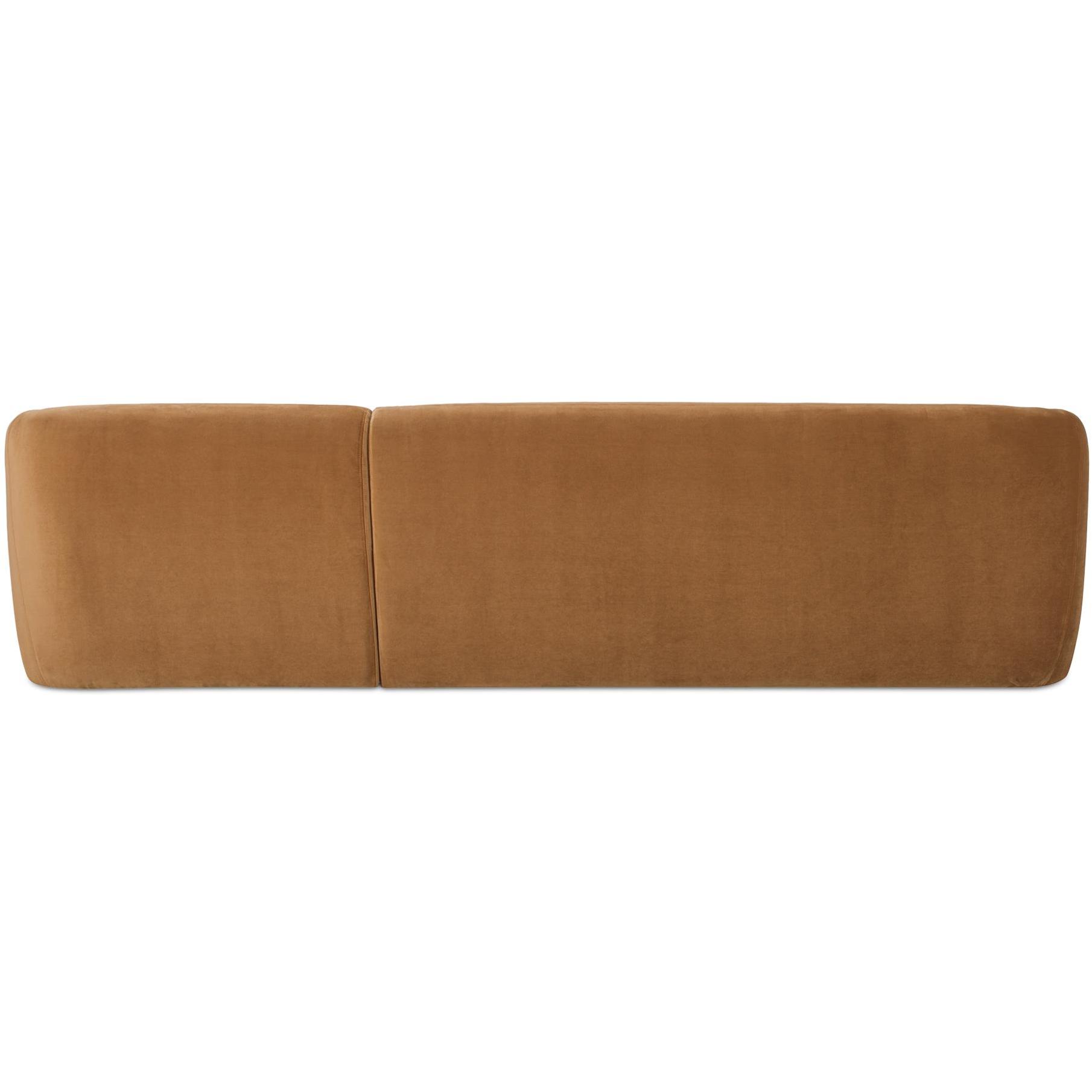 Constructed from solid beech and plywood, the Faye sectional’s unique curved back and firm, fixed bench seat rest on petite, rounded rubberwood legs. The neutral tan and faux mohair fabric is denser and more plush than velvet, bringing durability and comfort to its contemporary form–a touch of elegance to expansive living.