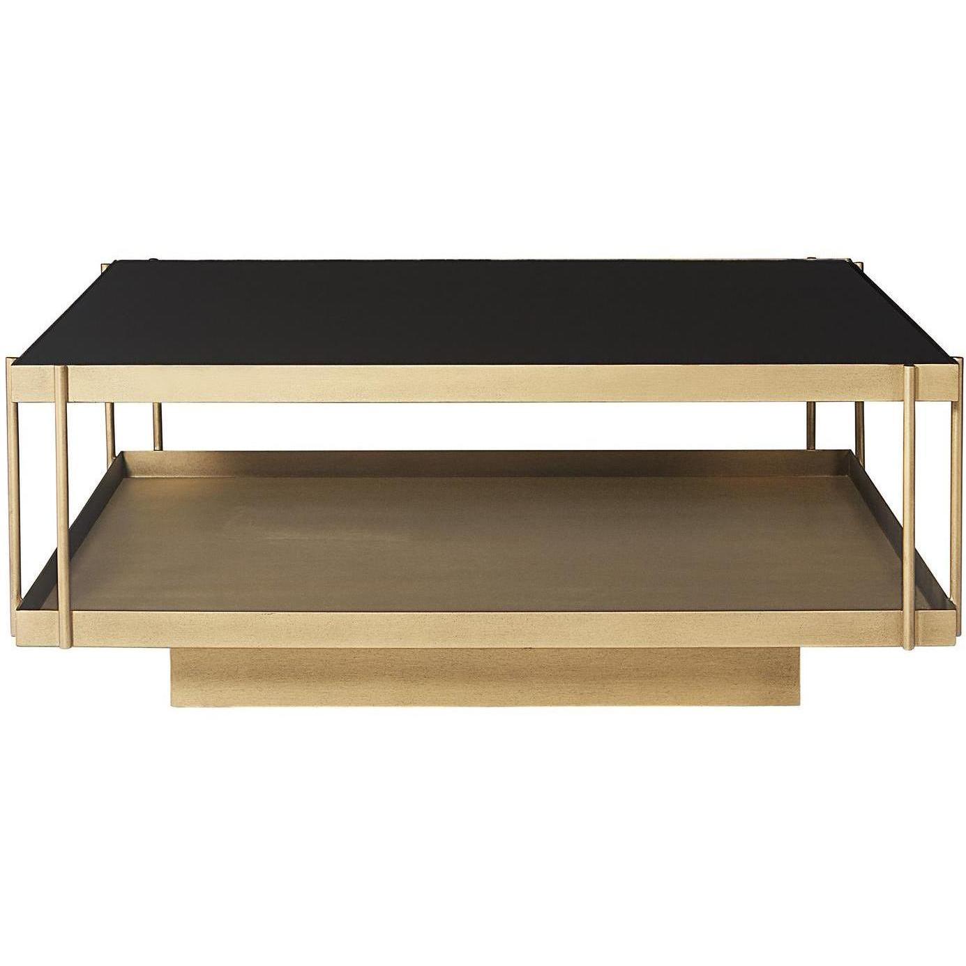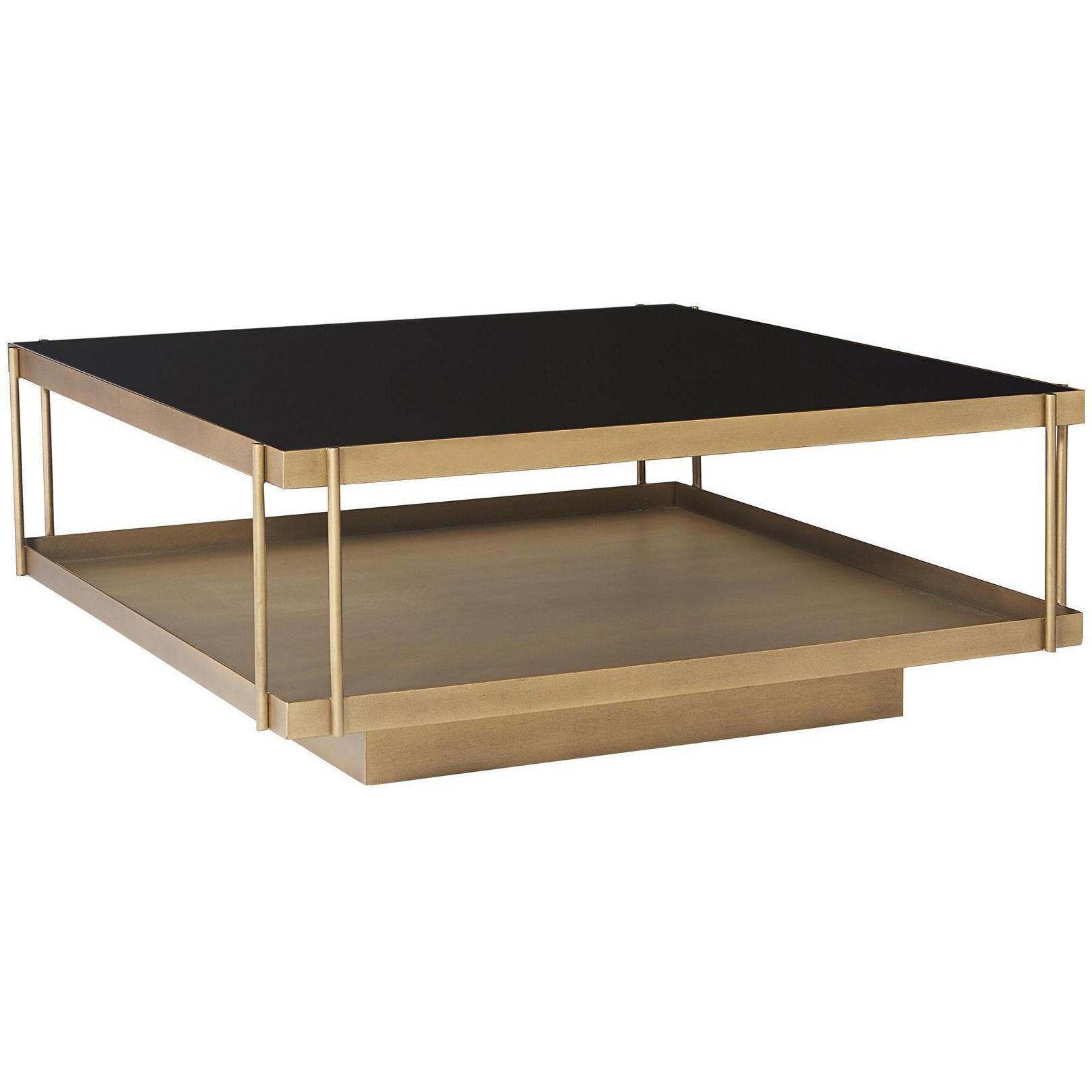 This large square coffee table combines mid-century style with an elevated flair. Designed with a stunning black glass top and exposed antique brass shelf, this coffee table will draw attention in any living and lounge space.