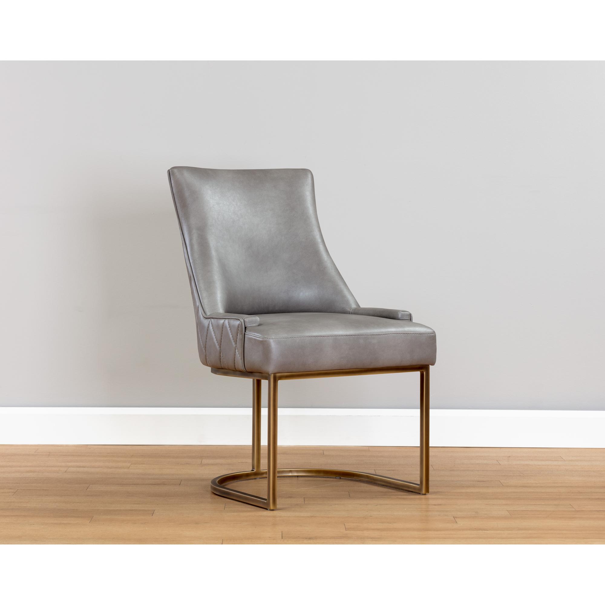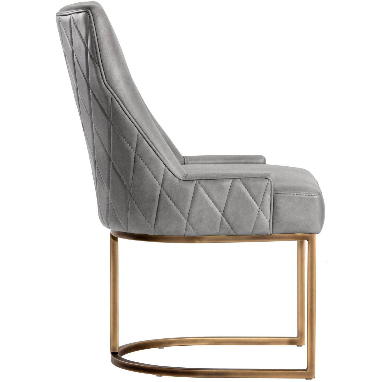 This dining chair offers transitional elegance. Features a beautifully sculpted seat in our bravo metal faux leather with a rustic bronze cantilever frame. A diamond stitched pattern on the exterior seatback adds a touch of beauty to complete the look. Handle With Care: This design has been crafted with faux leather. Faux leather is manufactured to reflect the natural characteristics of leather; as such, colour variations, markings, wrinkles, grooves, and light scratches are appreciated characteristics. No two pieces will be alike.