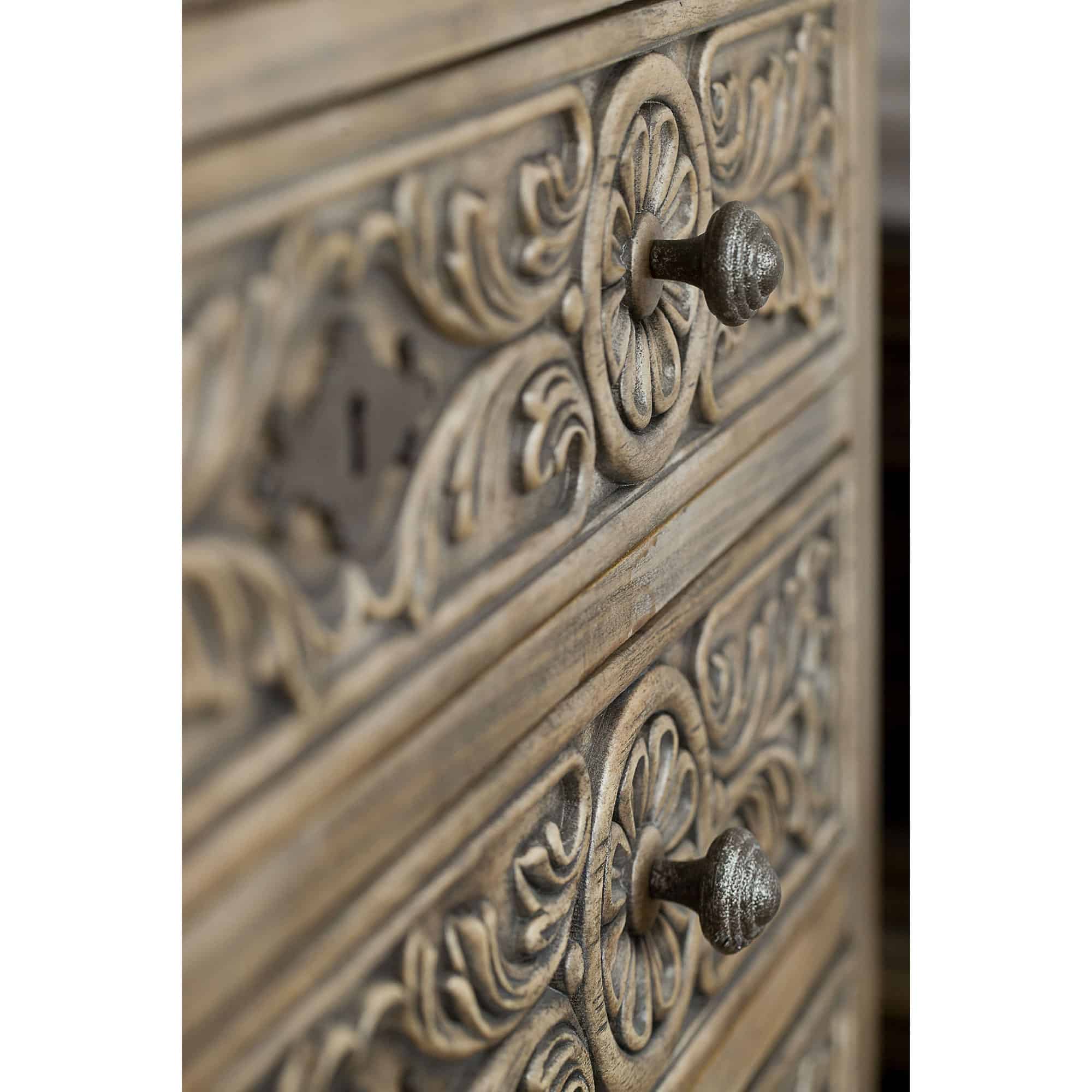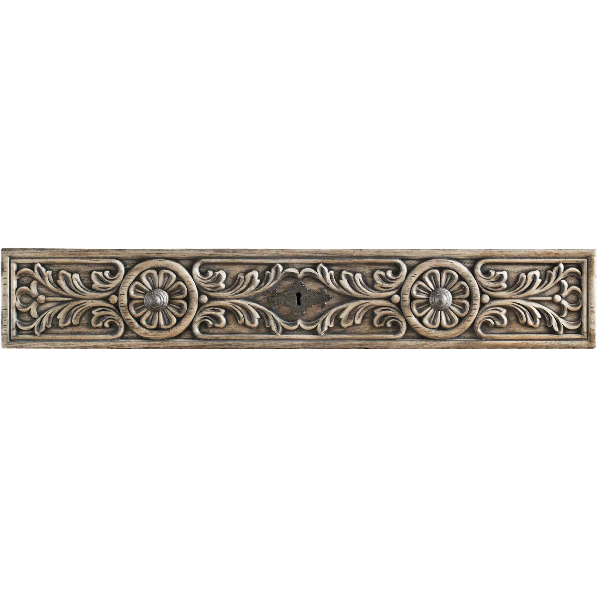 Finish: MWD: This accent finish was inspired by native Sandstone with characteristic aged black highlights that has been quarried in the Texas Hill Country for centuries. The custom-crafted hardware in an aged pewter finish has shaped back plates and is inspired by hand-wrought ironworks from Texas Hill Country. Distressing includes rasping, hand planking, chopping and worm holes.