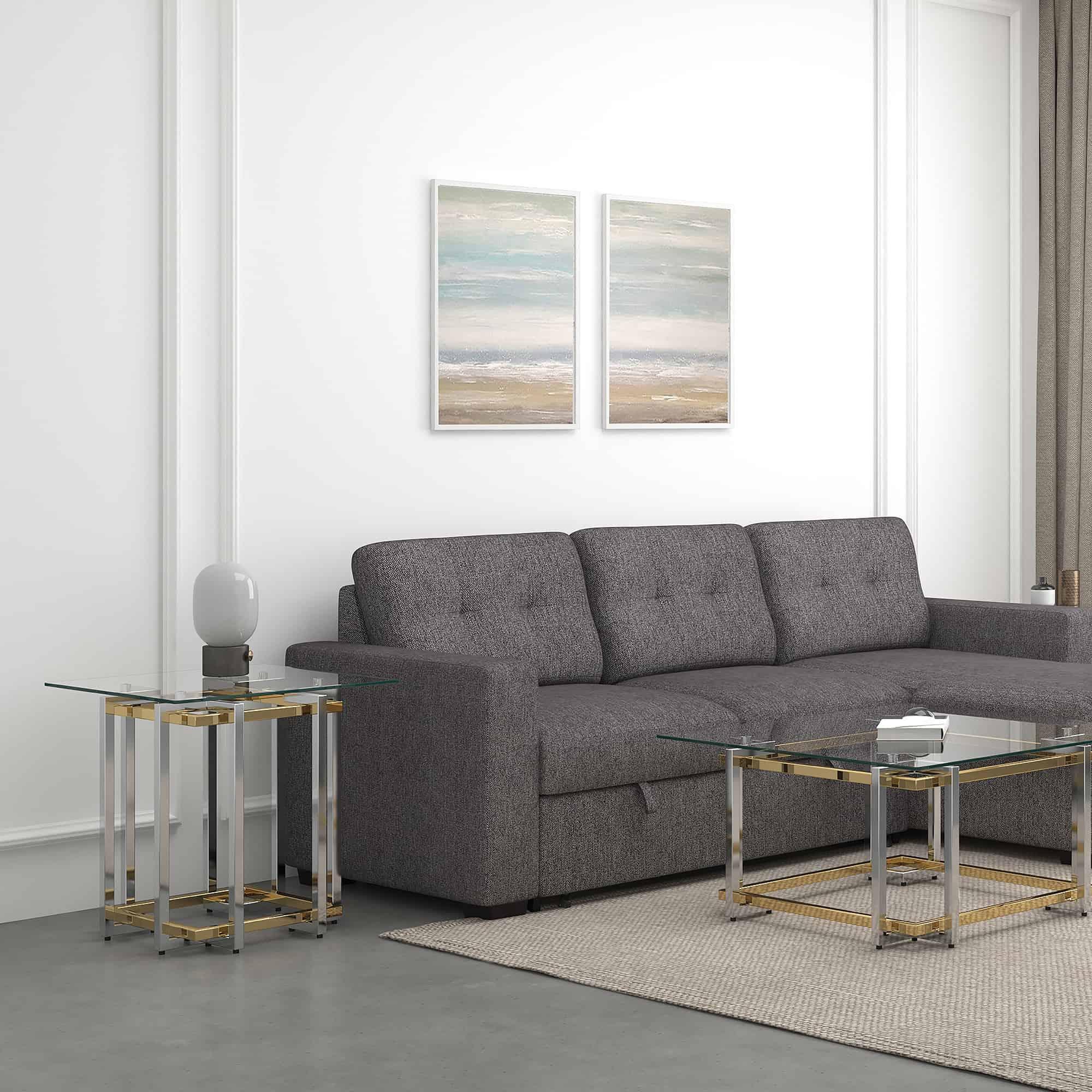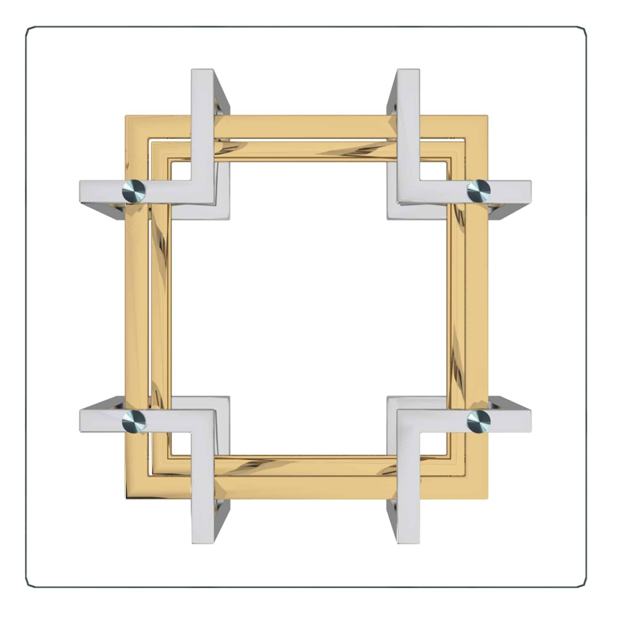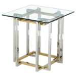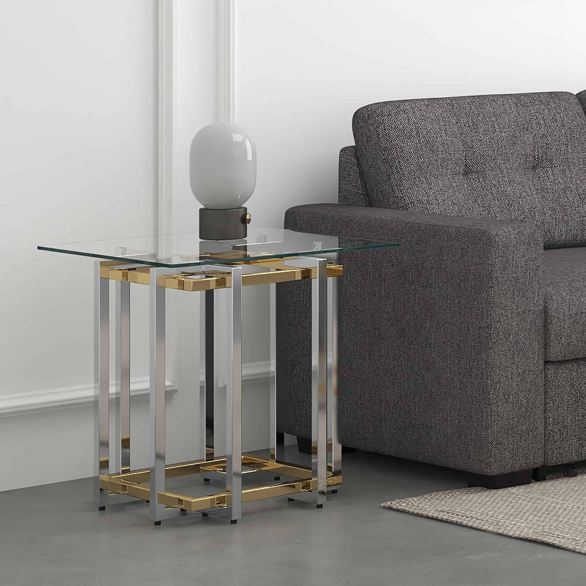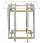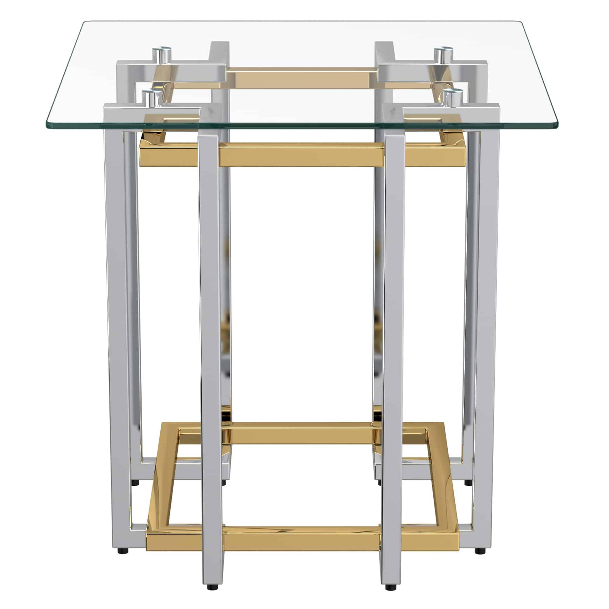 Stylish contemporary metal and glass accent table with an interlaced gold and silver finish. The geometric design and the glass top gives this piece an airy look that will add beauty and function without being overbearing. Great as a side table in a living room or bedroom.