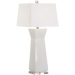 Handsome angular ceramic lamp in white on a clear acrylic base. The epitome of tailored elegance. Designed by Jamie Merida.