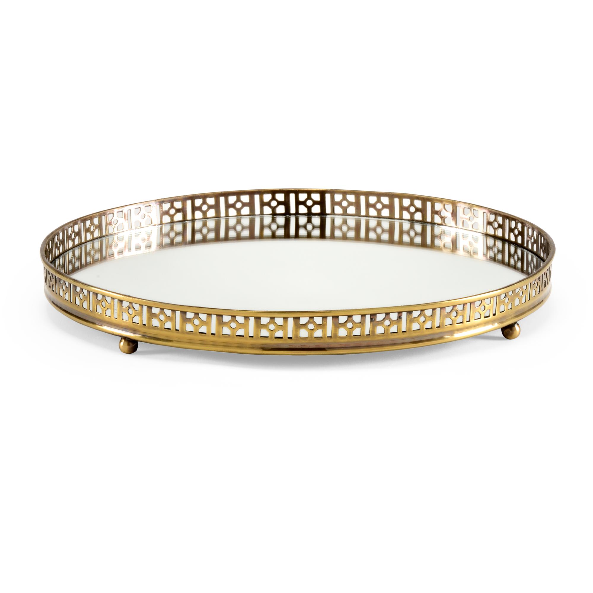 Bring elegance and sophistication to your space with this Footed Vanity Tray. Fretwork detailing is crafted in antiqued brass and surrounds a clear round mirror. Organize cologne in your bathroom or use as an accent on a table or ottoman. Perfect for displaying your favorite smaller trinkets to reflect their beauty.
