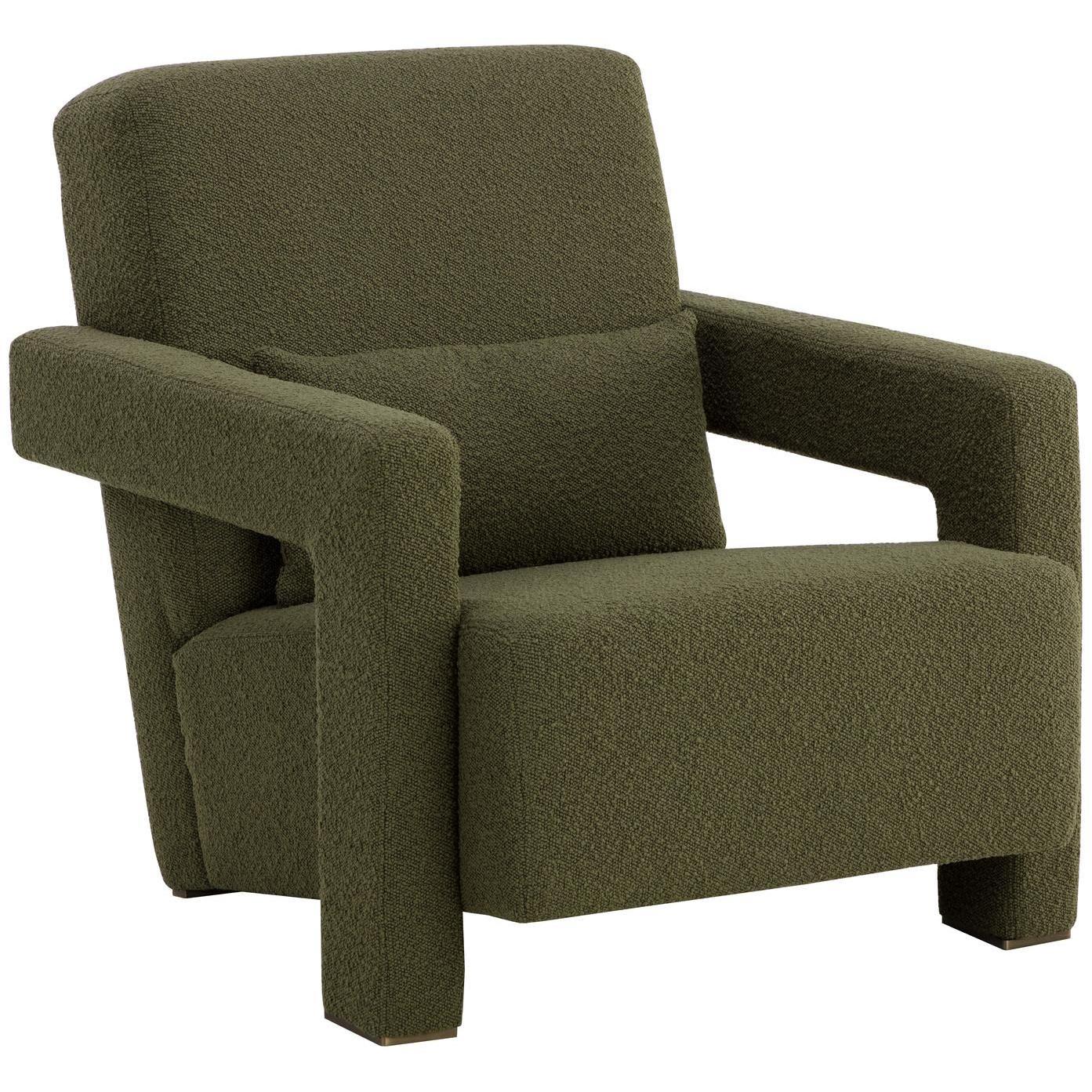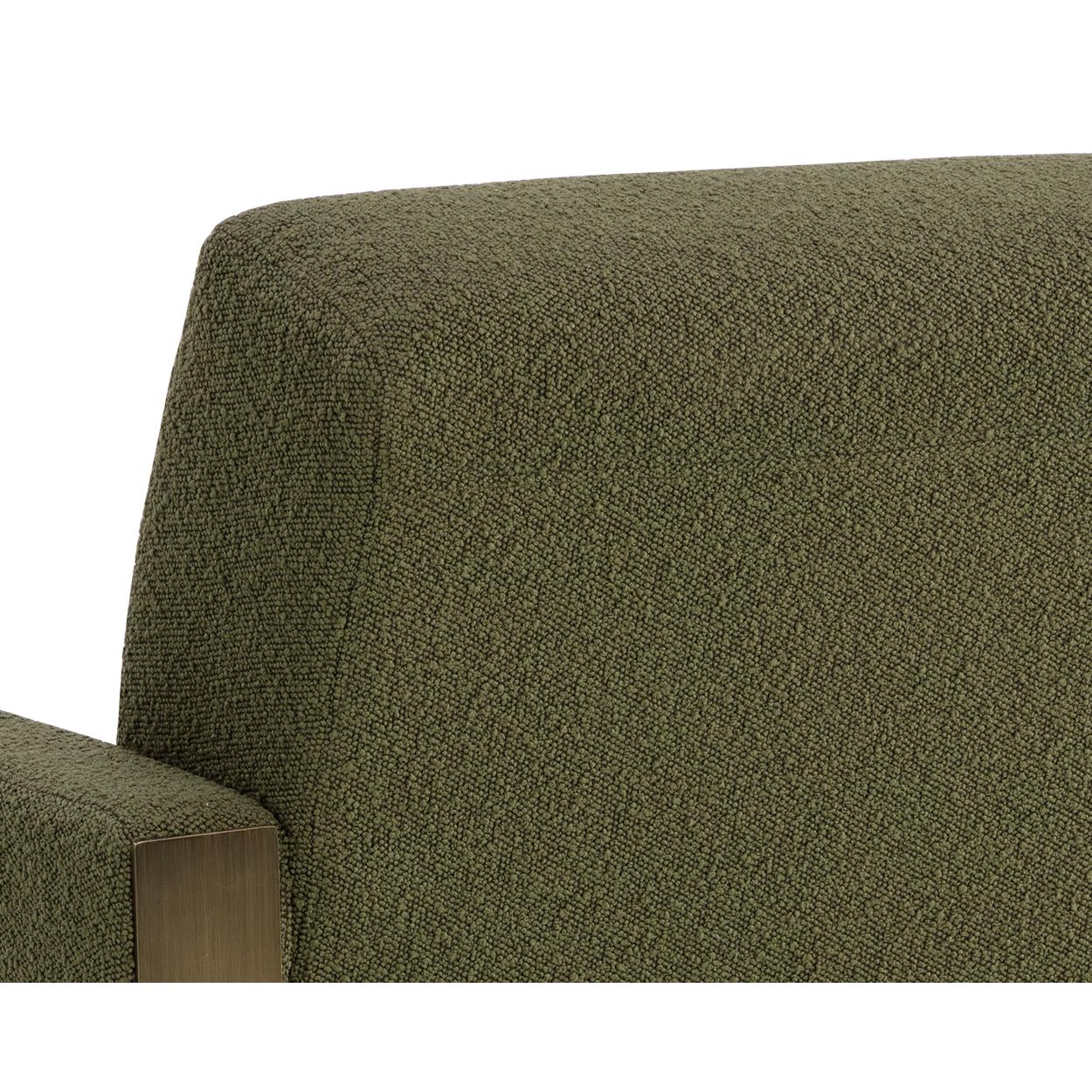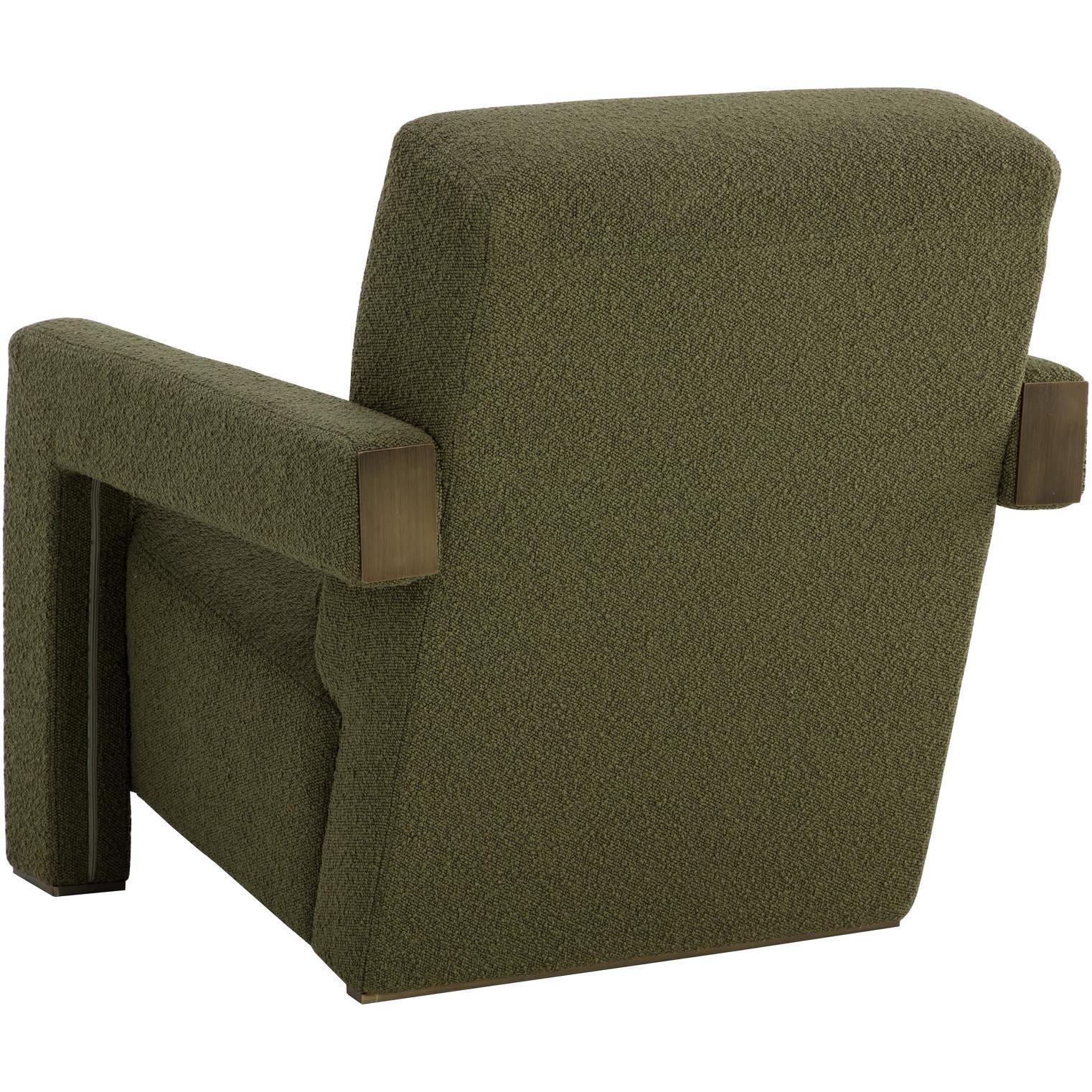Strong angles and plush seating allow the Forester Lounge Chair to stand out in any living space. Upholstered in copenhagen olive fabric with sculpted arms that give the reclining seat a floating appearance. Metal accents at the back of the armrests match the powder coated antique gold stainless steel base to finish the look.
