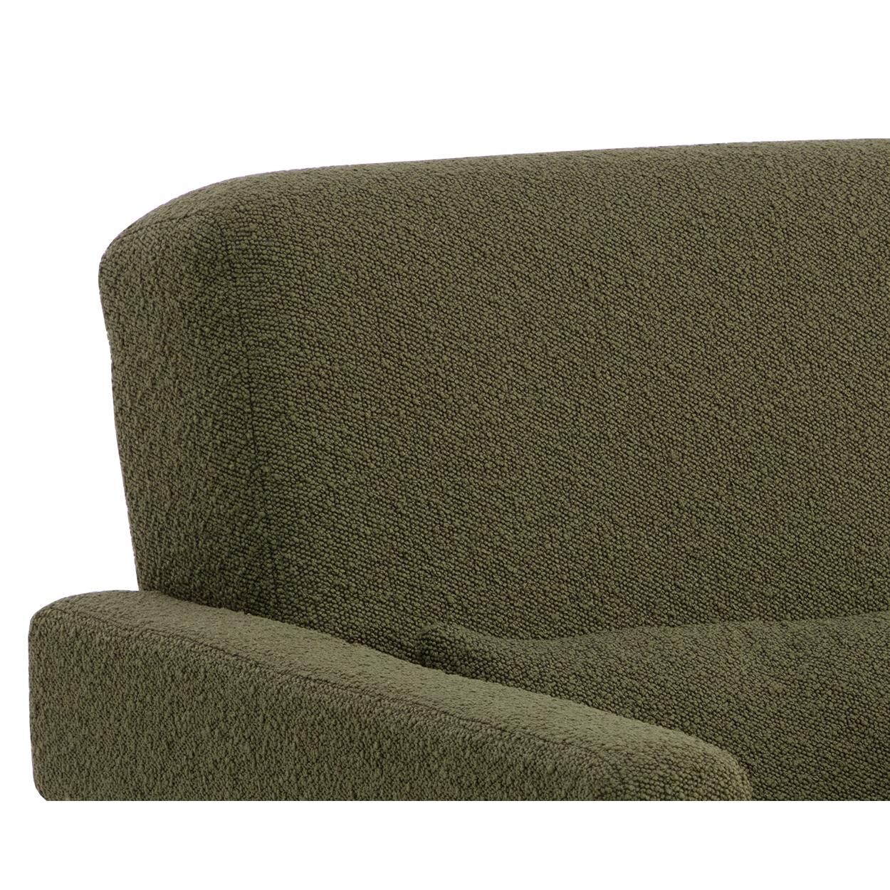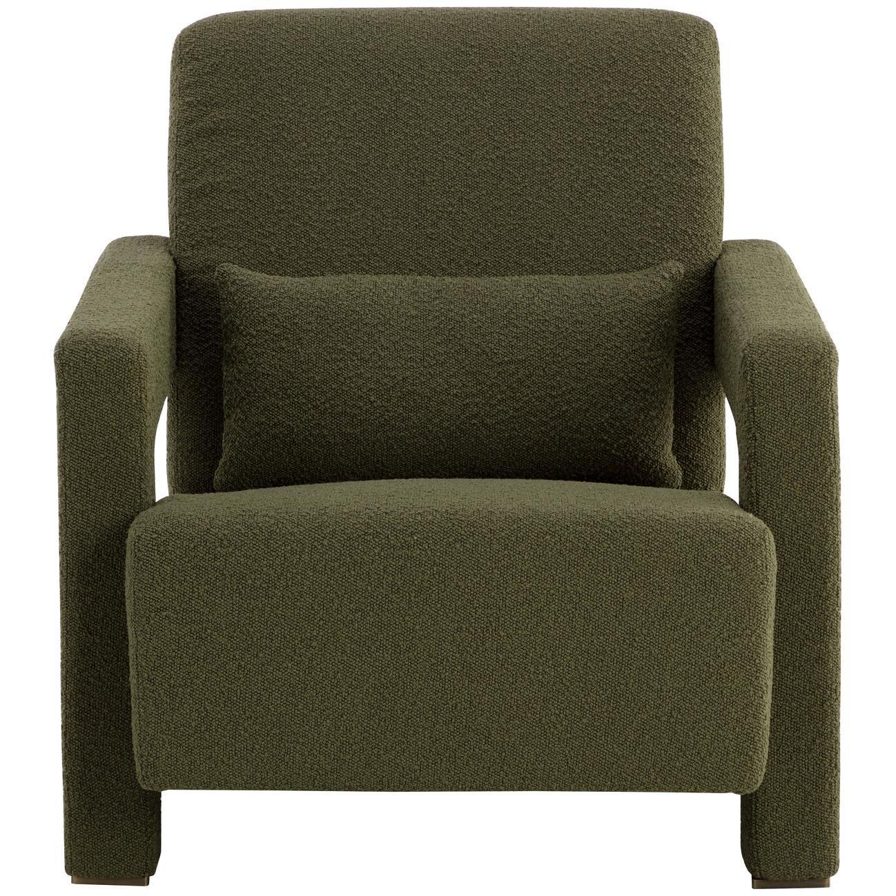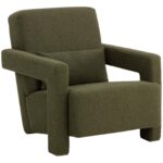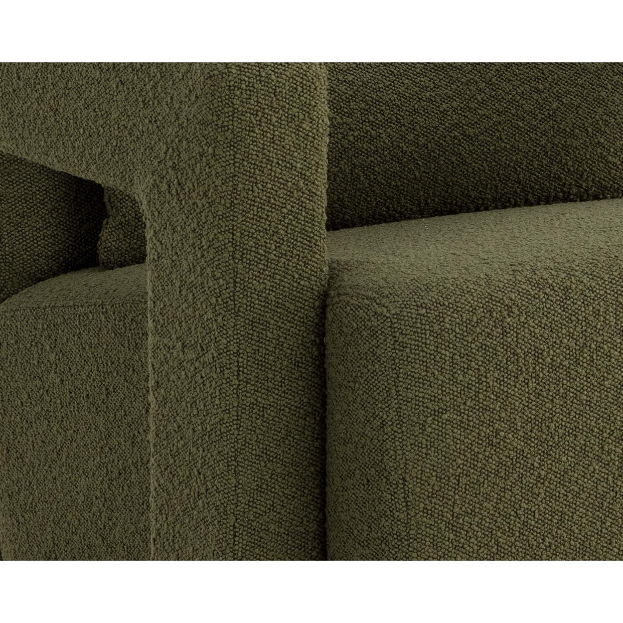 Strong angles and plush seating allow the Forester Lounge Chair to stand out in any living space. Upholstered in copenhagen olive fabric with sculpted arms that give the reclining seat a floating appearance. Metal accents at the back of the armrests match the powder coated antique gold stainless steel base to finish the look.